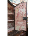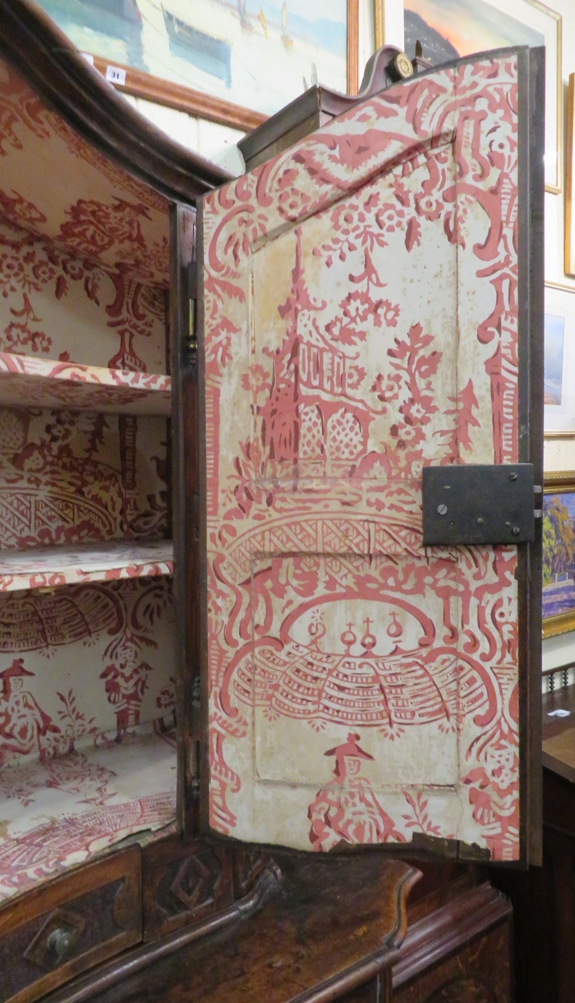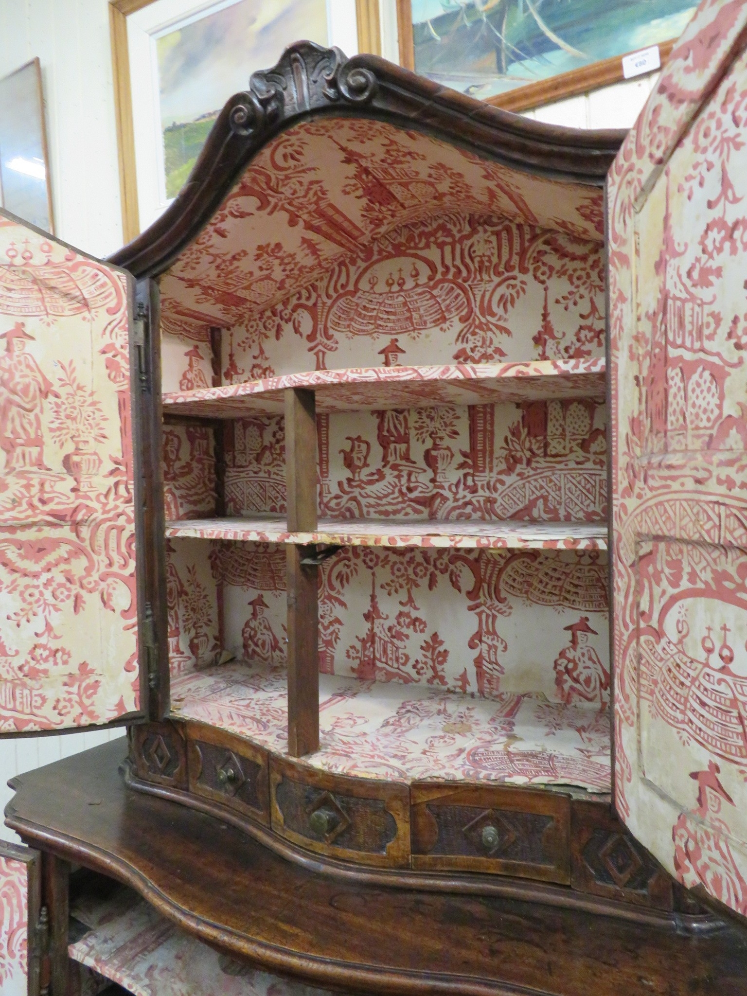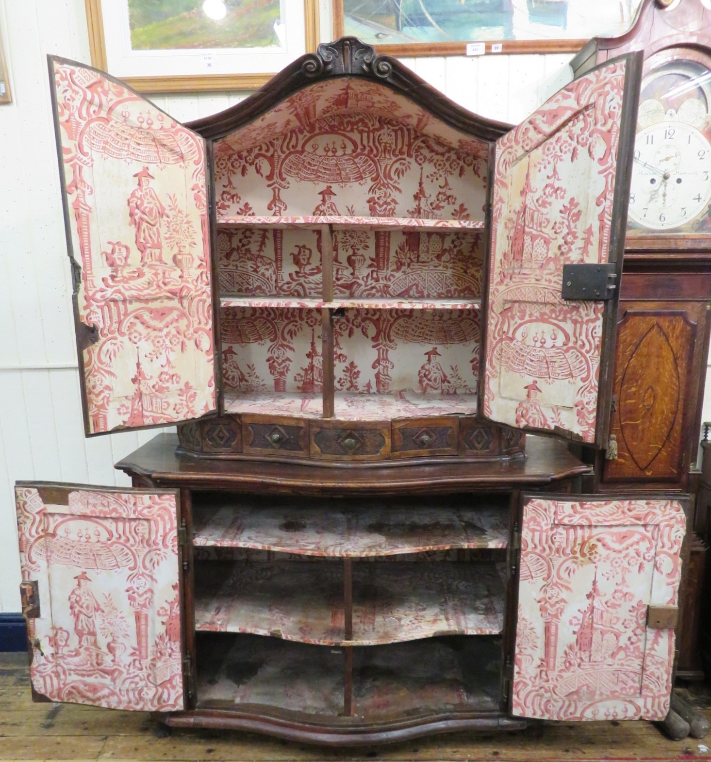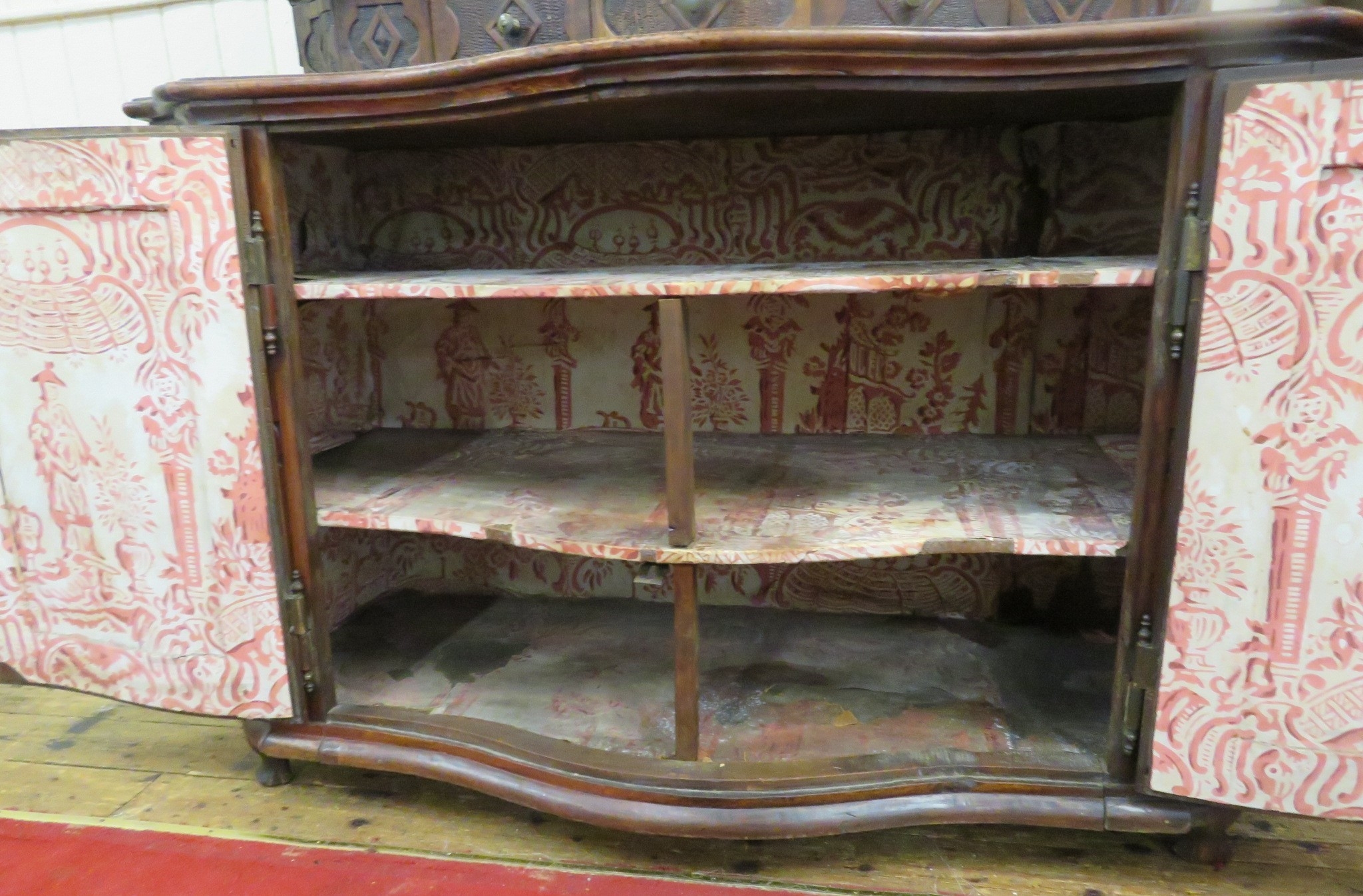 Victorian walnut chest on chest with domed top, scroll decoration, serpentine panelled doors, shelved interior with Chinoiserie wall paper