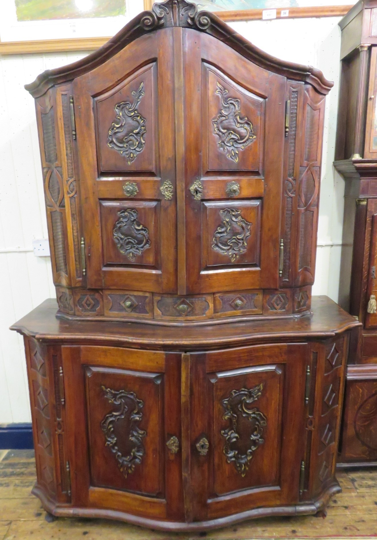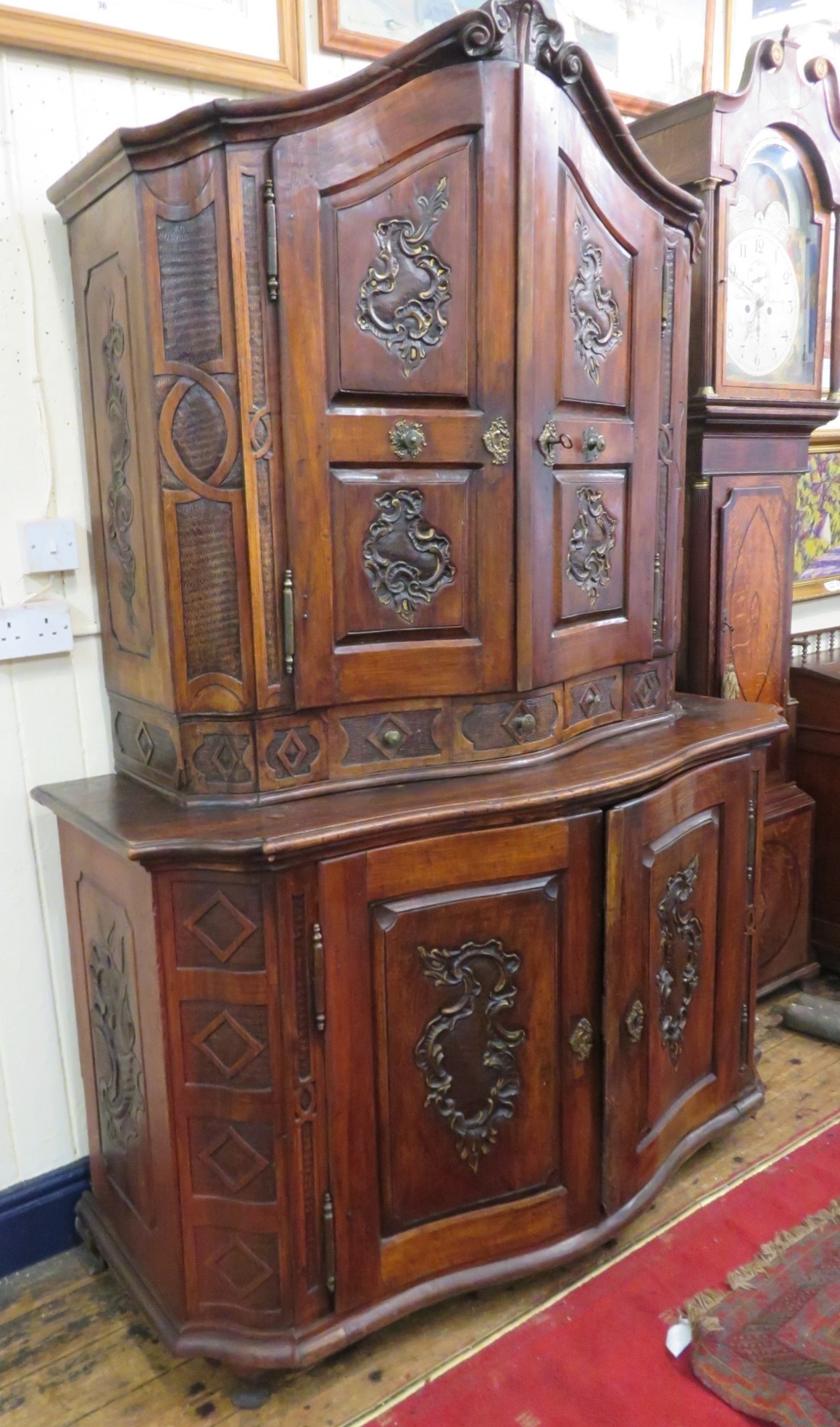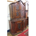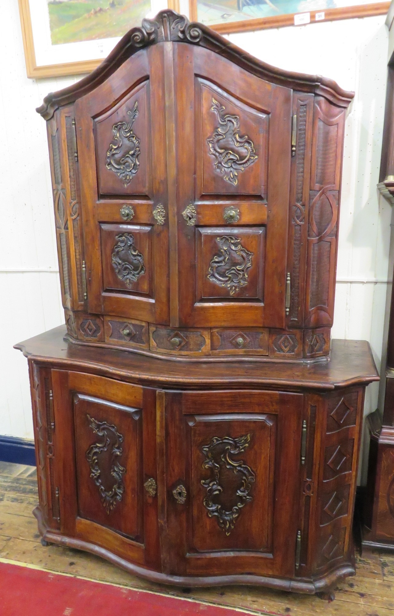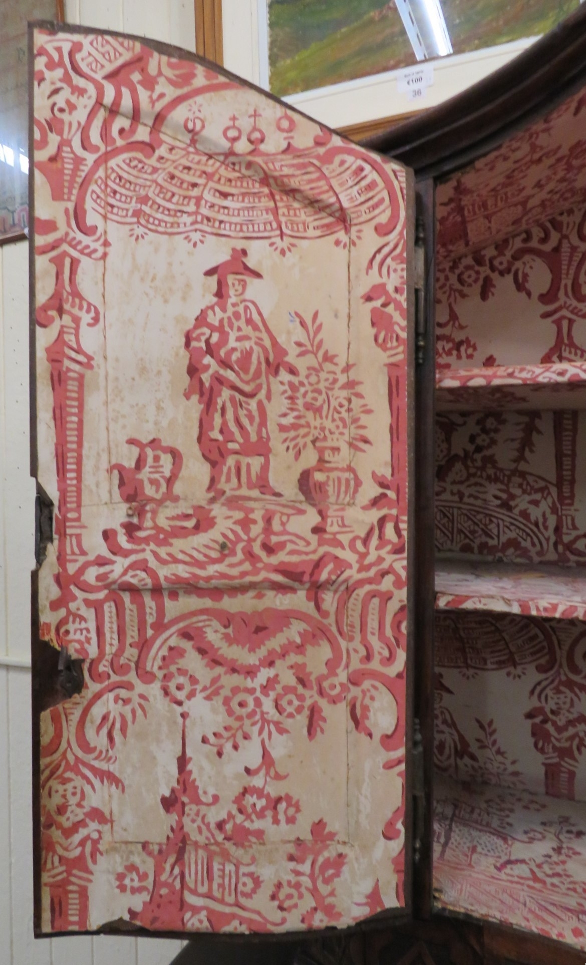 Victorian walnut chest on chest with domed top, scroll decoration, serpentine panelled doors, shelved interior with Chinoiserie wall paper