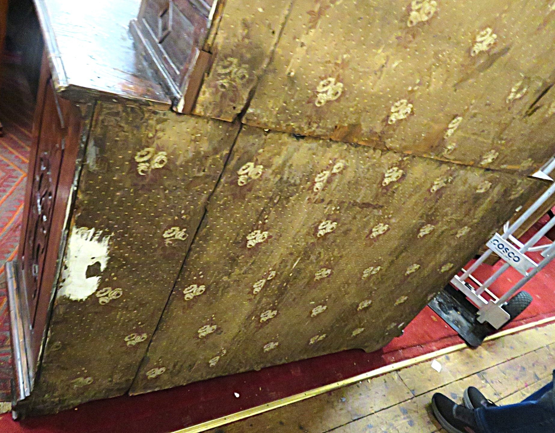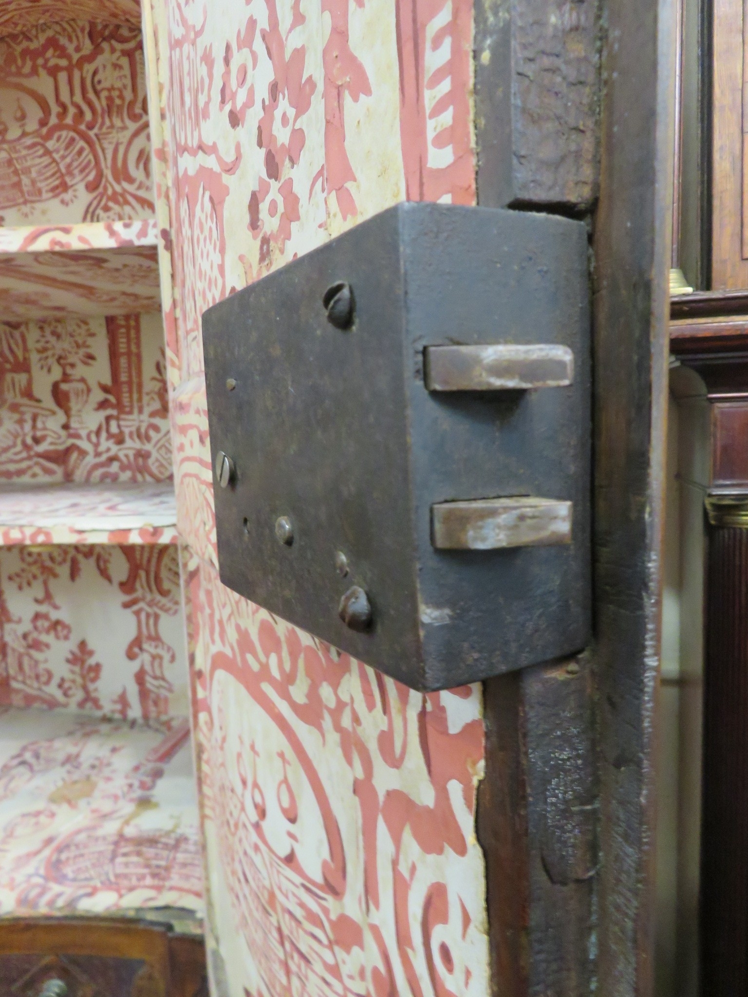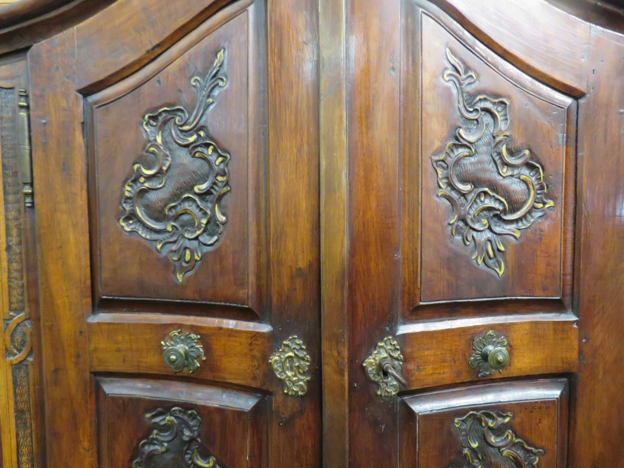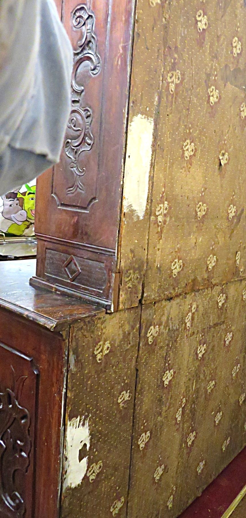 Victorian walnut chest on chest with domed top, scroll decoration, serpentine panelled doors, shelved interior with Chinoiserie wall paper