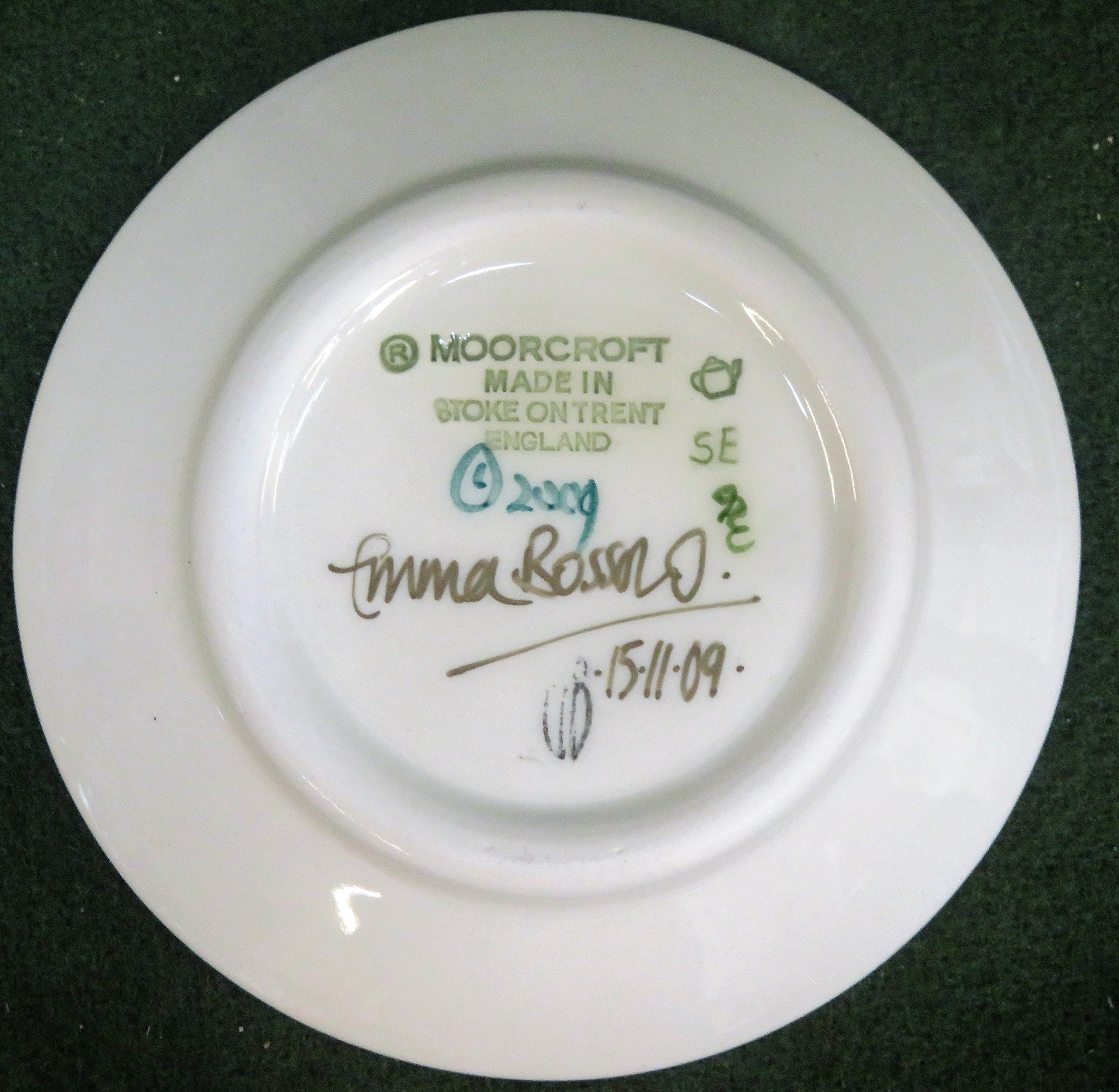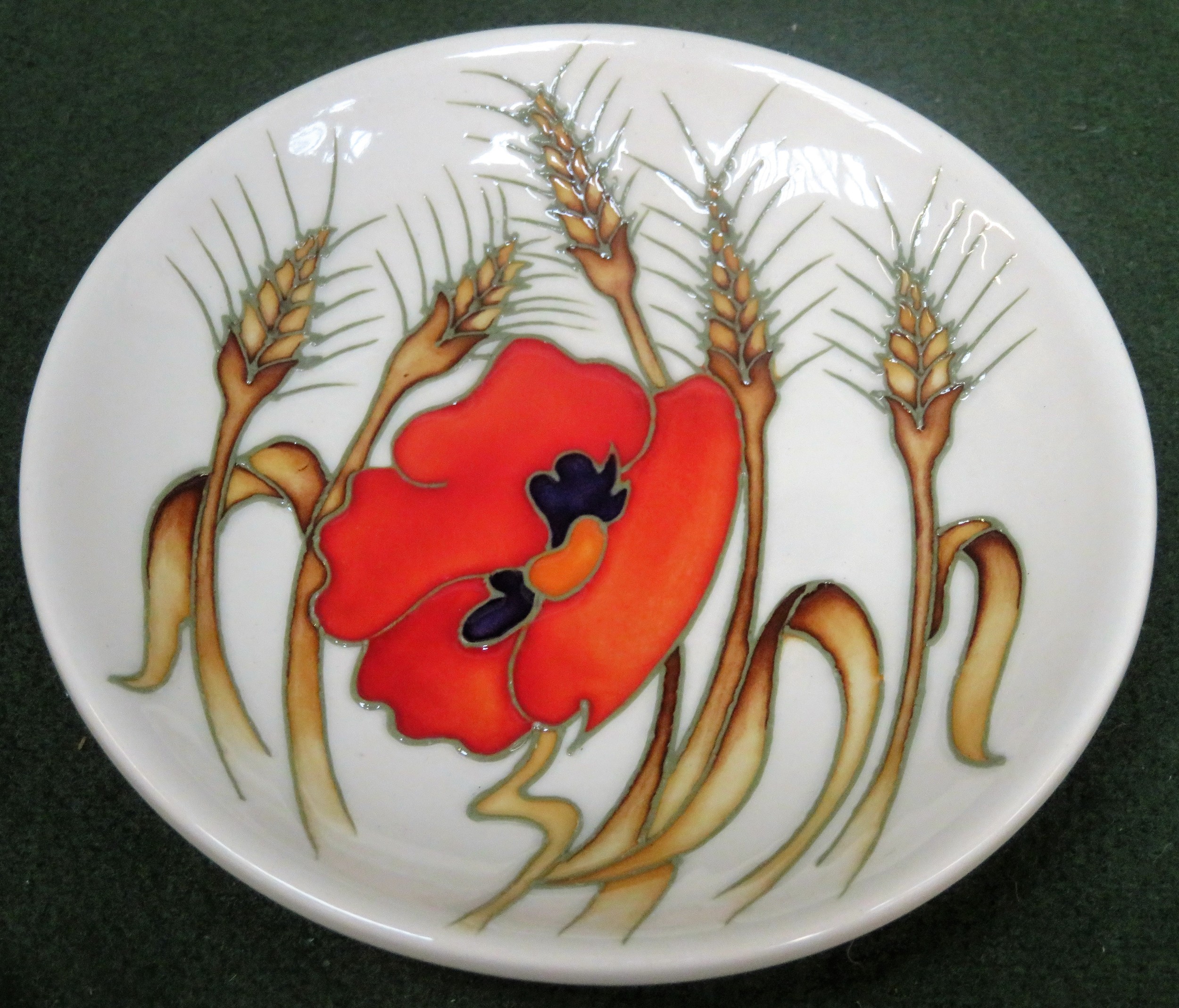 Moorcroft tube line and glazed ceramic 'Harvest Poppy' circular shallow bowl/receiver, signed to base by Emma Bossons and dated 15.11.09. Approx. 12cms D