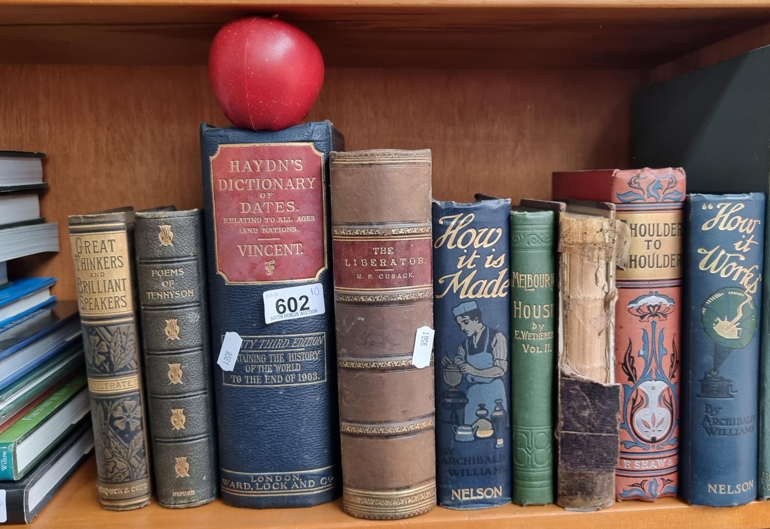 A selection of ten vintage books including The Liberator and Haydn's dictionary of dates and a leather bound version of Poems by Tennyson.