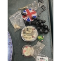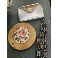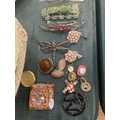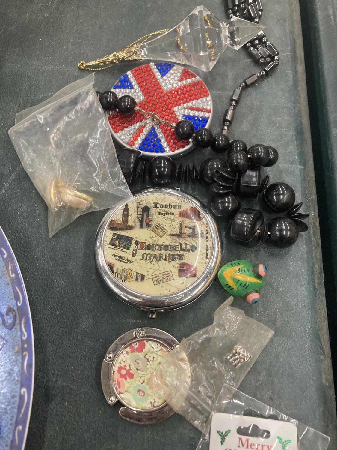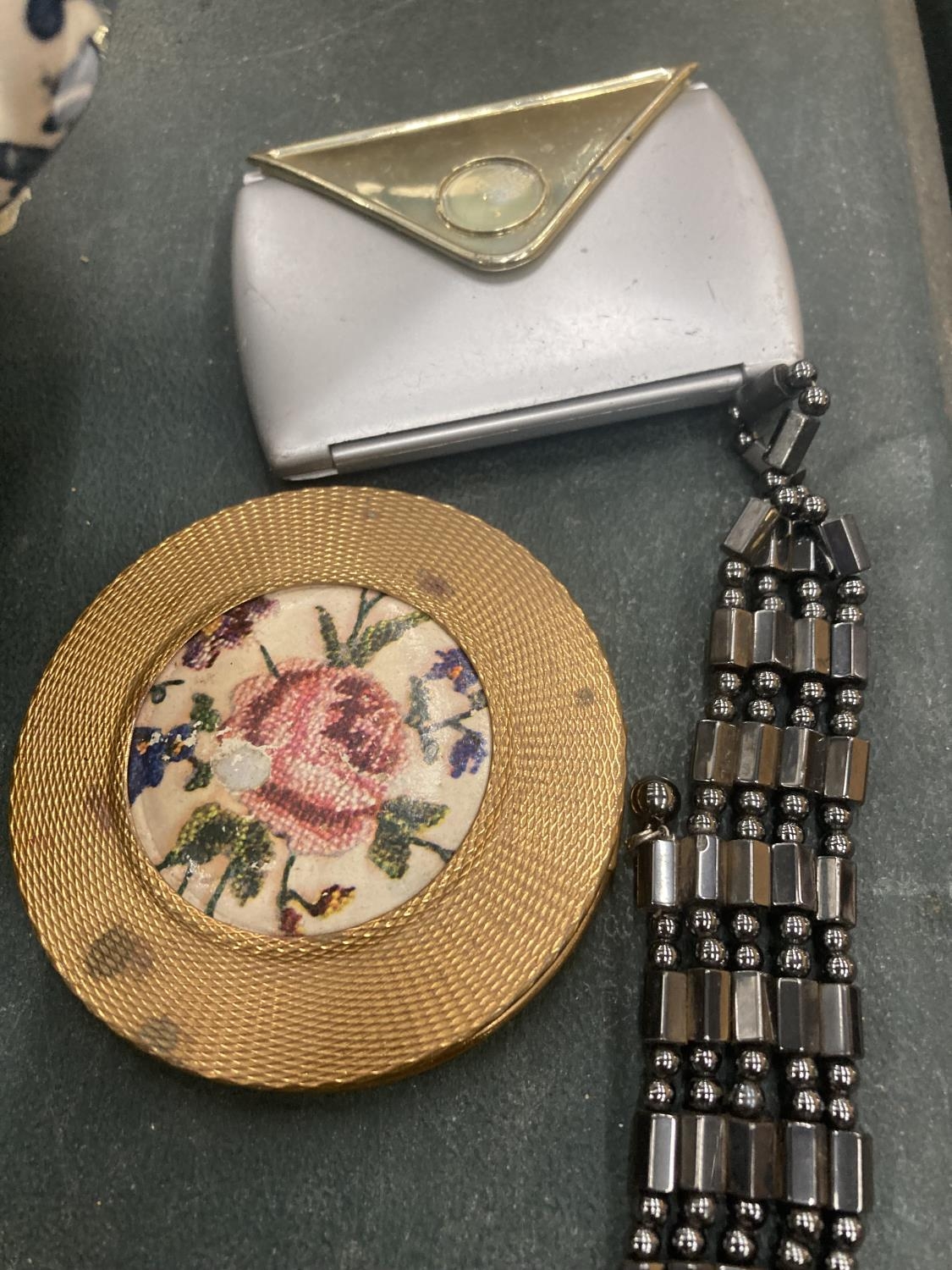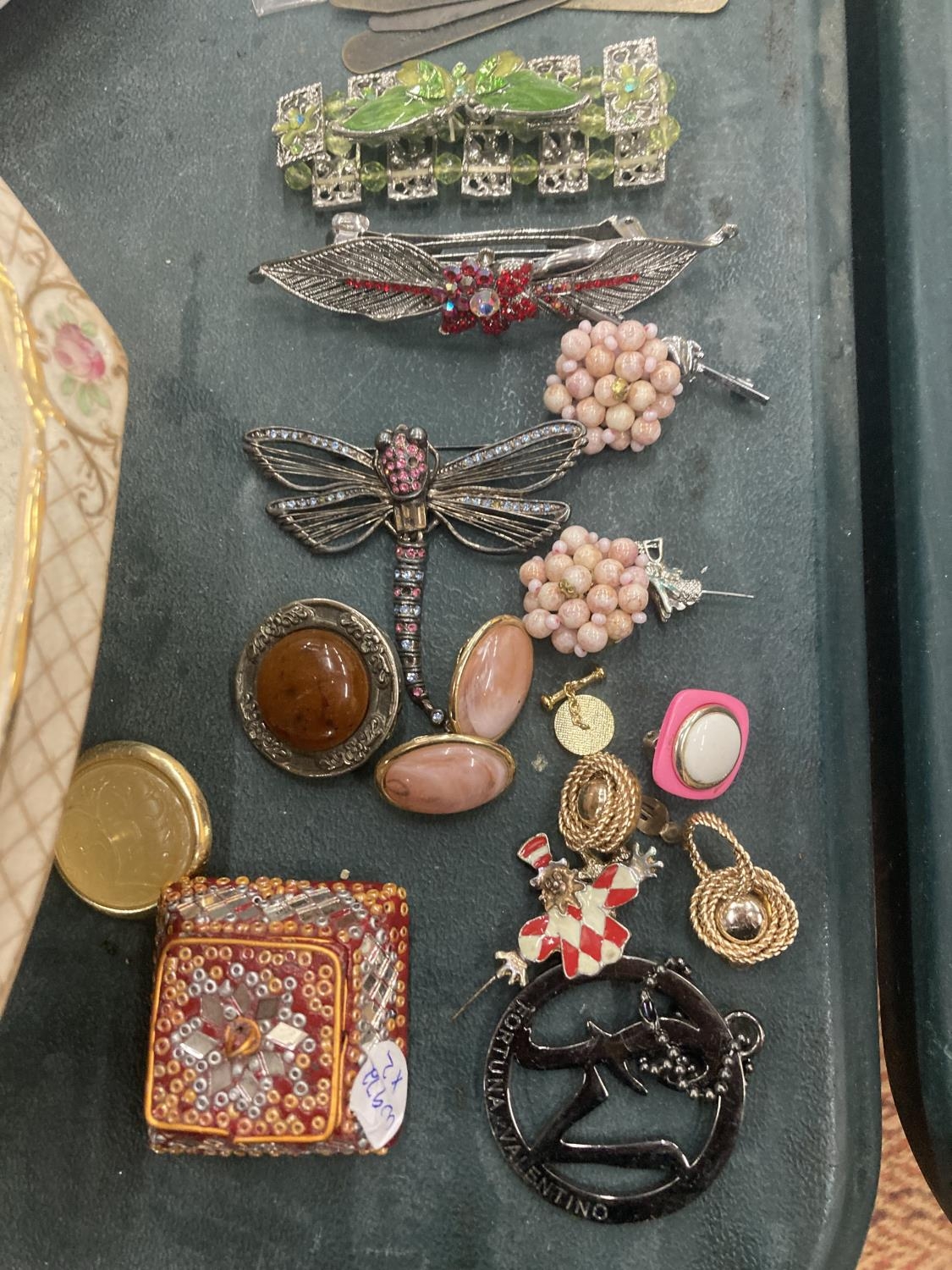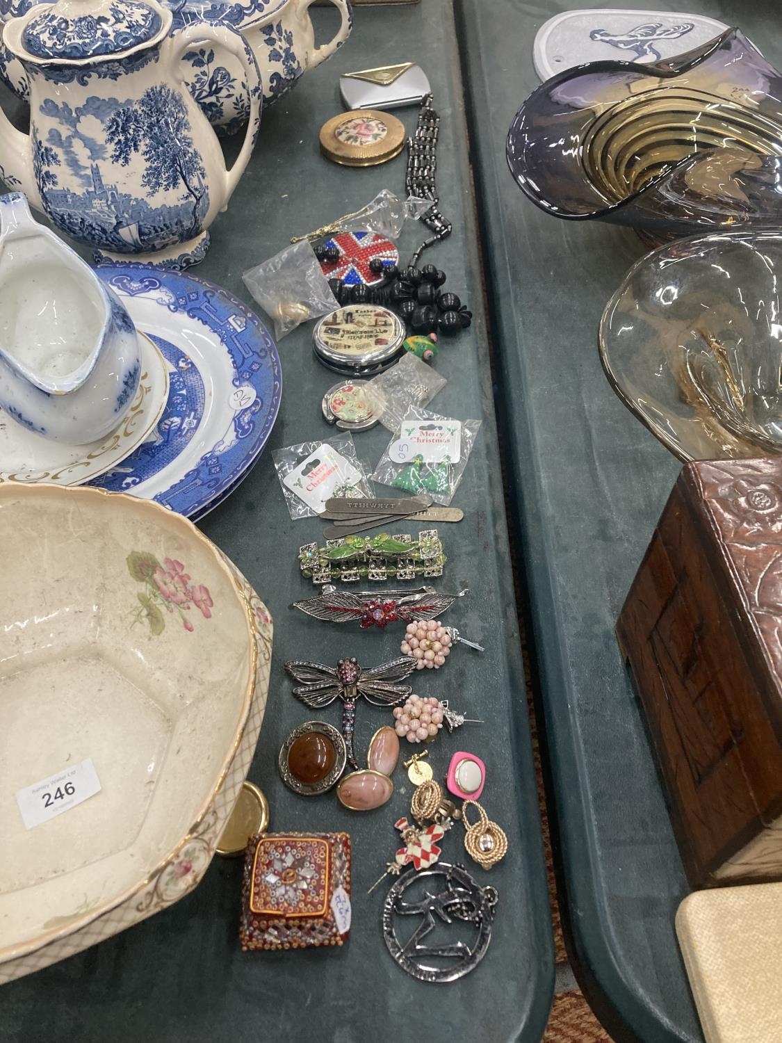 A QUANTITY OF COSTUME JEWELLERY TO INCLUDE BROOCHES, EARRINGS, ETC PLUS COMPACTS, ETC