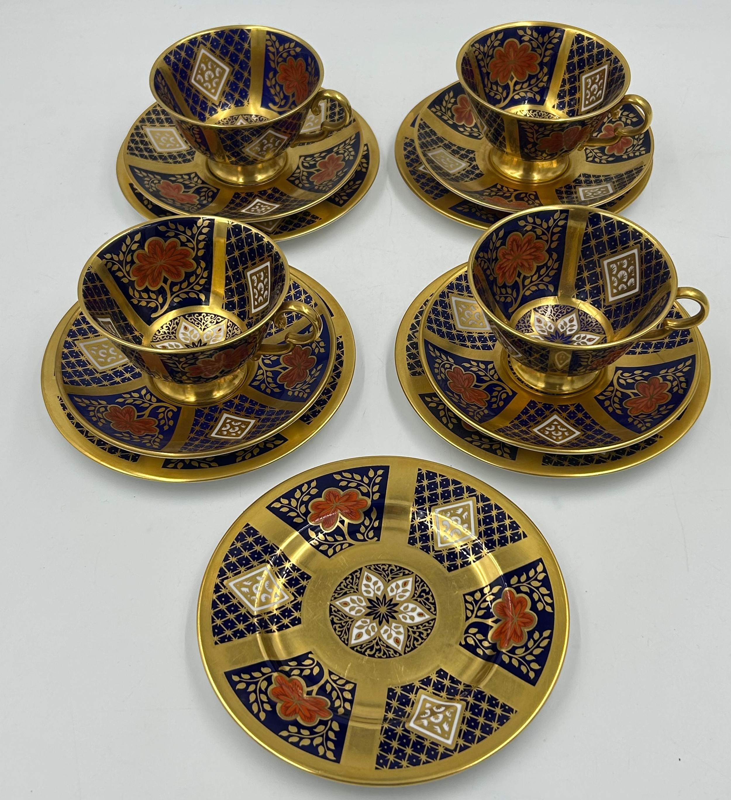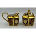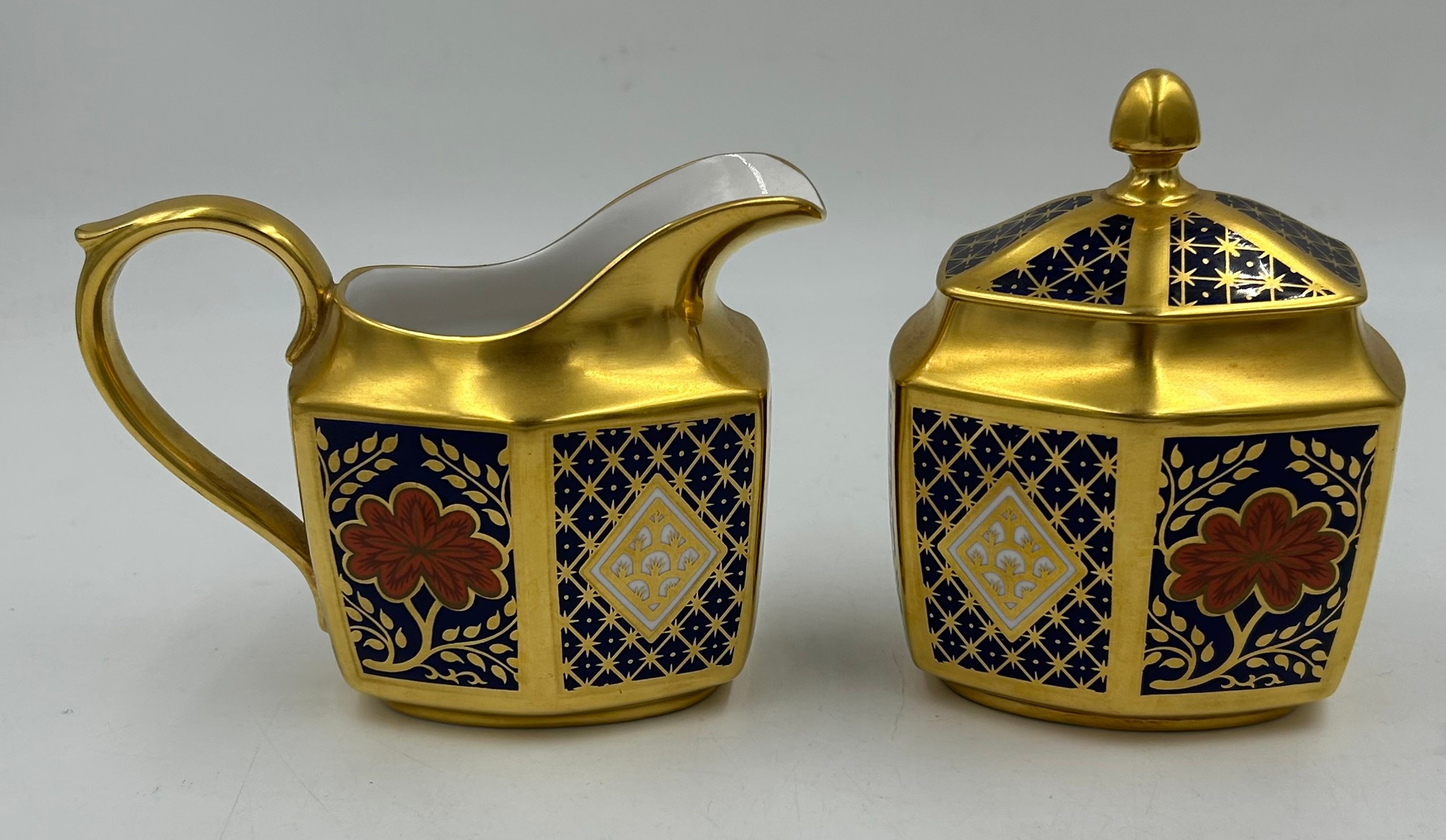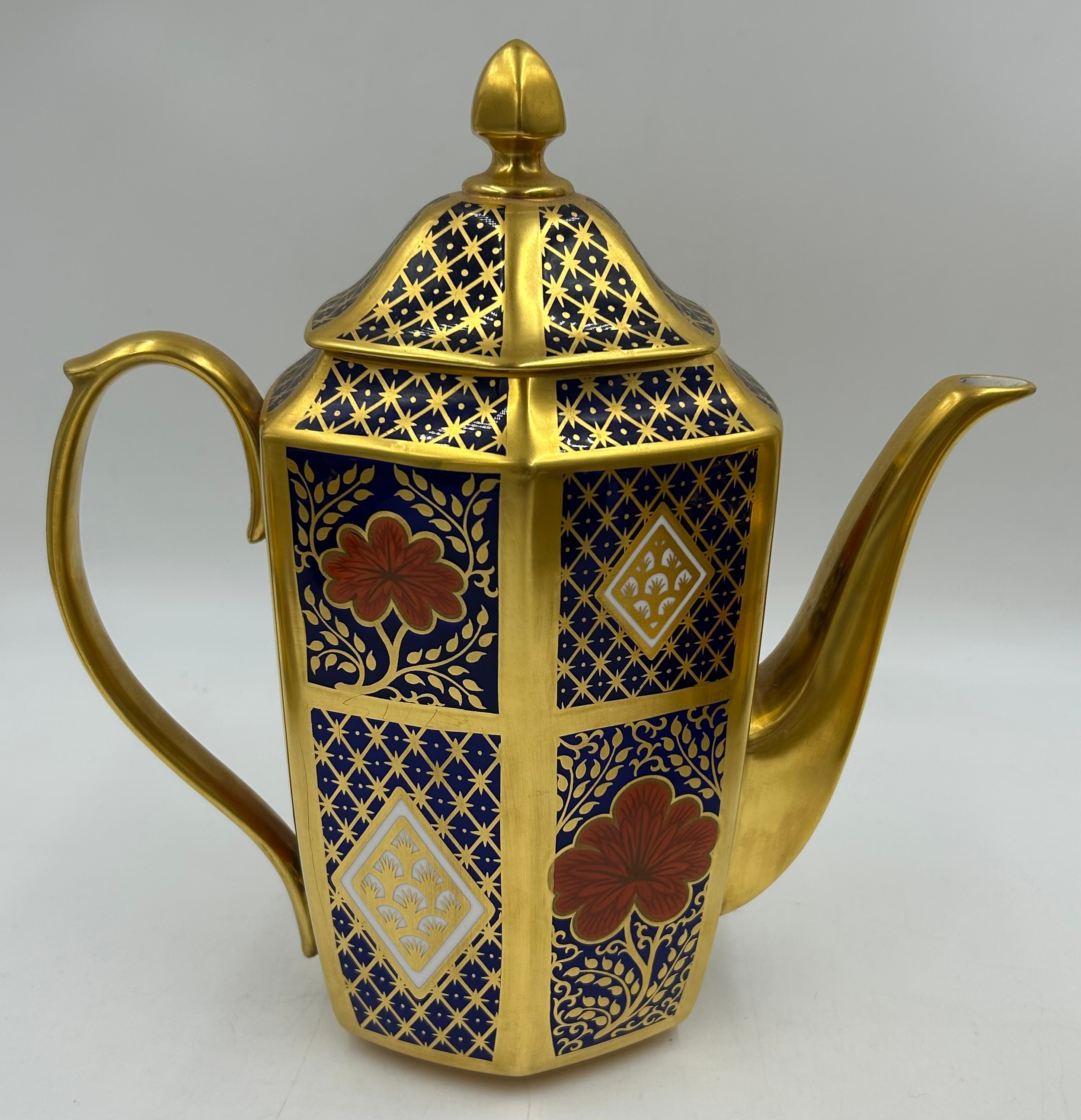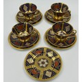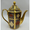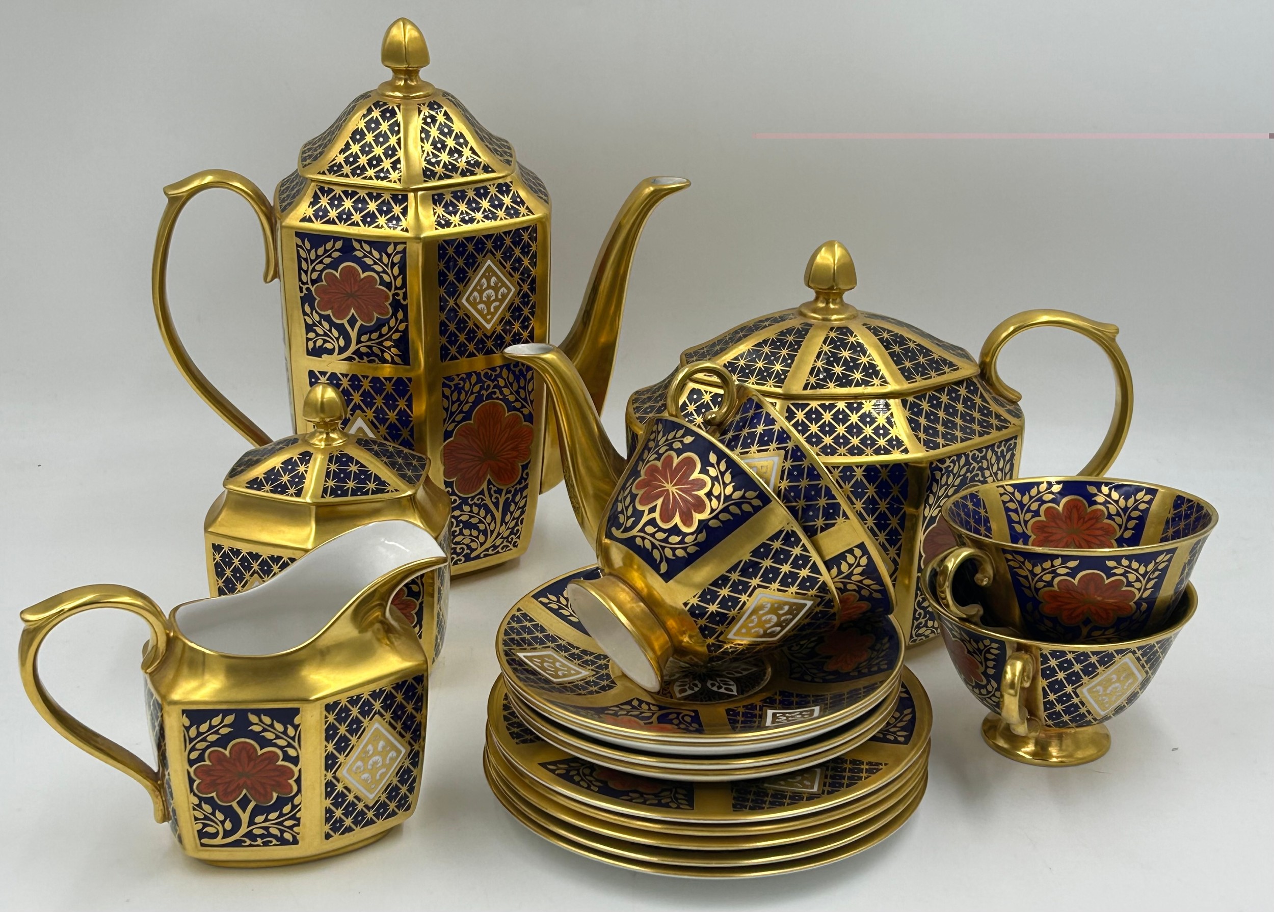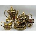Caverswall Imari part tea and coffee service in the Romany pattern comprising tea pot 24ct gold painted by A.H, coffee pot, 25cm h 22ct by A.H, 5 x small plates 16cm , 4 x saucers, lidded sugar, jug all with various initials and 4 x cups.