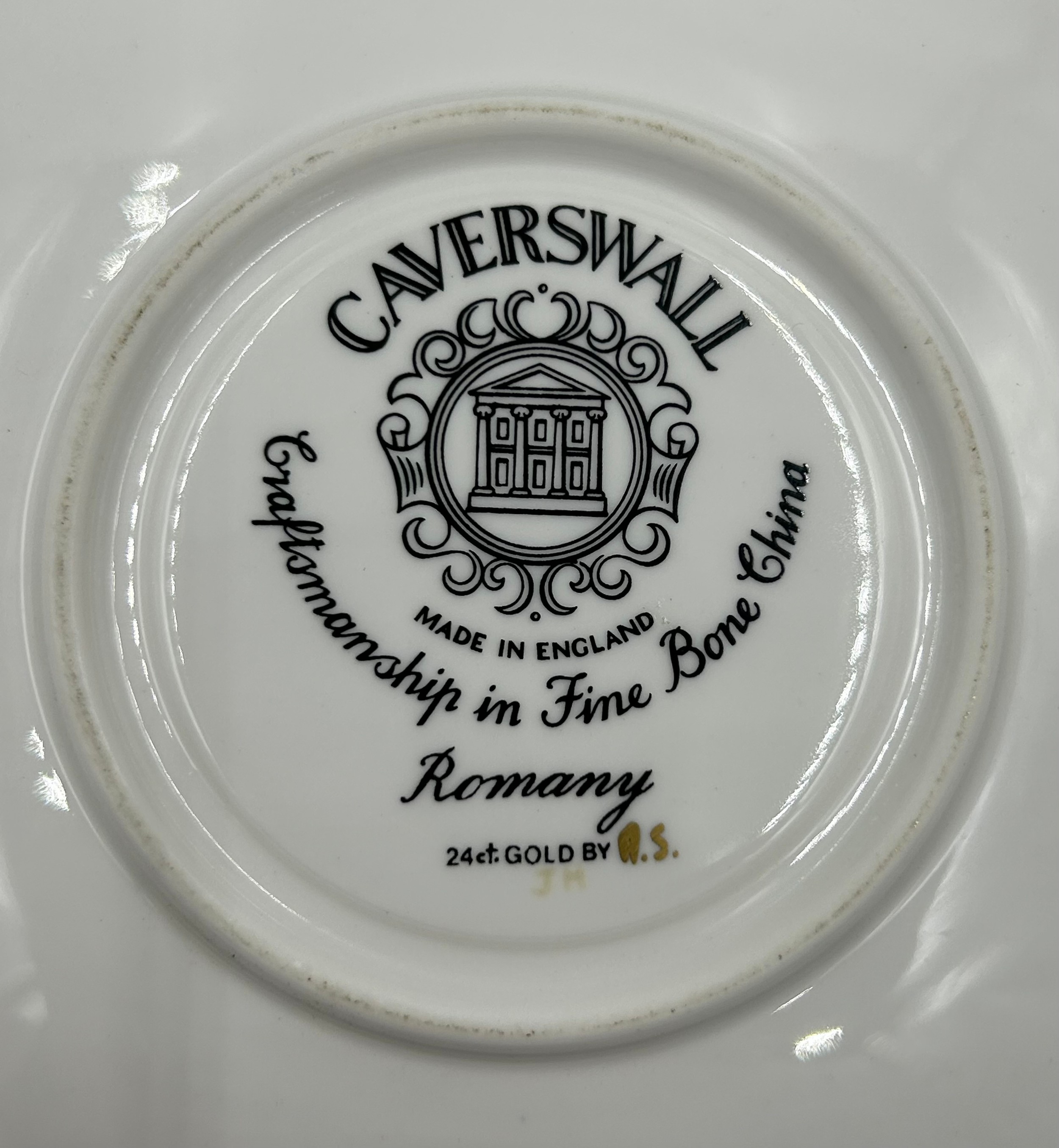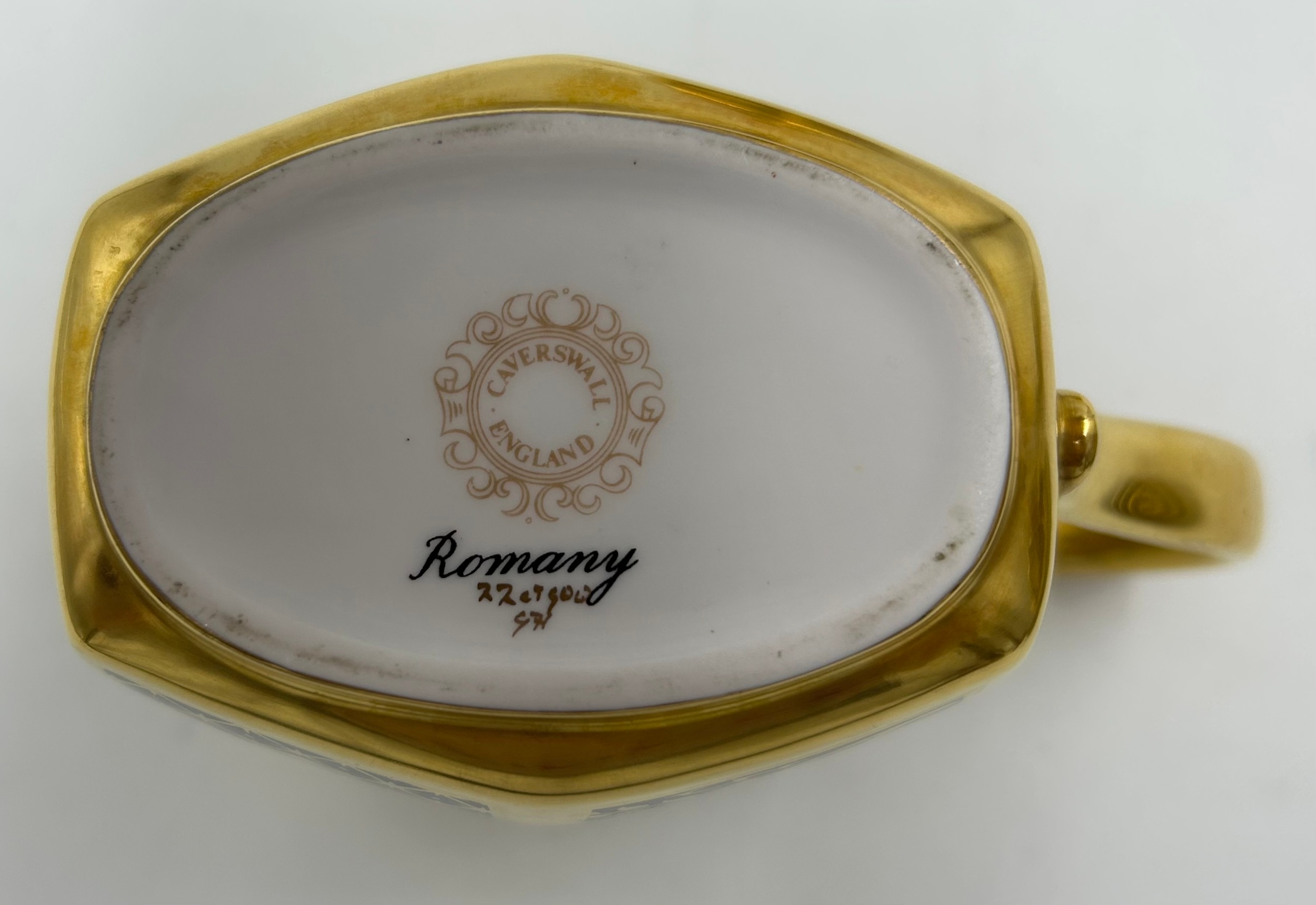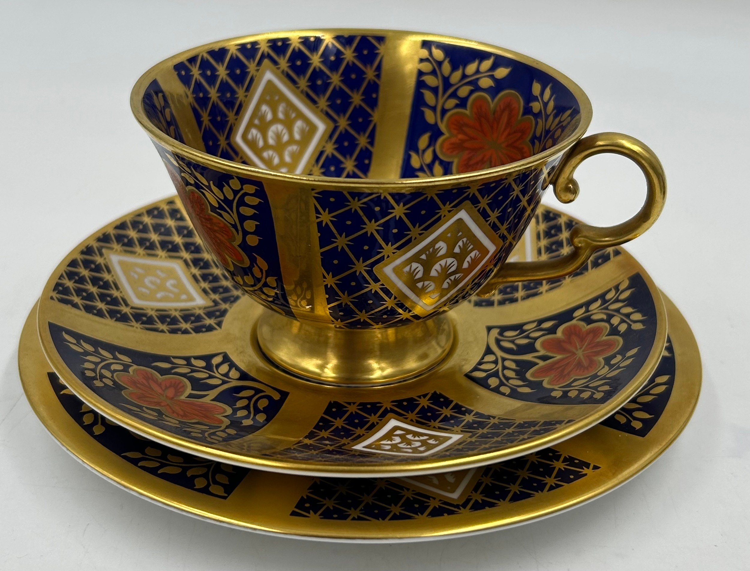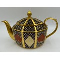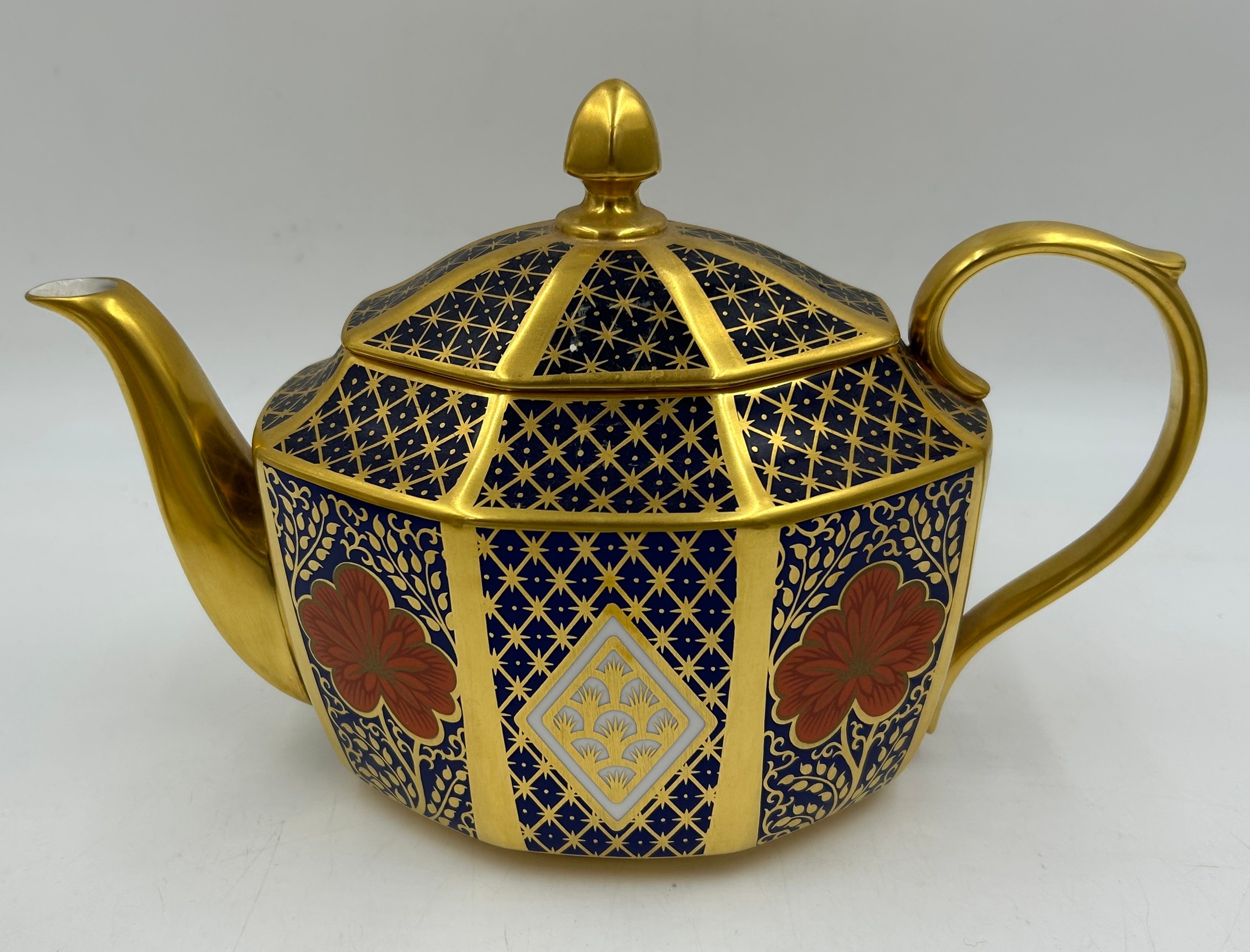 Caverswall Imari part tea and coffee service in the Romany pattern comprising tea pot 24ct gold painted by A.H, coffee pot, 25cm h 22ct by A.H, 5 x small plates 16cm , 4 x saucers, lidded sugar, jug all with various initials and 4 x cups.