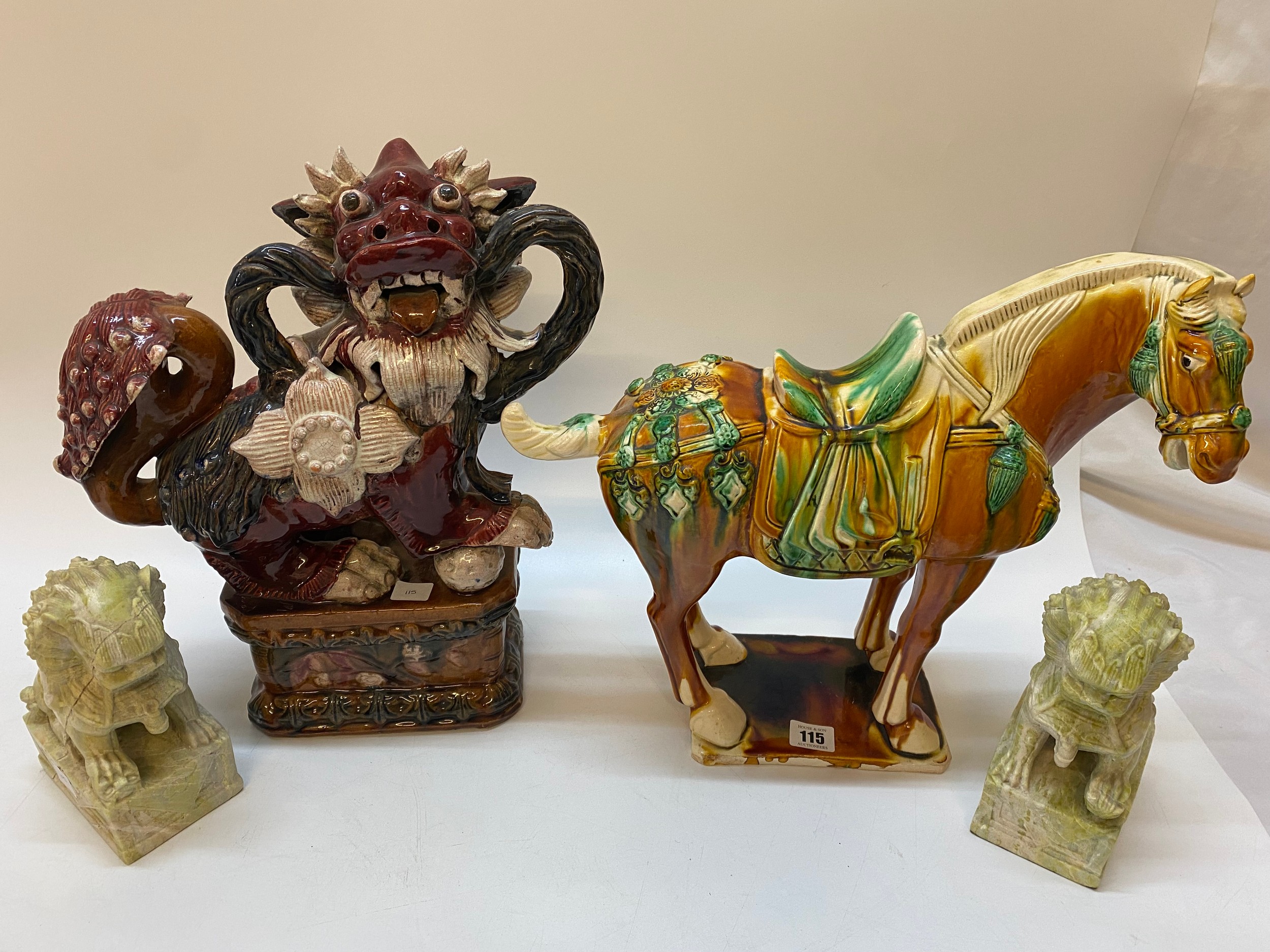 A large pottery model of a Tang style horse - 18in. high, a pair of Chinese soapstone models of Dogs Of Fo - 8in. high and a pottery model of a Dog Of Fo - 18in. high