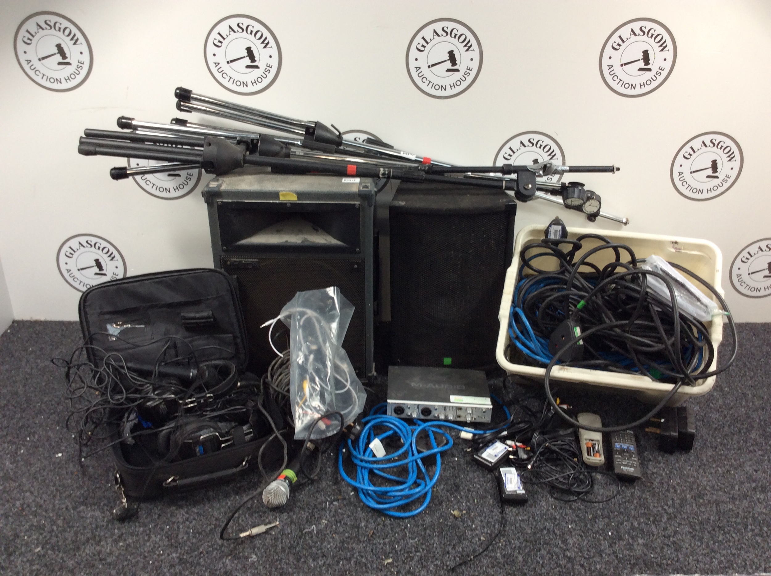 Two Speakers, A Box Of Cables & Misc Sound Equipment - Used