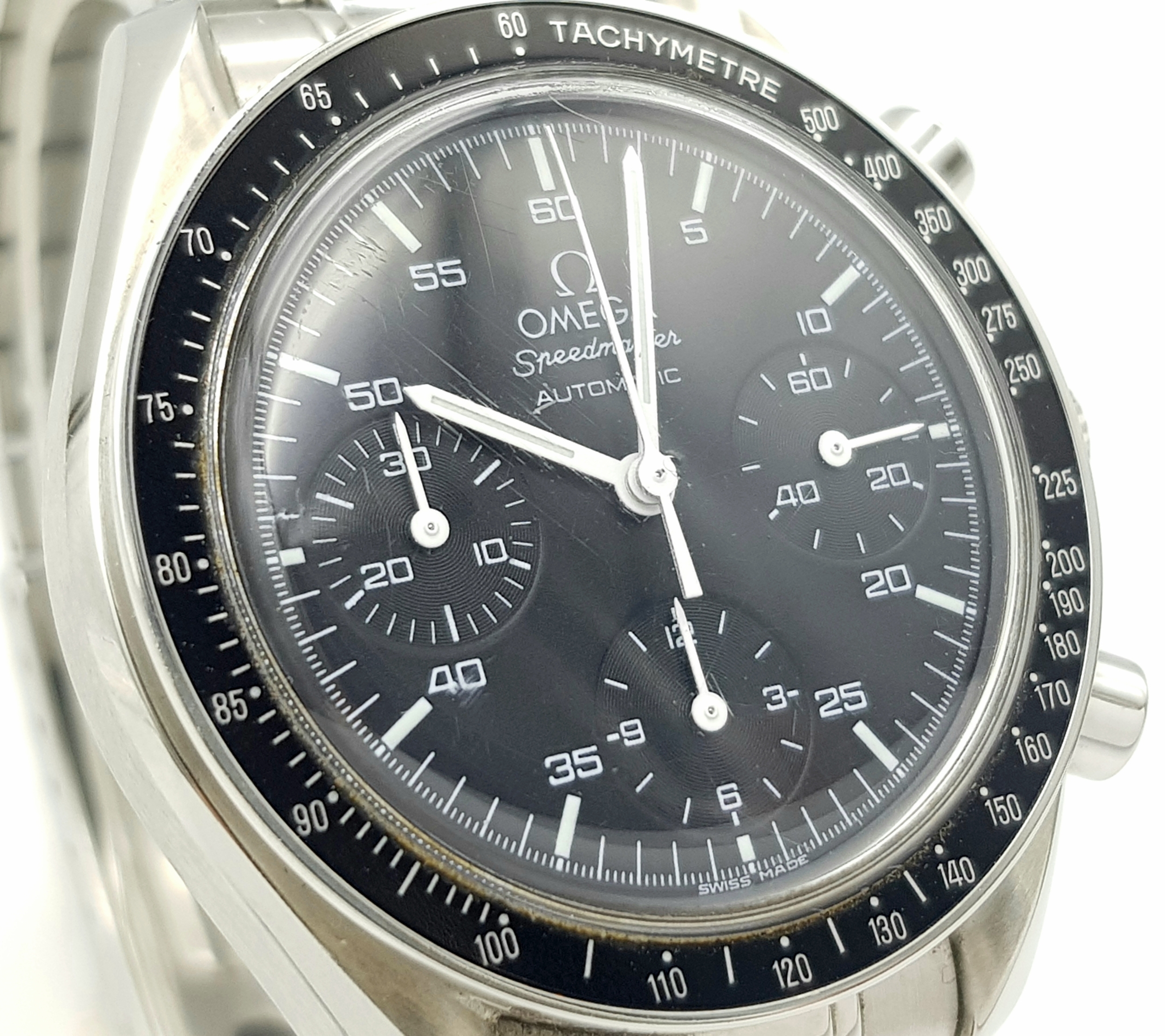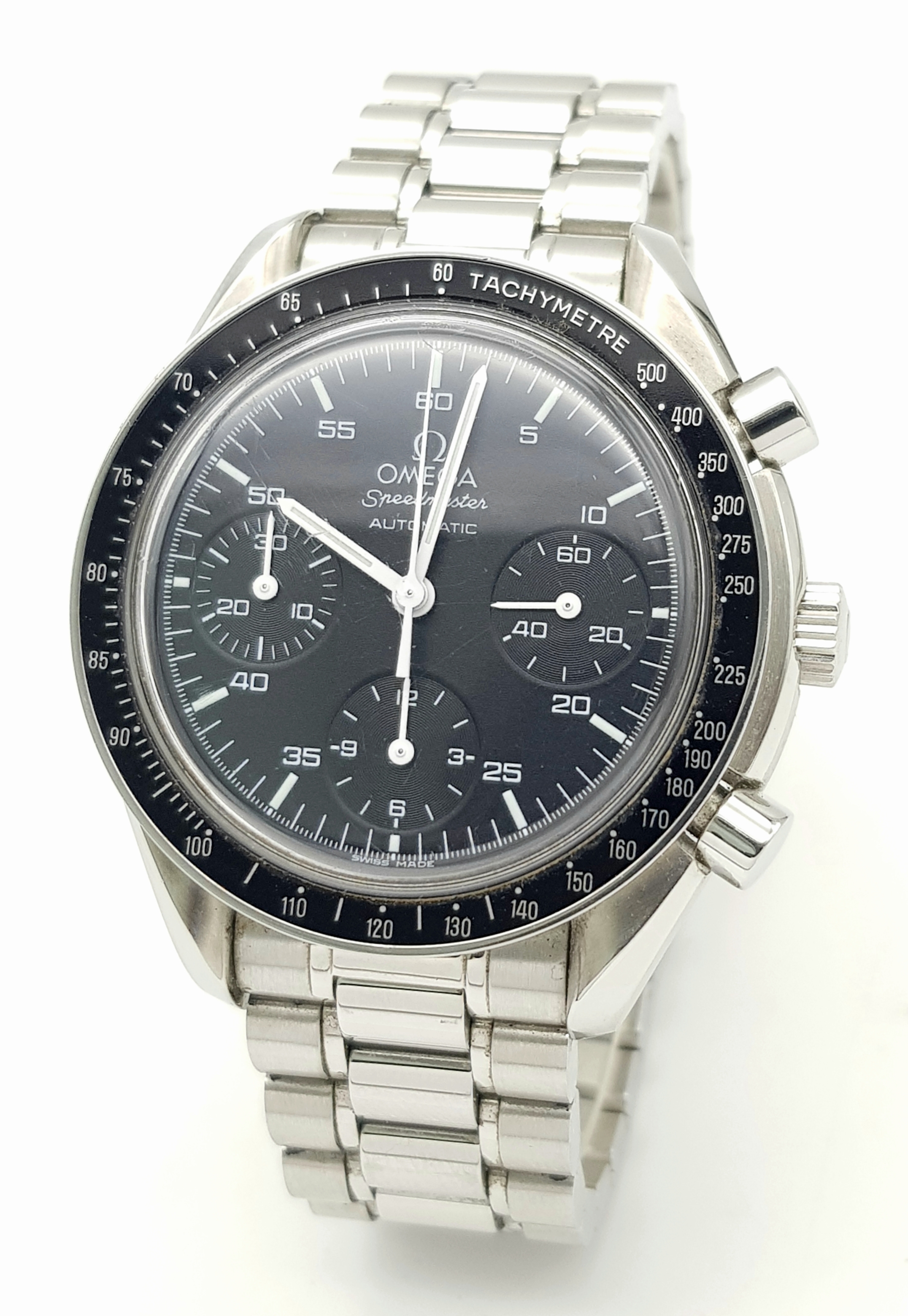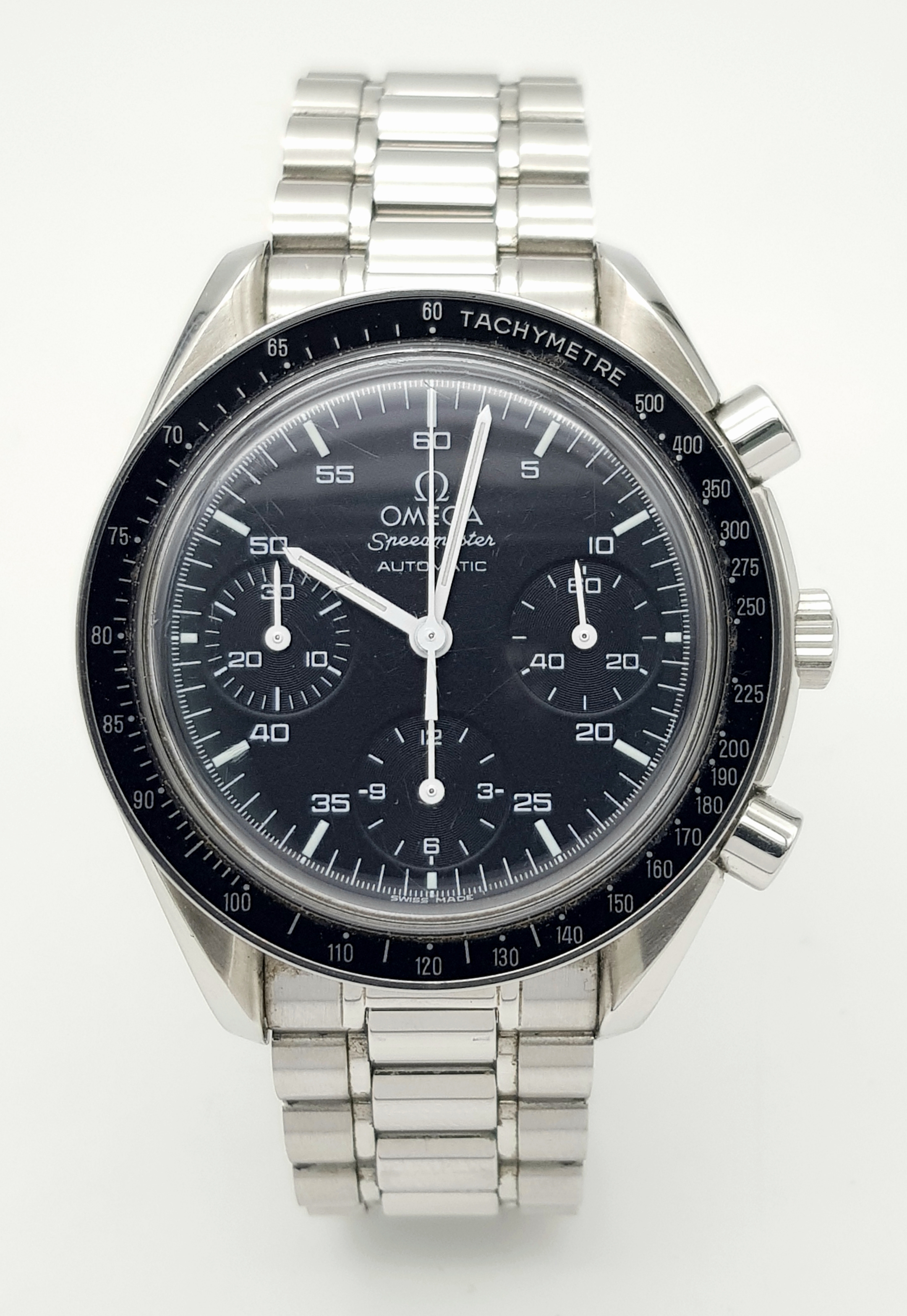 An Omega Speedmaster Automatic Chronograph Gents Watch. Stainless steel bracelet and case - 39mm. Black dial with three sub dials. In good condition and working order.