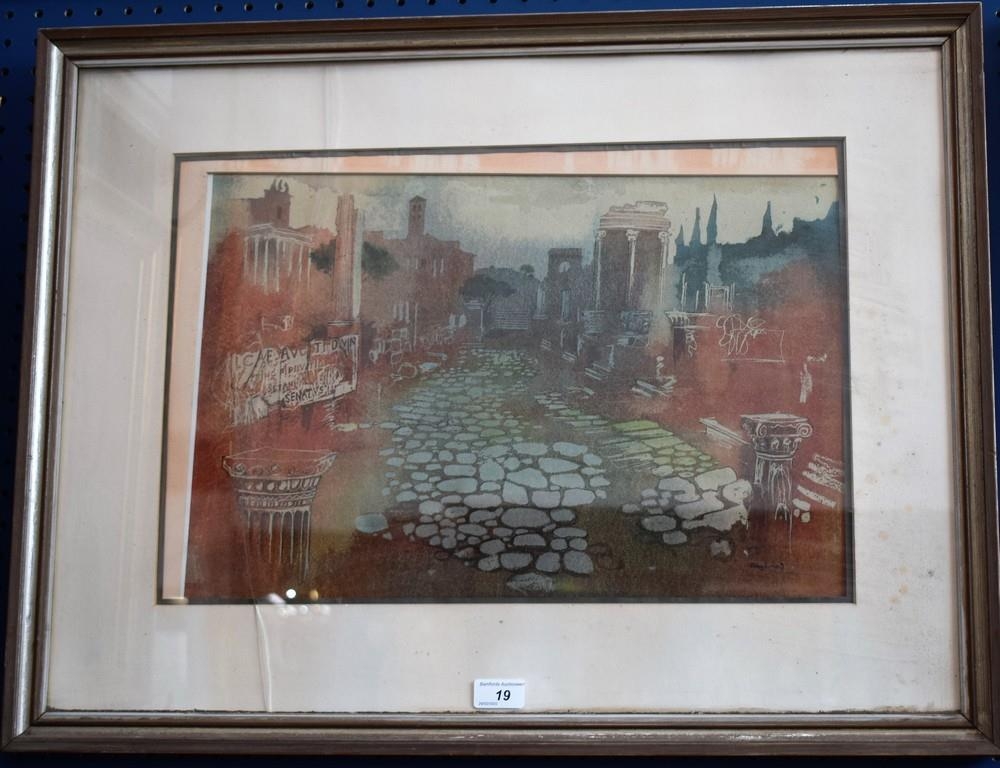 Ray Evans (Bn. 1920) Foro Romano signed, label to verso, watercolour, 34.5cm x 52cm