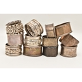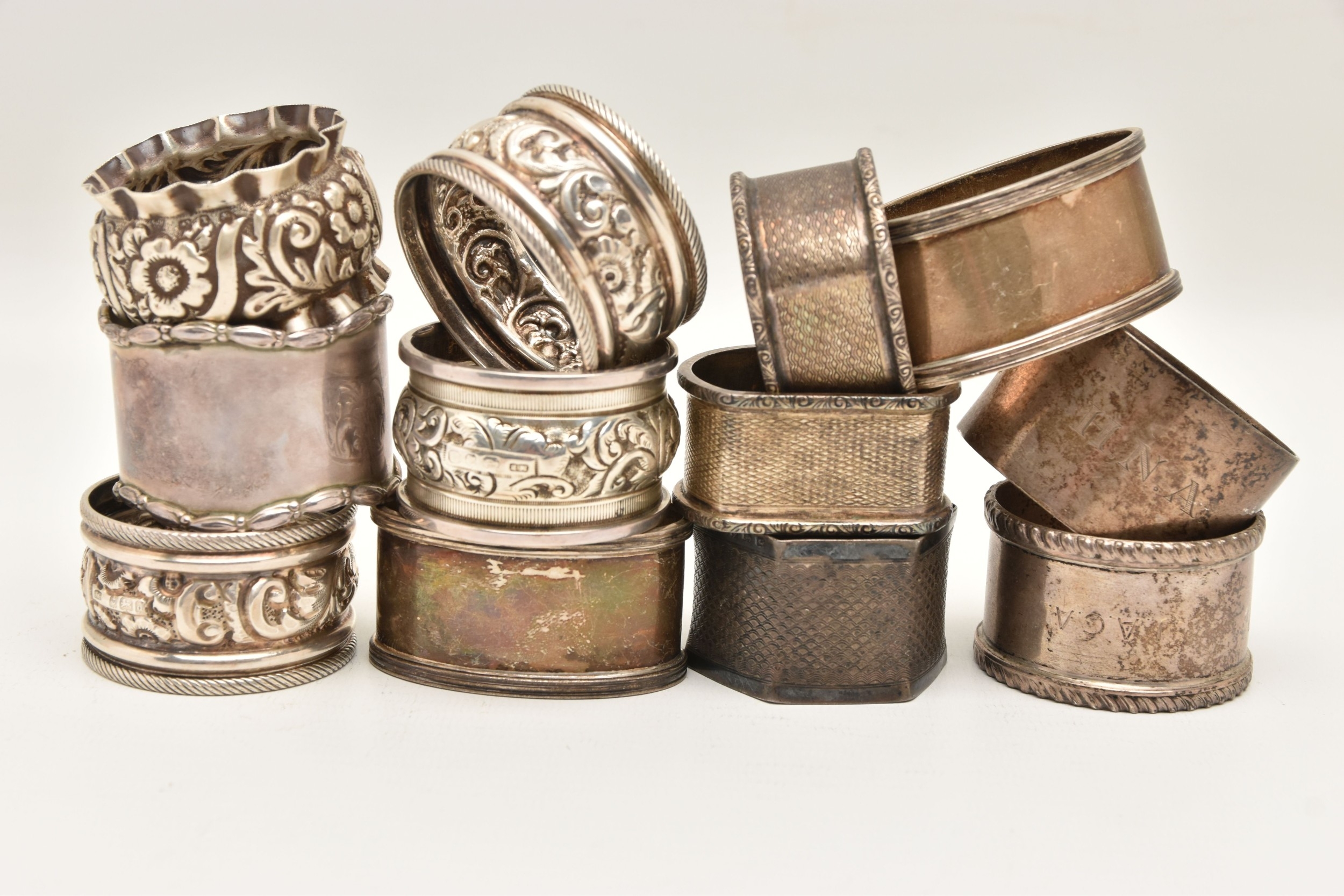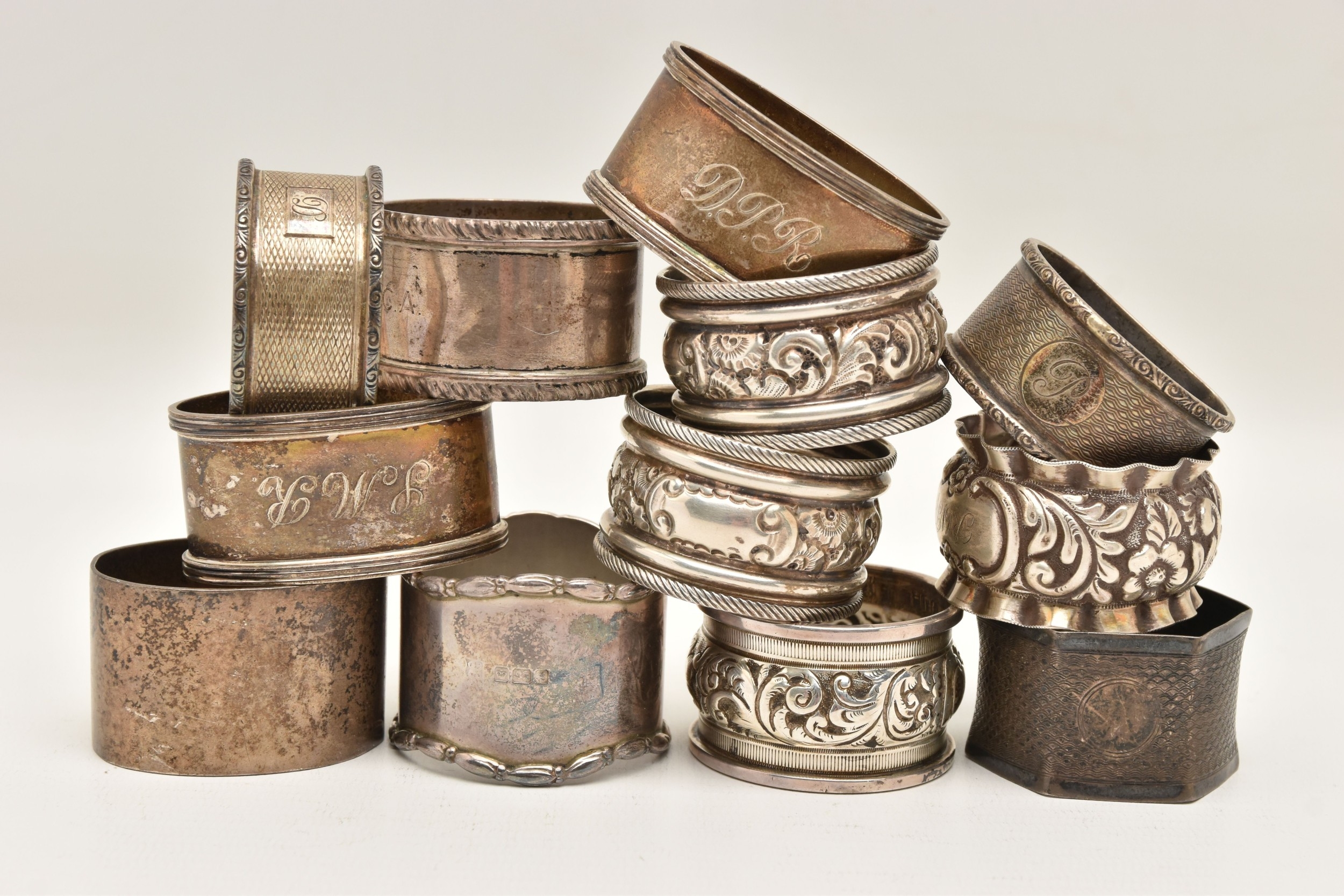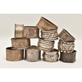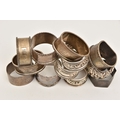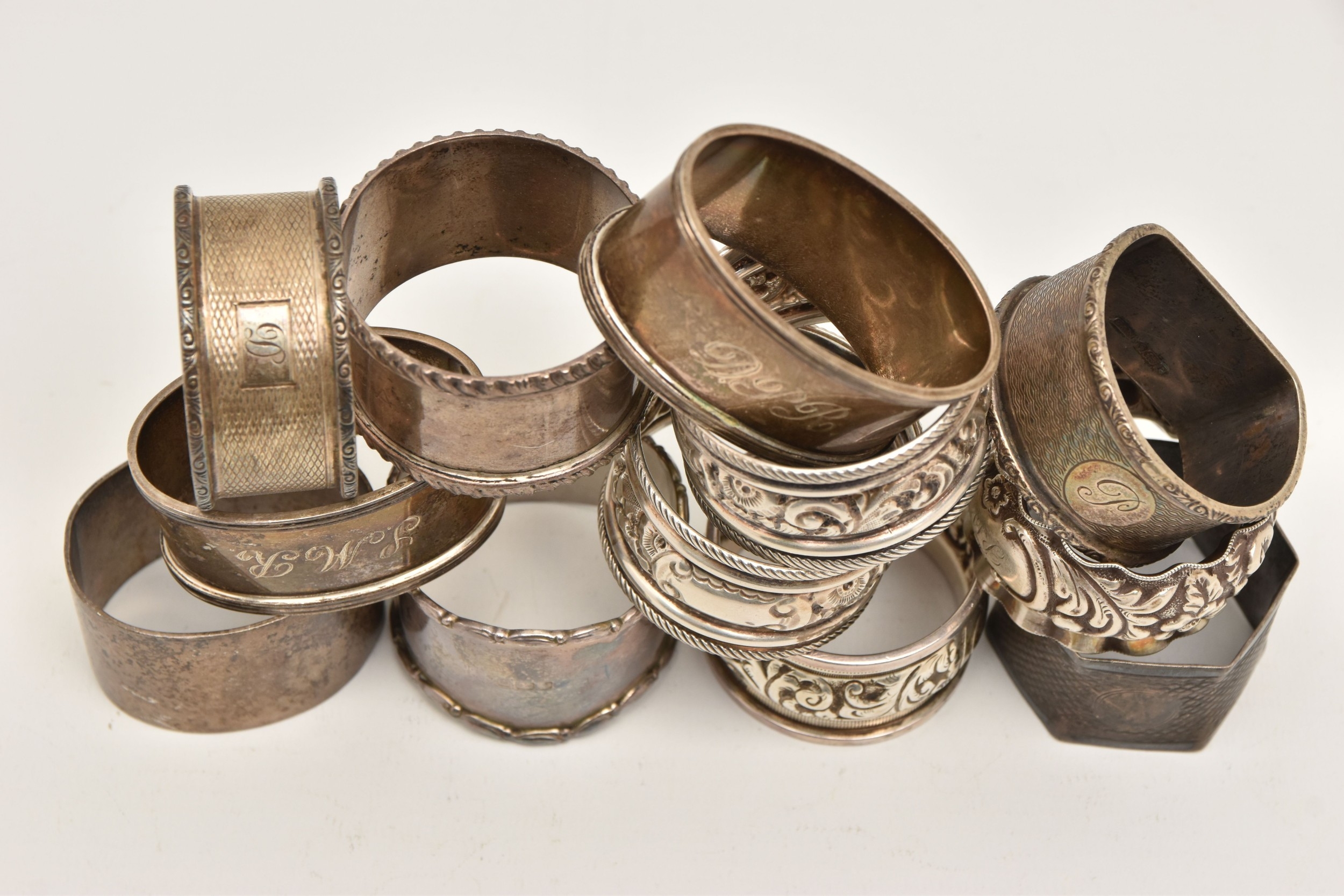 A SELECTION OF SILVER NAPKIN RINGS, of various designs and shapes, some with engraved cartouches some vacant, approximate gross weight 374.8 grams, 12.05 ozt (condition report: moderate tarnishing to all, would benefit from a gentle clean)