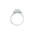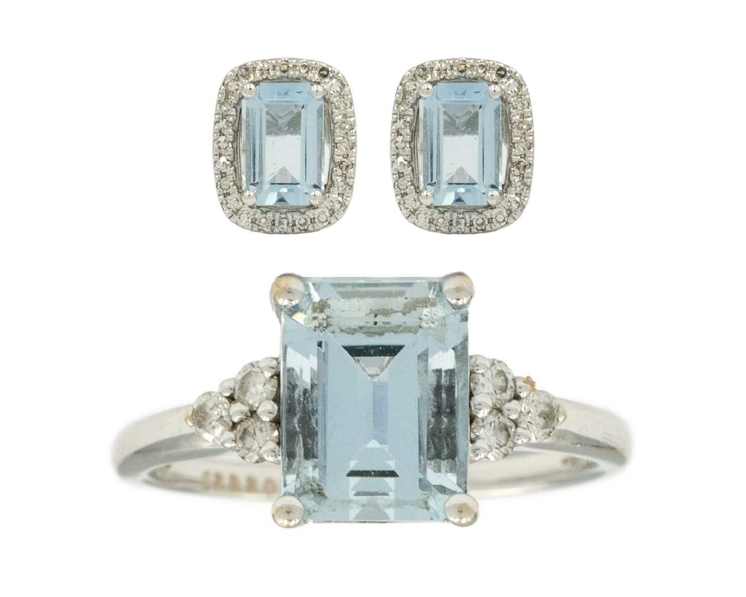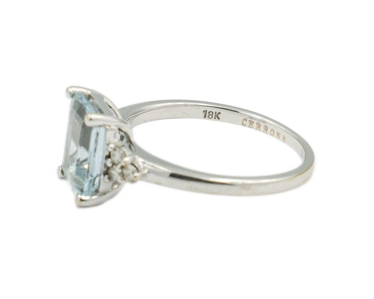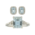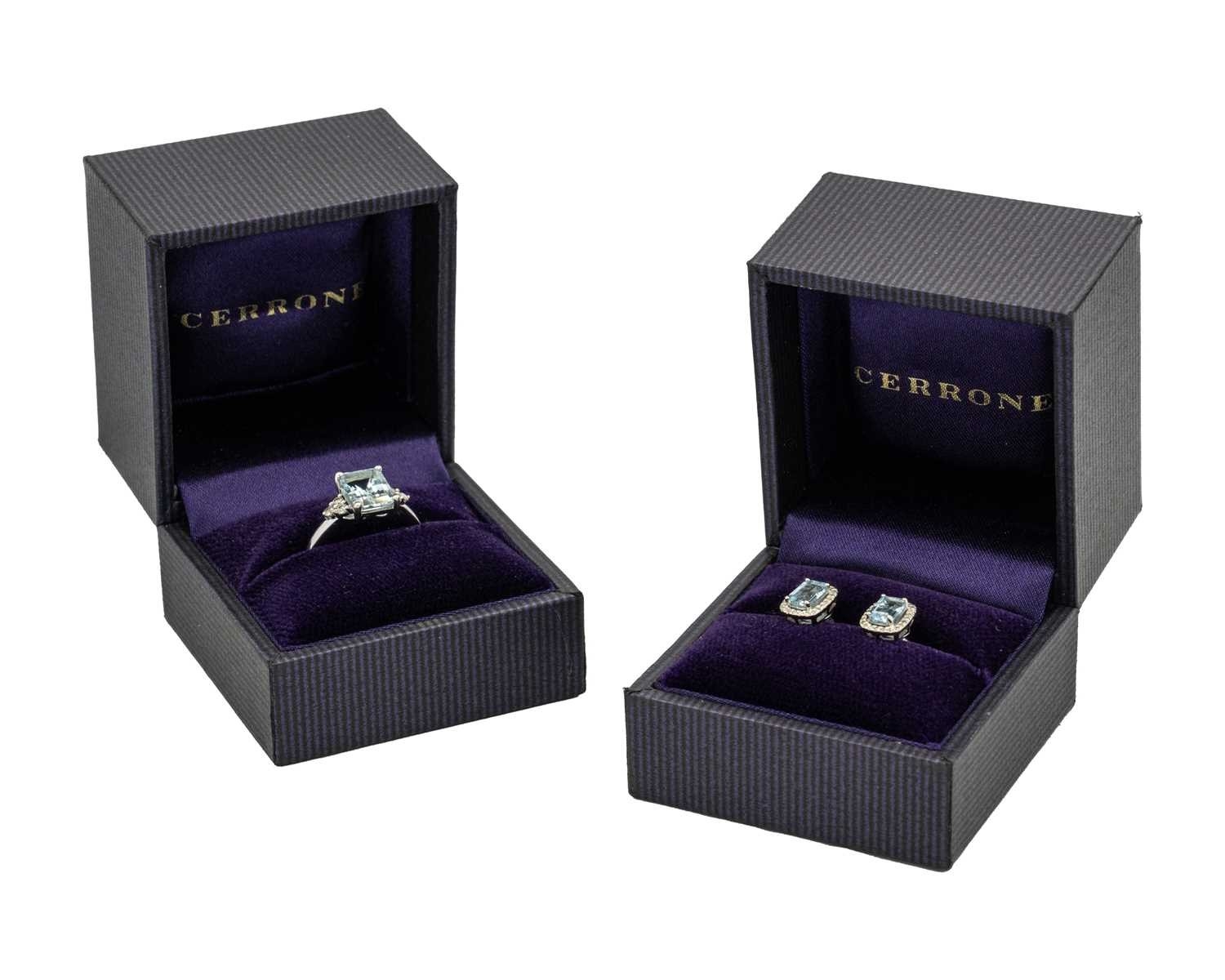 A fine 18k white gold Aquamarine and Diamond ring with a similar pair of earrings, by CERRONE, Australia. Including a ring with a rectangular-shaped emerald-cut aquamarine, 9mm x 7mm, and three round brilliant-cut white diamonds on each shoulder, stamped 750, CERRONE, the ring size is N, weight 3.59g; together with a pair of rectangular-shaped emerald-cut aquamarines surrounded by a row of round brilliant white diamonds stud earrings, 9mm x 7mm, stamped 750, weight 2.25g, in original boxes and a bag.