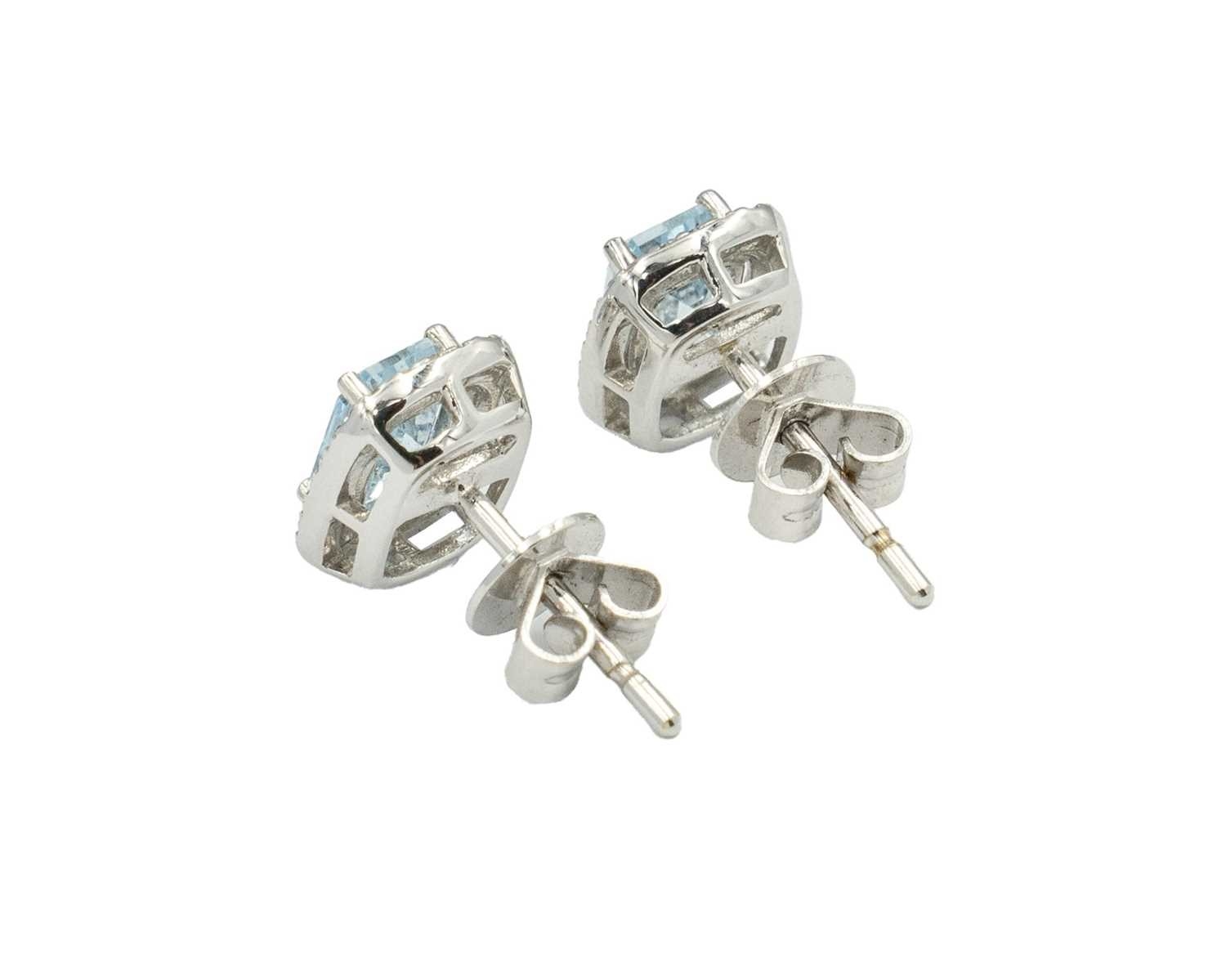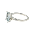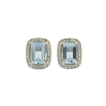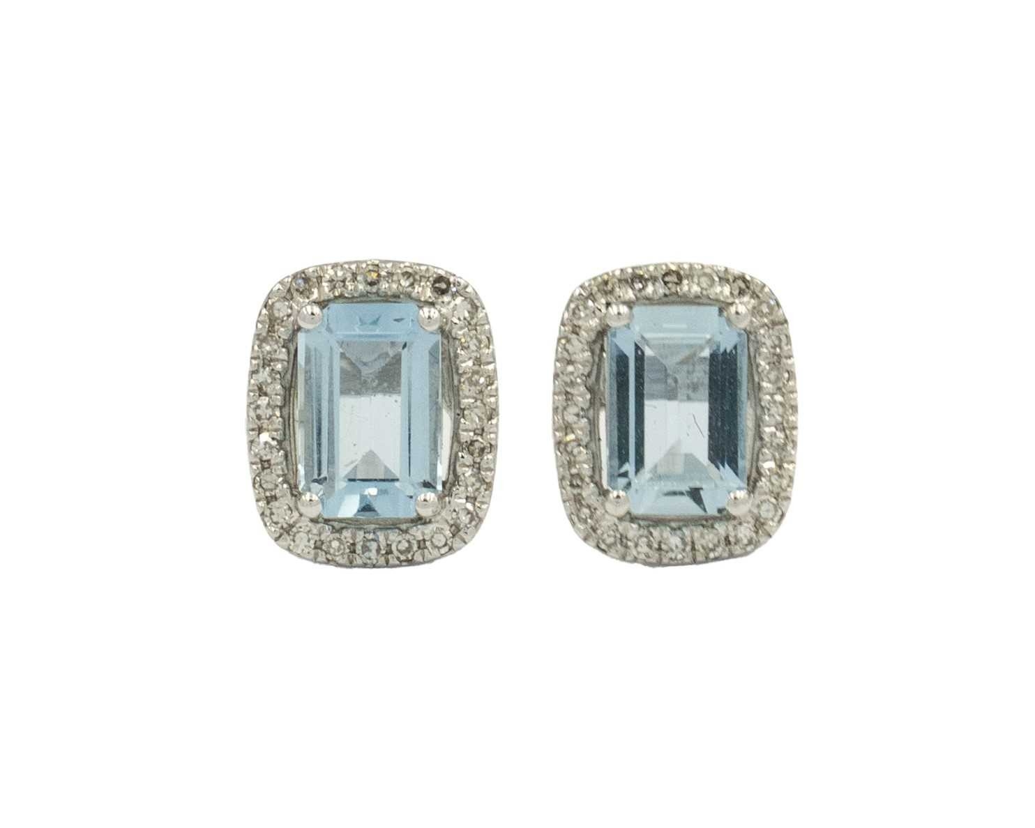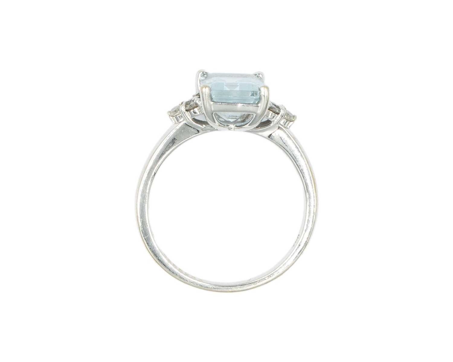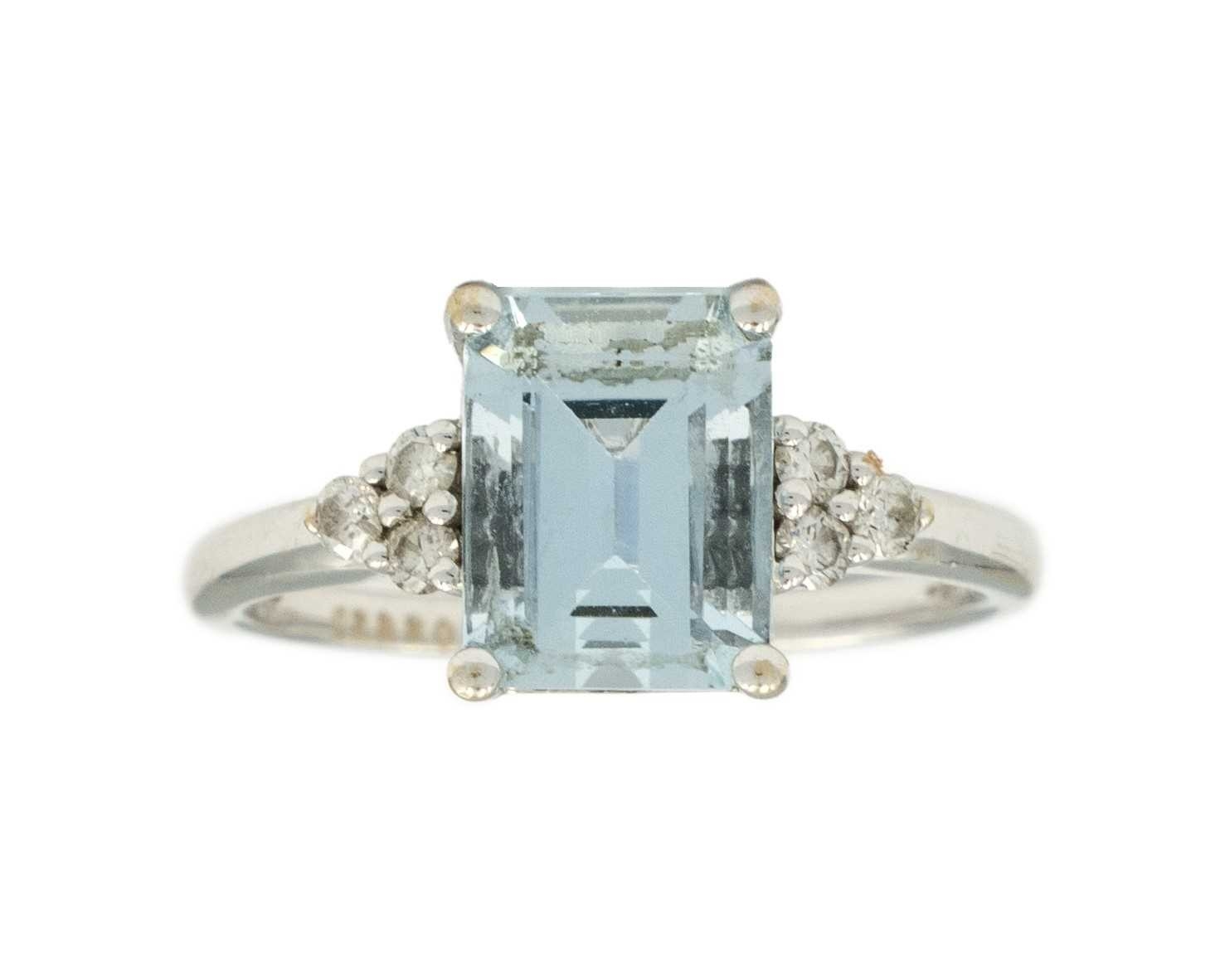 A fine 18k white gold Aquamarine and Diamond ring with a similar pair of earrings, by CERRONE, Australia. Including a ring with a rectangular-shaped emerald-cut aquamarine, 9mm x 7mm, and three round brilliant-cut white diamonds on each shoulder, stamped 750, CERRONE, the ring size is N, weight 3.59g; together with a pair of rectangular-shaped emerald-cut aquamarines surrounded by a row of round brilliant white diamonds stud earrings, 9mm x 7mm, stamped 750, weight 2.25g, in original boxes and a bag.