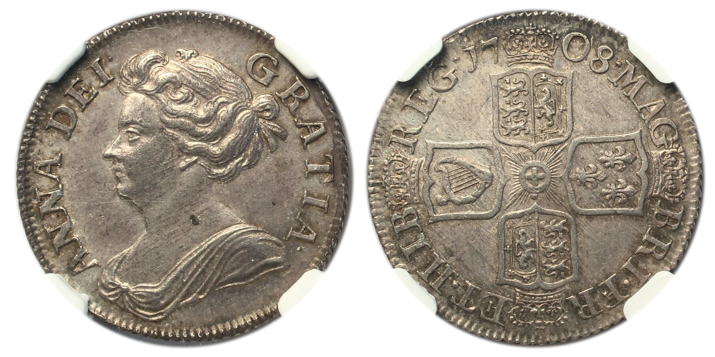 Anne (1702-1714) Shilling, 1708 Post union, third draped bust left, rev. crowned cruciform shields, (SCBC 3610, ESC 1147, Bull 1399). Certified and graded by NGC (8221637-054) as about uncirculated 58