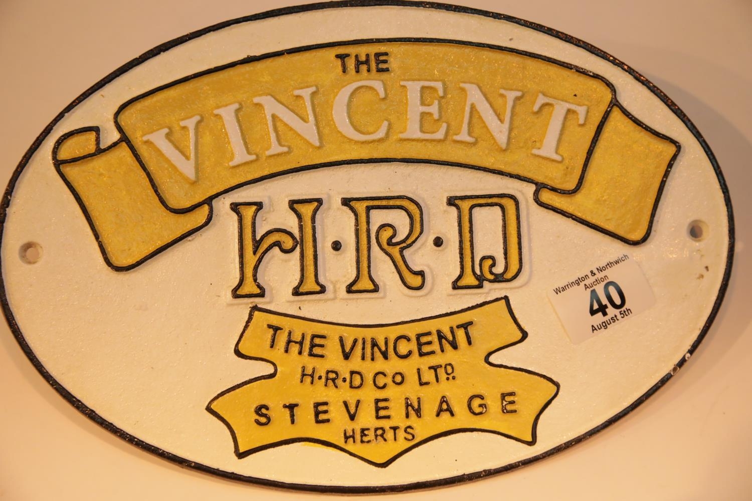 Cast iron The Vincent HRD sign, 30 x 20 cm. P&P Group 2 (£18+VAT for the first lot and £2+VAT for subsequent lots)