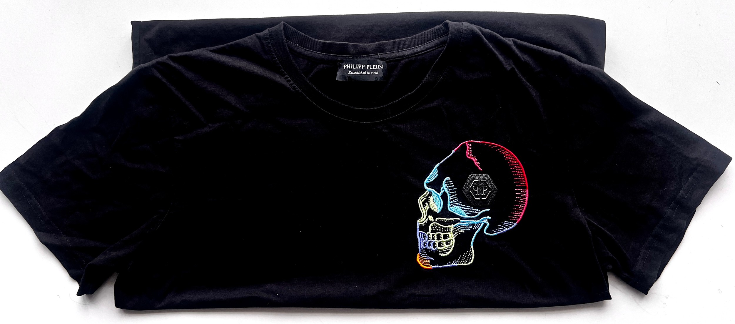 CHSW - Philipp Plein tee shirt. Embroidered skull with logo. Black - size medium. No tags. 50 cms arm pit seam to arm pit seam.