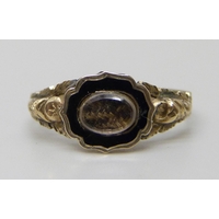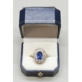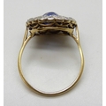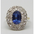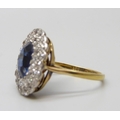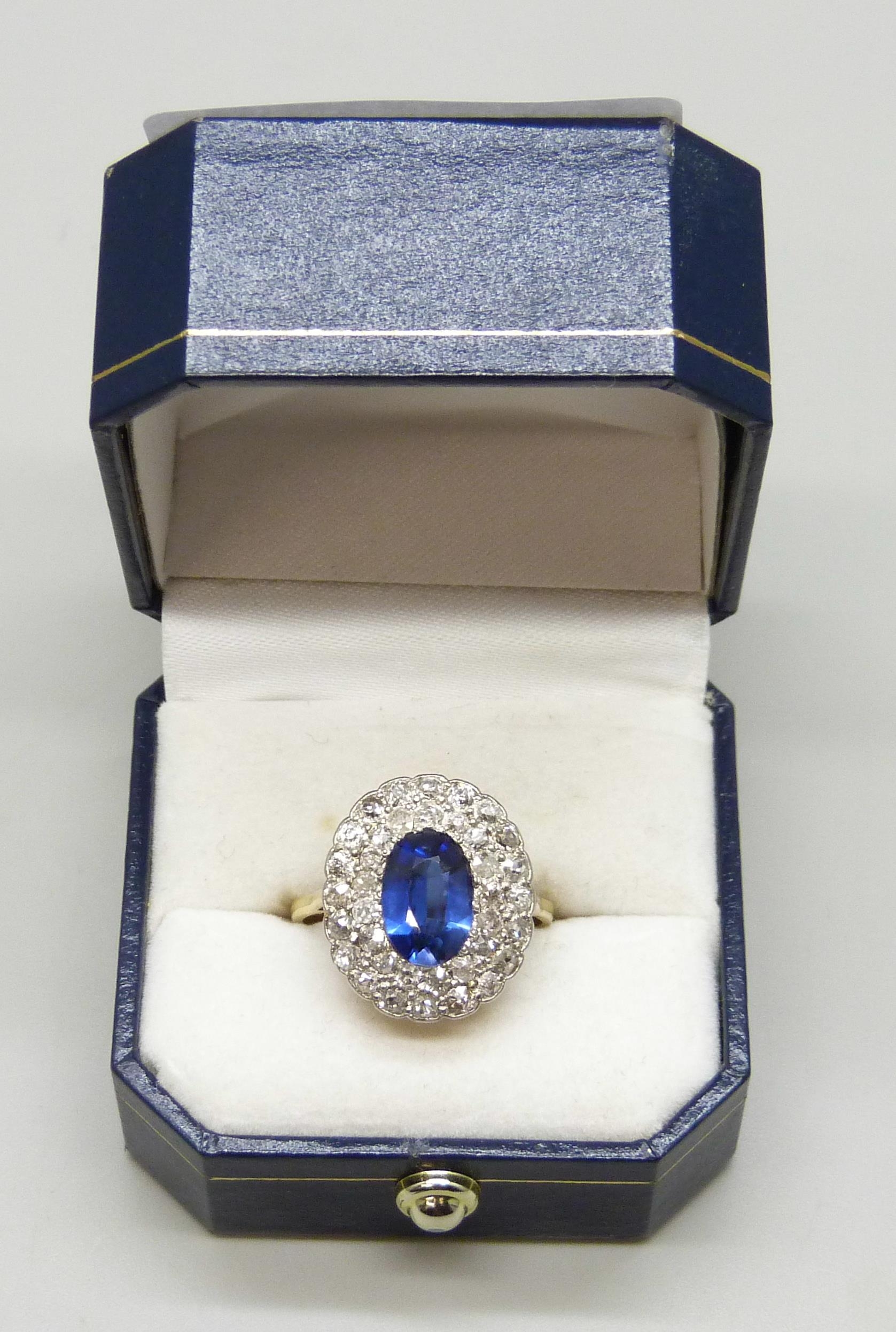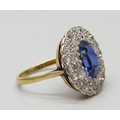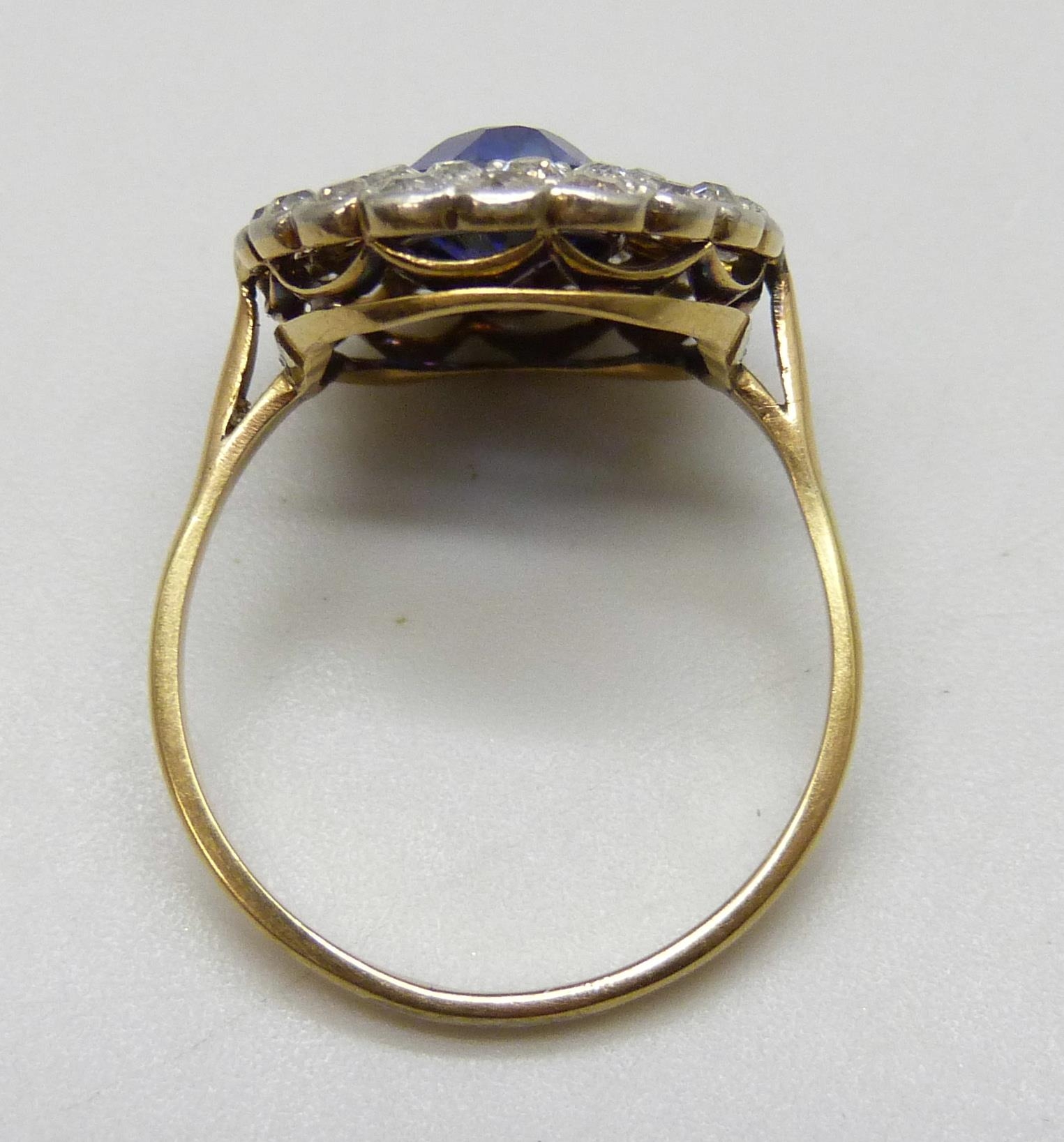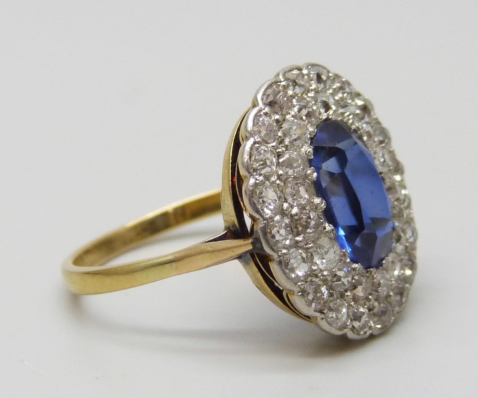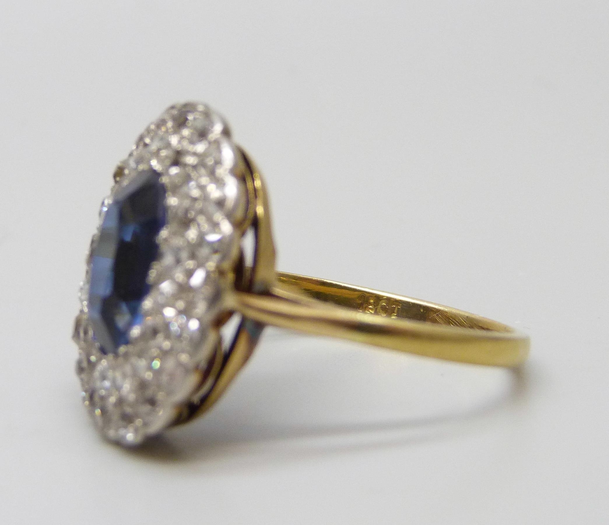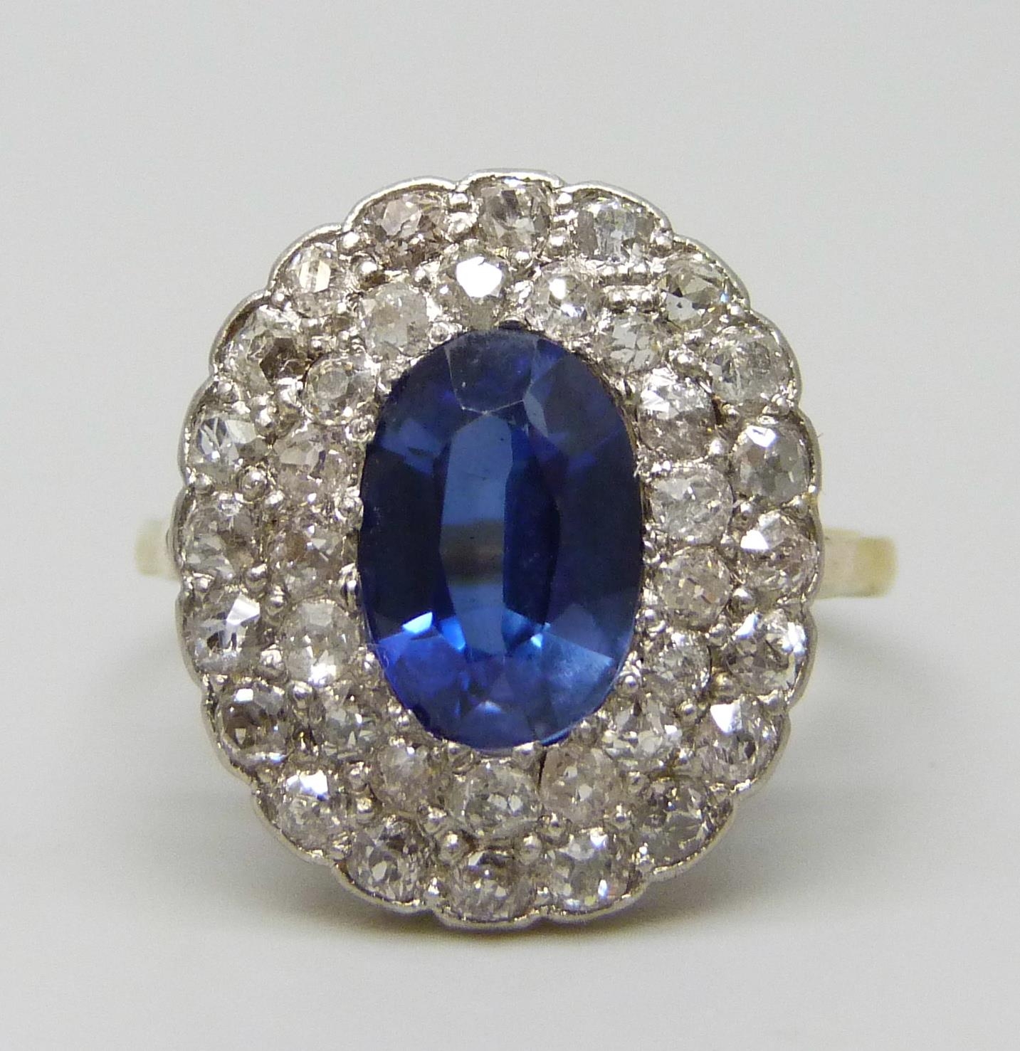 An 18ct gold, sapphire and old cut diamond cluster ring, sapphire 0.9cm, 4.3g, Q