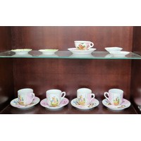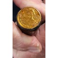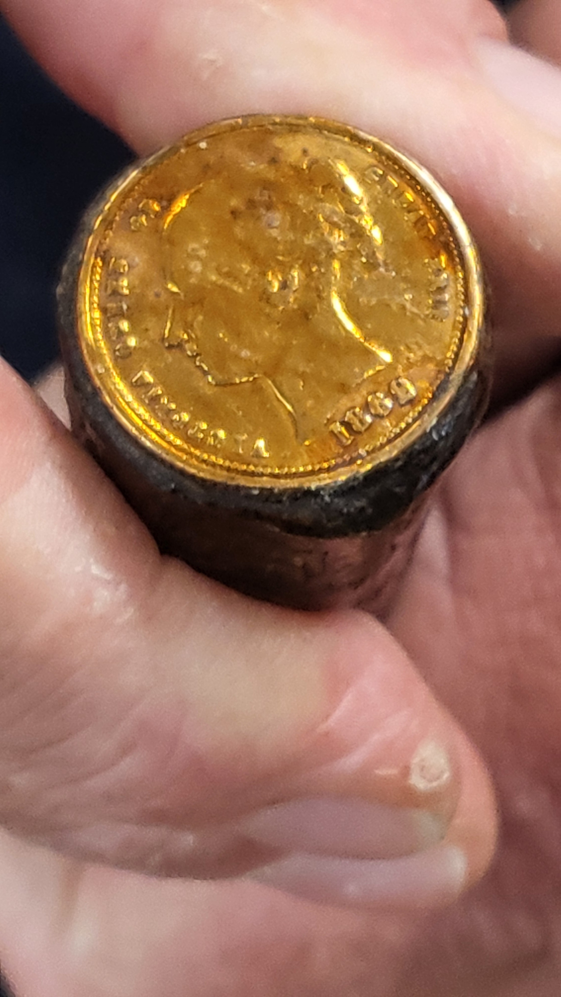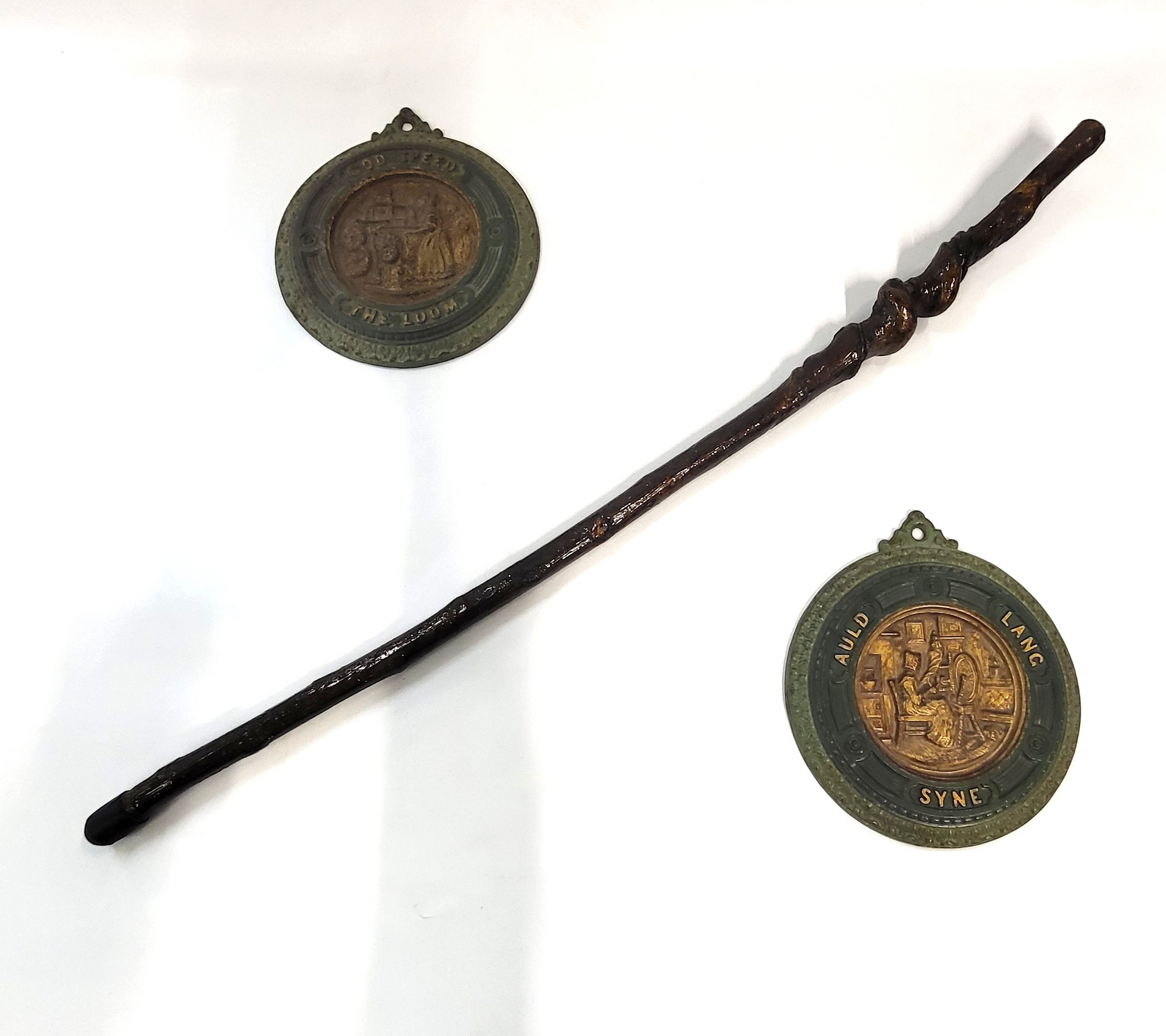Two wall plates 23cm, and a walking stick with Victorian coin.