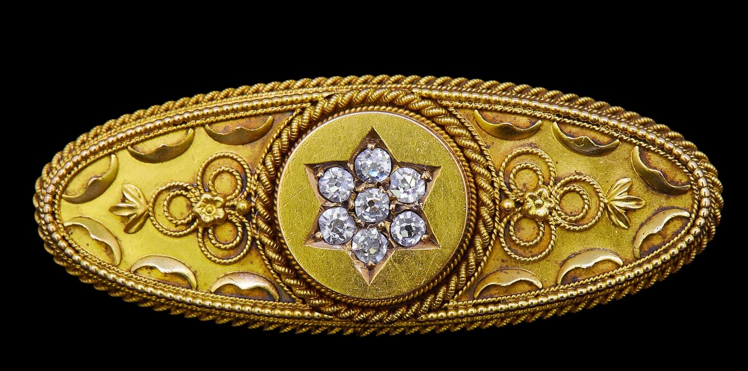ANTIQUE VICTORIAN DIAMOND BROOCH, in 15-ct gold. Set with a central diamond cluster in star shape, further decorated with wirework deign and crescent applique details. W. 4.3 cm. 7.2 grams.