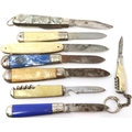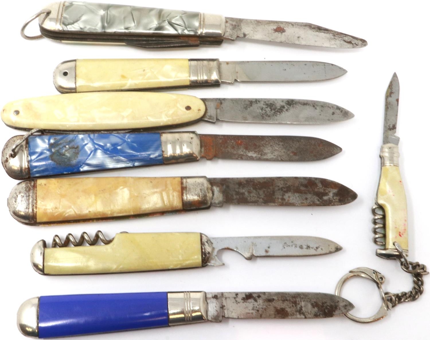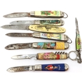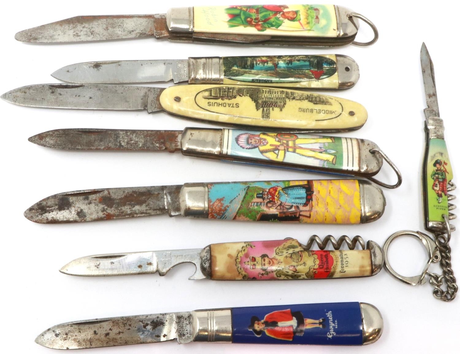 Eight pocket knives, mostly with scenic decorated handles, including Richards. P&P Group 2 (£18+VAT for the first lot and £3+VAT for subsequent lots)