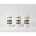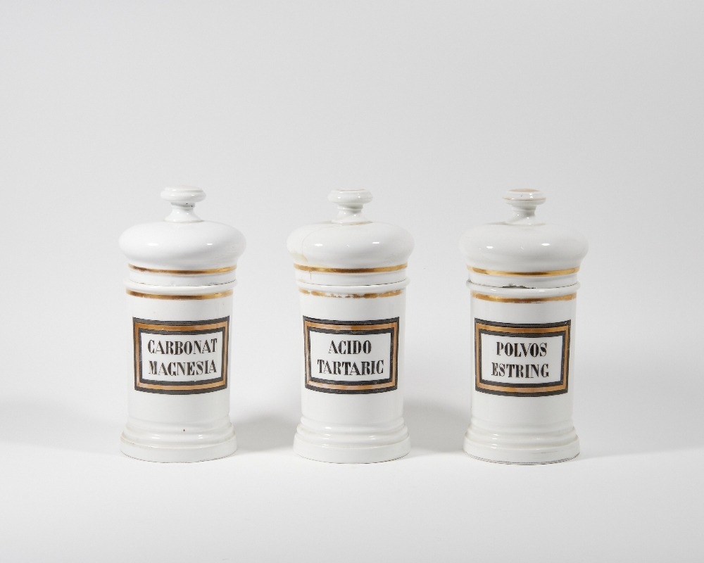Three porcelain apothecary jars, late 19th / early 20th century, unmarked, each of cylindrical form with domed covers and knop finials, the bodies painted in black with rectangular panels and labels, with gilt borders, each 27cm high (3)