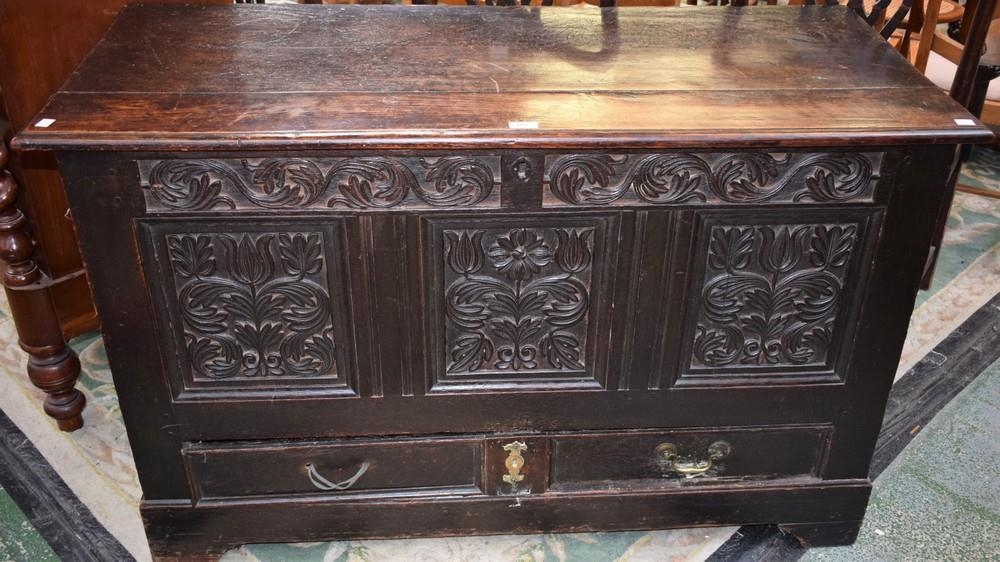 An 18th century oak blanket chest, of large proportions, moulded hinged rectangular top above a three panel front carved and applied with scrolling and blossoming prunus and a long drawer, bracket feet, 80cm high, 129cm wide