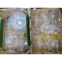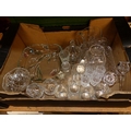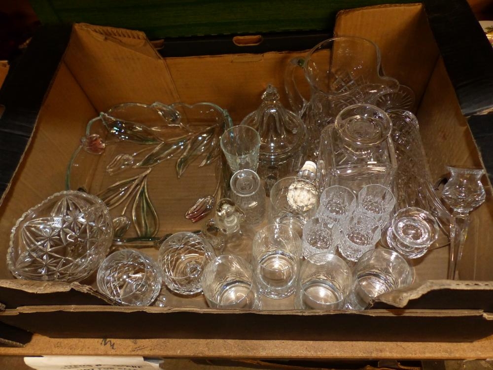 A collection of crystal glassware to include decanter, footed vase, wine glasses, candle stick holders and water pitcher etc. (1 Tray)
