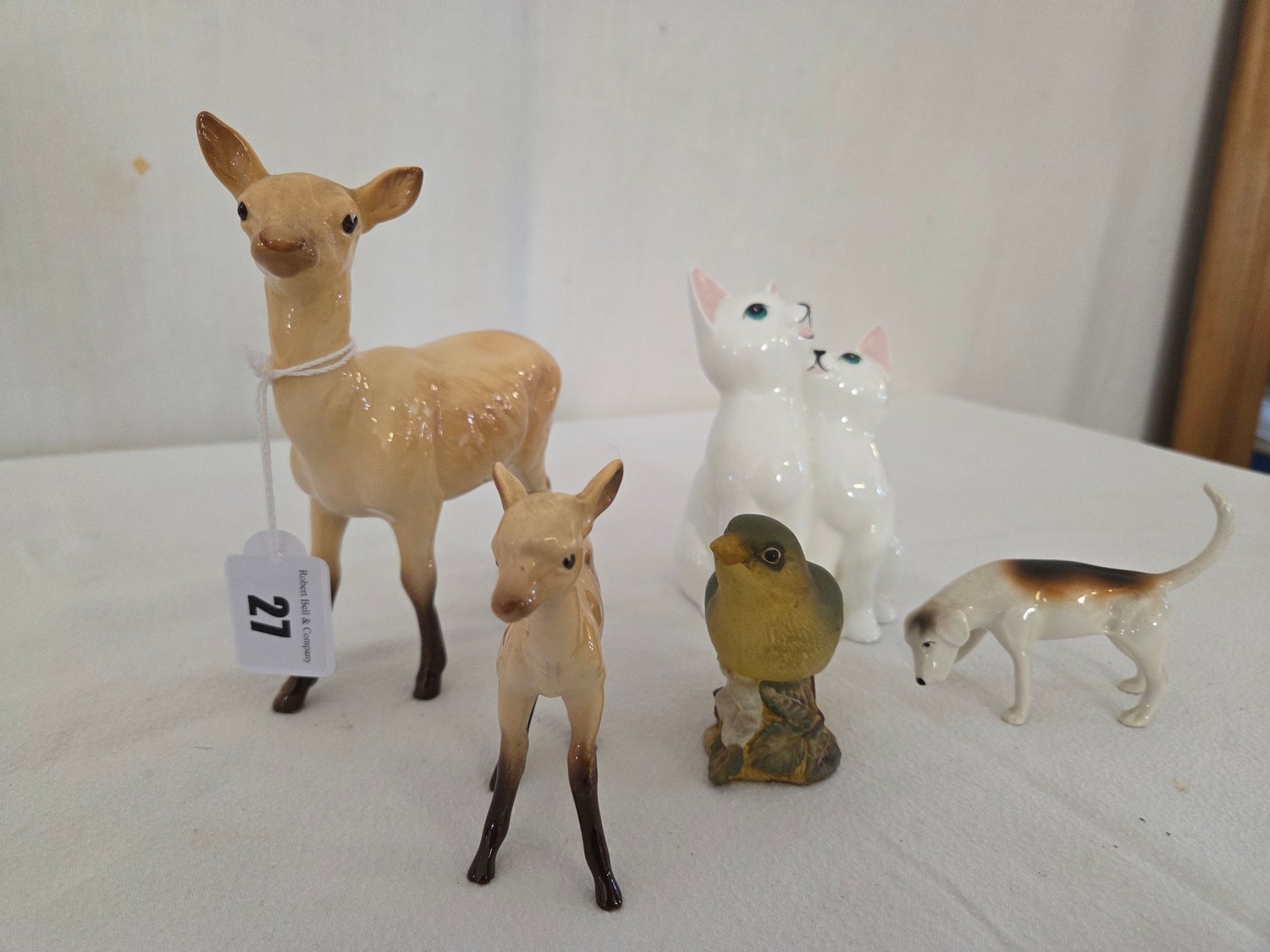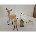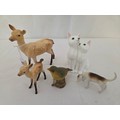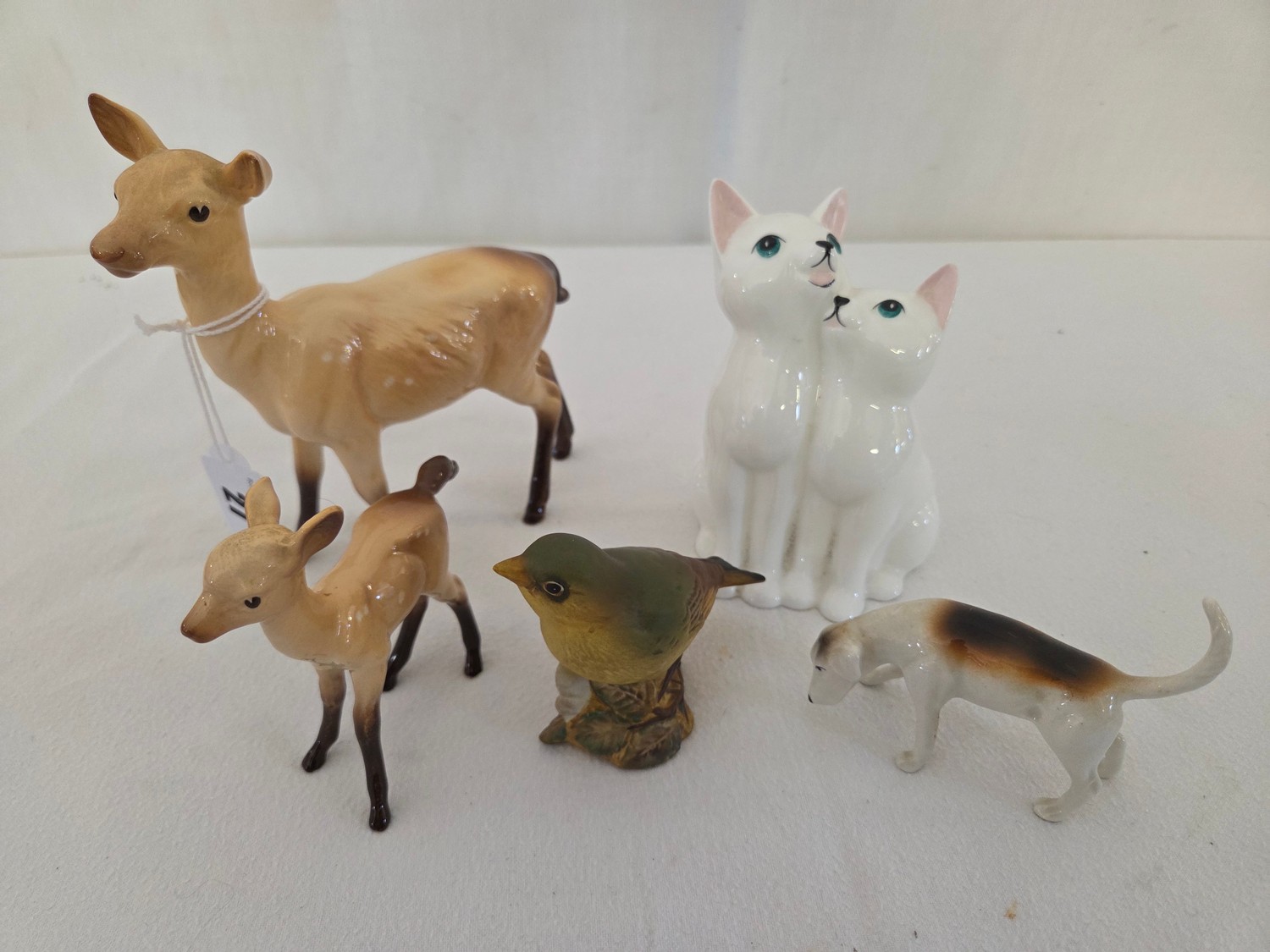 Collection of five various Beswick figurines comprising gloss Doe and Fawn, gloss foxhound, Little Likeables 'Cat Chorus' and a bisque green finch