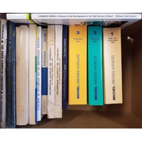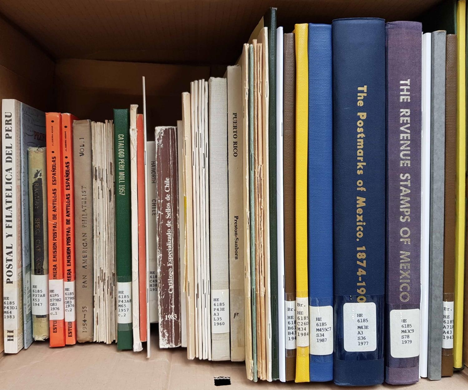 CENTRAL & SOUTH AMERICA: One box containing a large number of publications. Noted Postmarks of Mexico by Shimmer, Revenue Stamps of Mexico by Stevens, Perou Obilterations by Lamy, Postal History of Puerto Rico by Preston. (50)