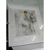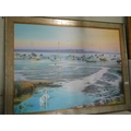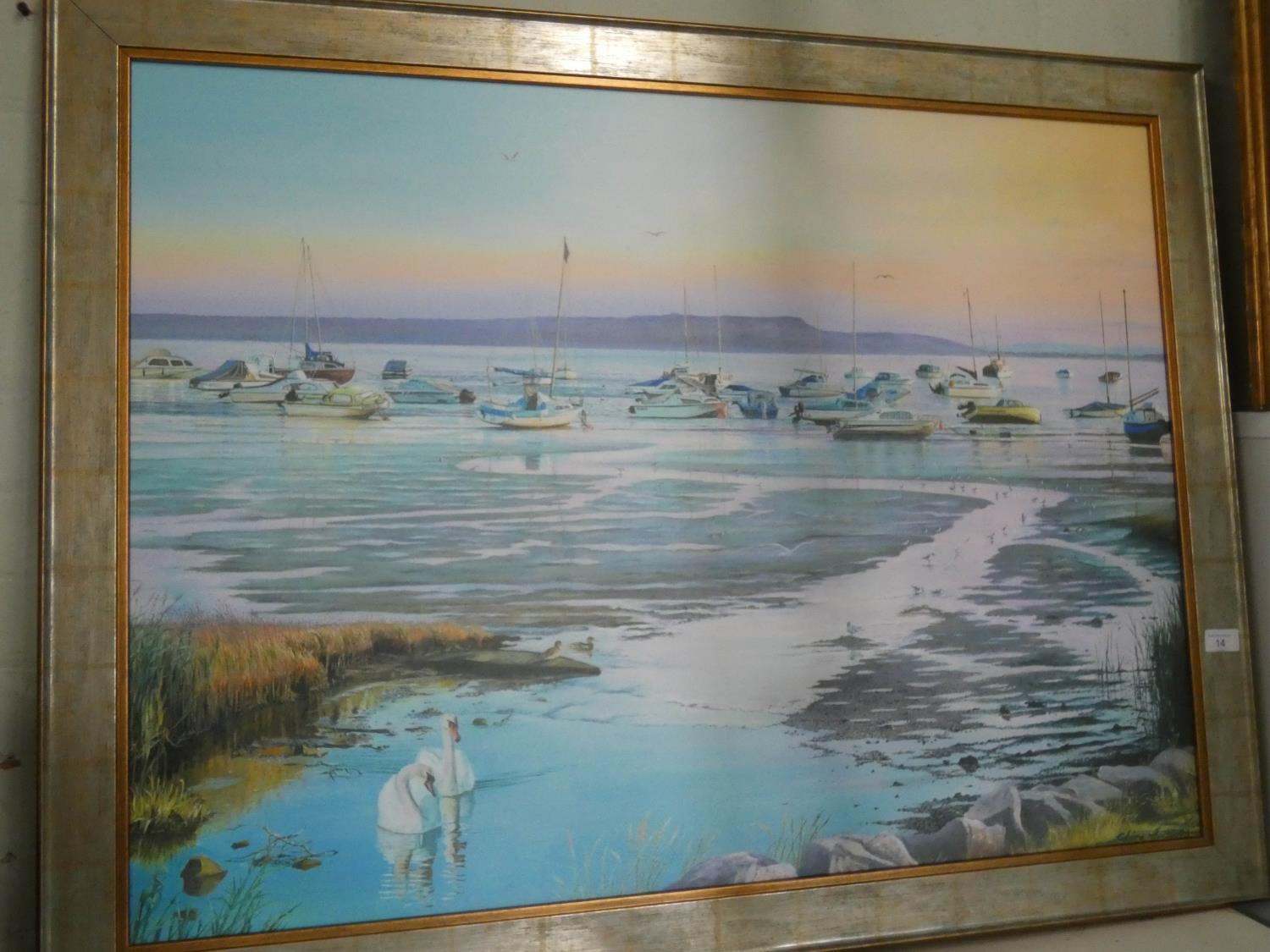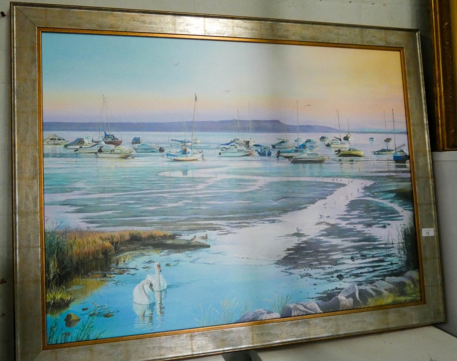 Framed oil painting style print of a boats in harbour, signed 'Cherie Wheatcroft', number 6 of 50