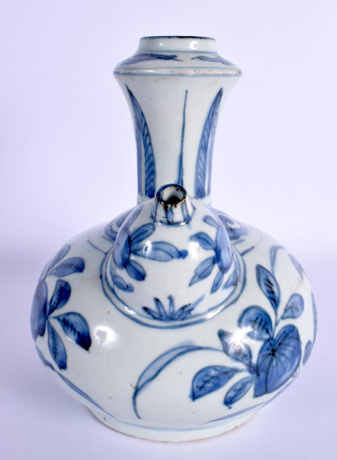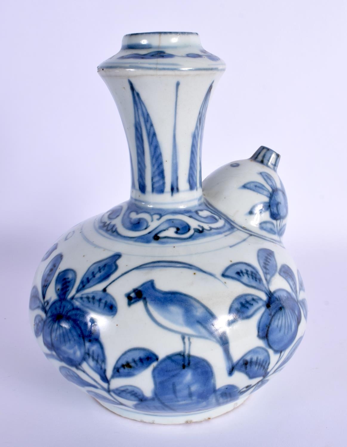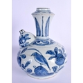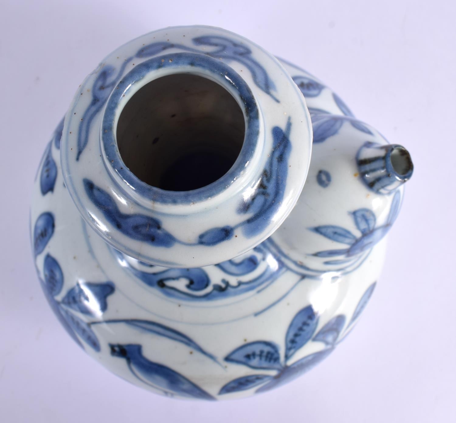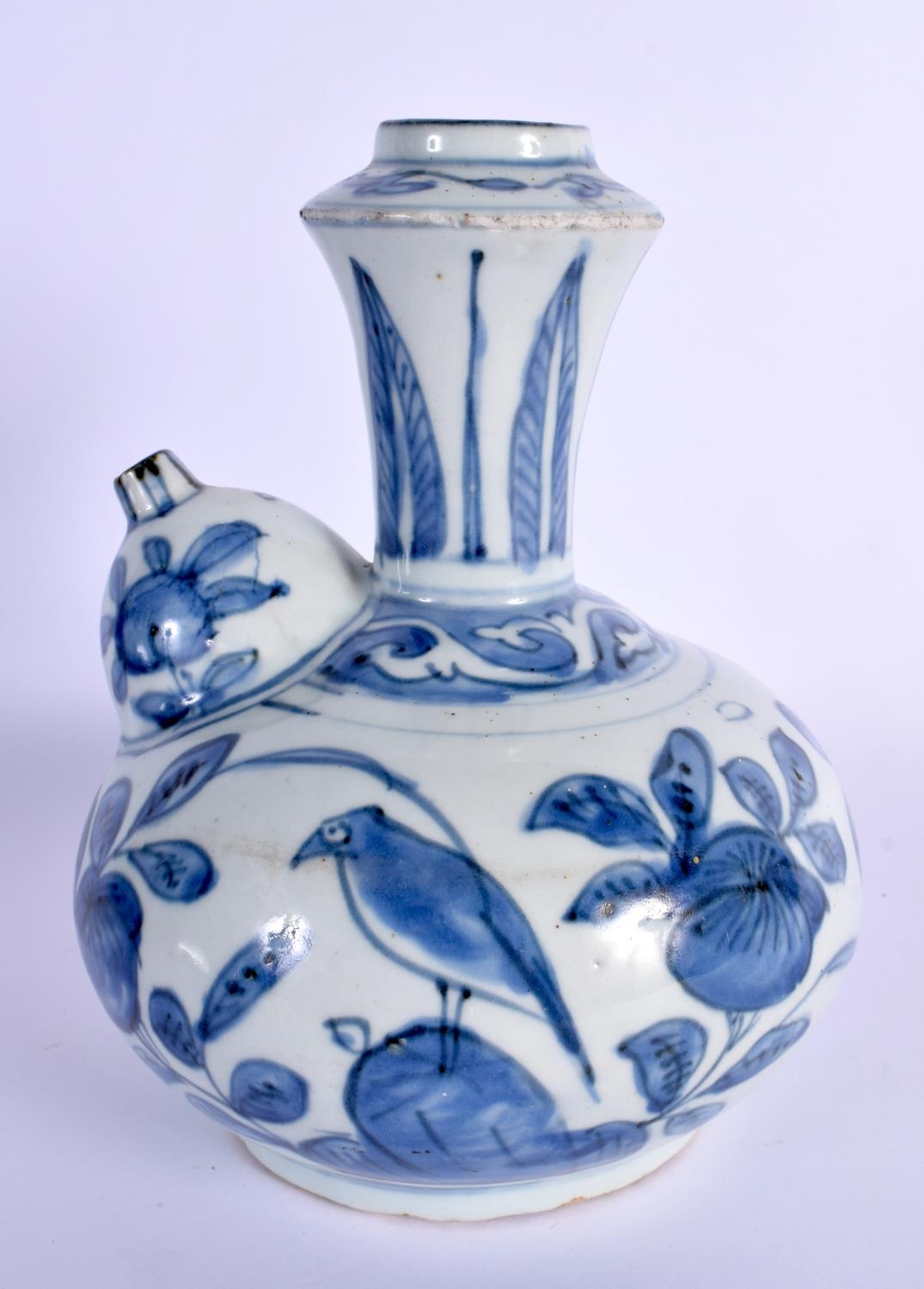 A 17TH CENTURY CHINESE BLUE AND WHITE PORCELAIN KENDI Ming painted with birds amongst foliage and vines. 19 cm x 13 cm.