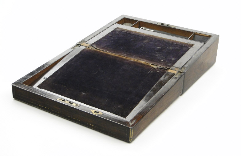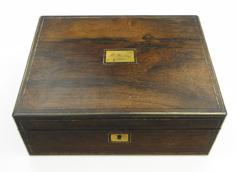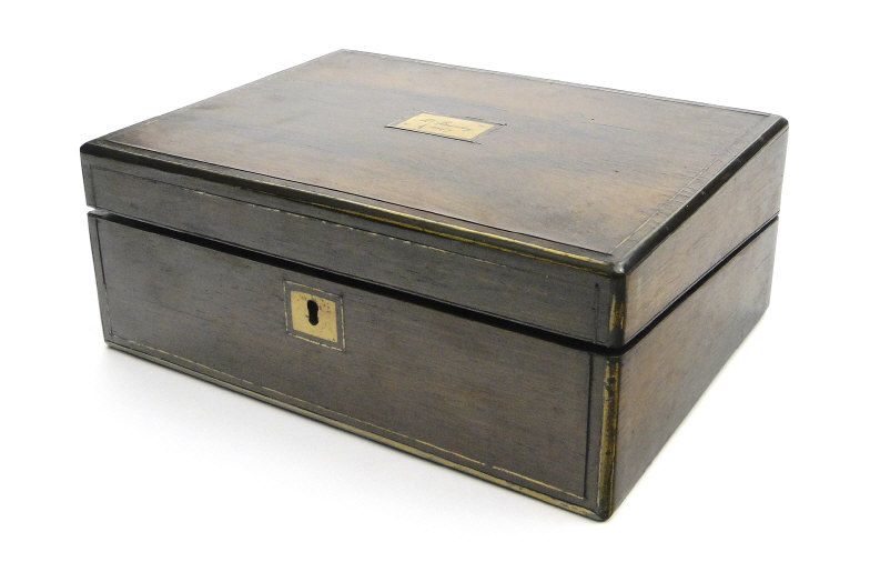 Victorian brass inlaid rosewood writing slope with fitted interior, 29cm in length