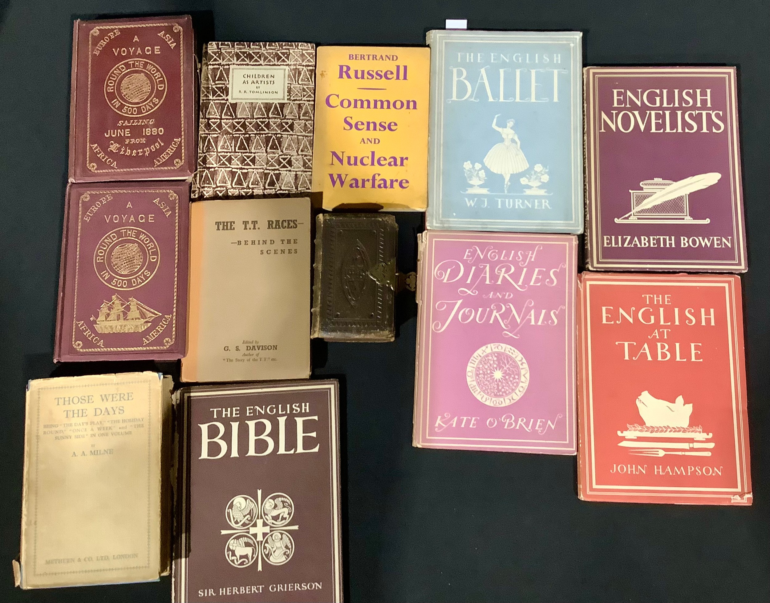 Books- Miscellaneous: Book of Common Prayer and the Sacraments, Oxford, University Press, 1866, unpaginated, 32mo, gilt edges, marbled boards, bound embossed leather, four raised bands to spine with gilt titles, brass clasp; Davison, (G. S.) ed., Behind the Scenes, the TT Special, 1st Birmingham 1949 168pp, bound buff cloth over brown boards, black titles; Russell (Bertrand Arthur William Russell, OM, FRS, 3rd Earl Russell 1872-1970), Common Sense and Nuclear Warfare, 1st edn., London, George Allen & Unwin, 1959, 12mo,m 93pp, purple printed yellow card covers; Dodman (G. Sutherland), A Voyage Round the Worlds in 500 Days, 2nd edn., London, Mackie Brentnell 1880 12mo, xi + 174pp, map to frontis with engraved p[ortrait of ship, other illus., bound gilt embossed red boards, gilt titles to spine; Dodman (G. Sutherland), A Voyage Round the Worlds in 500 Days, 2nd edn., London, Mackie Brentnell 5th edn., 1881, 12mo, xi + 174pp, ap to frontis with engraved portrait of ship, other illus., bound gilt embossed red boards, gilt titles to spine; Milne (Alan Alexander, 1882-1956), Those Were the Days, 1st edn., London, Methuen, 1929, small 8vo, xi + 887 + 8pp, bound blue cloth with gilt autograph, gilt titles to spine, d. w.; Collins’ Britain in Pictures Series, each London, William Collins, roy. 8vo, 48pp, 8 col. plates, other monochrome illus.: Bowen (Elizabeth), English Novelists (1942); Grierson (Sir Herbert), The English Bible (1943), O’Brien (Kate), English Diaries and Journals (1943), Turner (W. J.), English Ballet (1944), Hampson (John), The English at Table (1944); Tomlinson (R. R.), Children as Artists, London, King Penguin, 1944 16mo, 32pp, 16 col. plates, bound decorative brown boards (spine parting) (12)