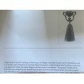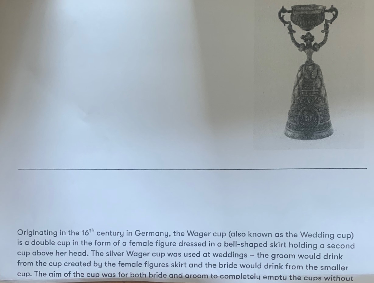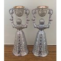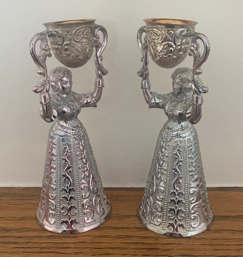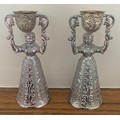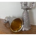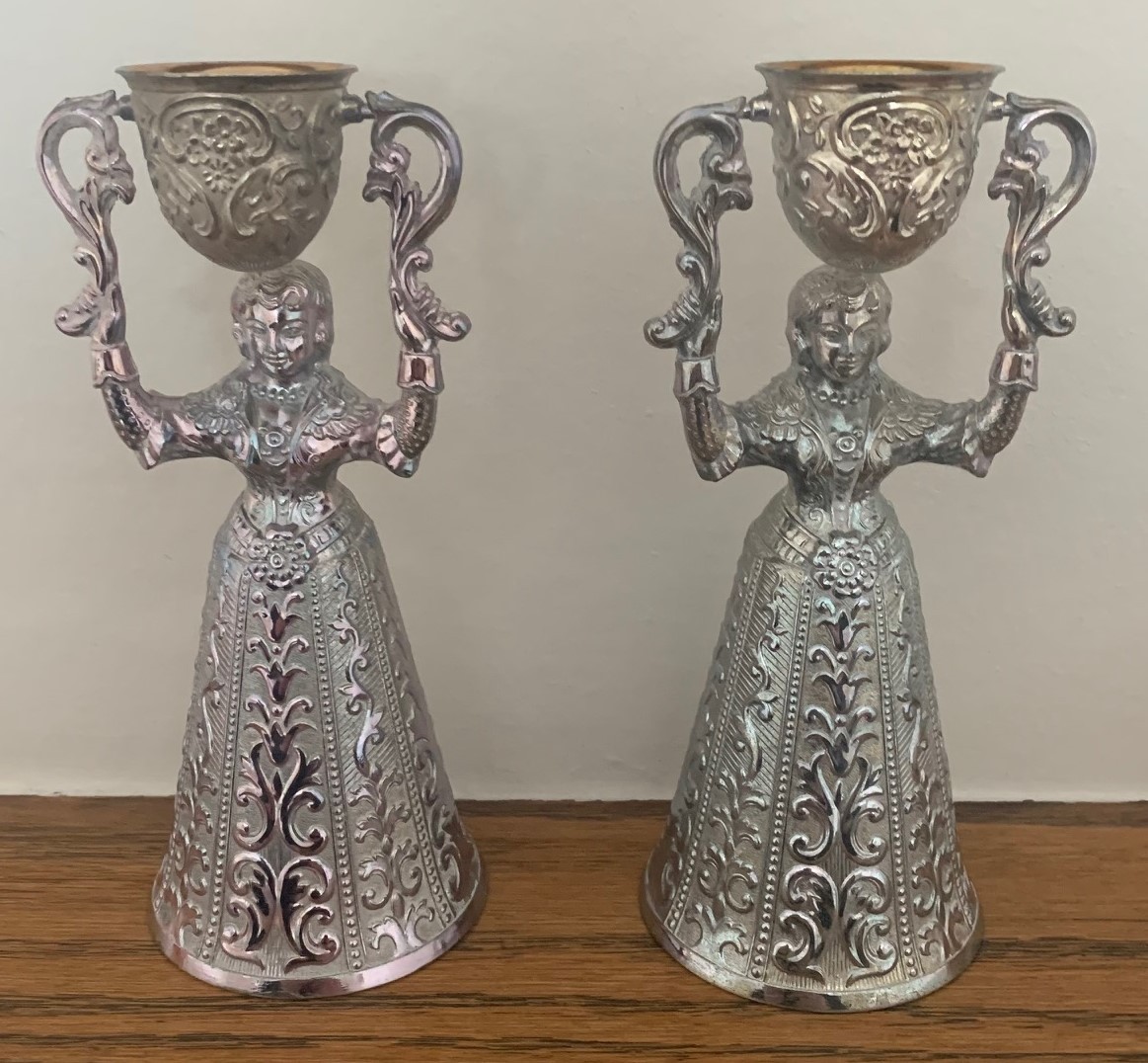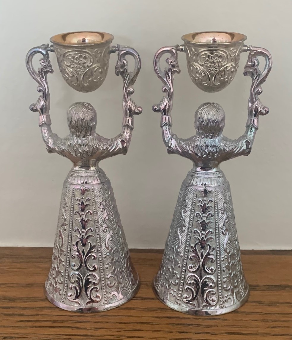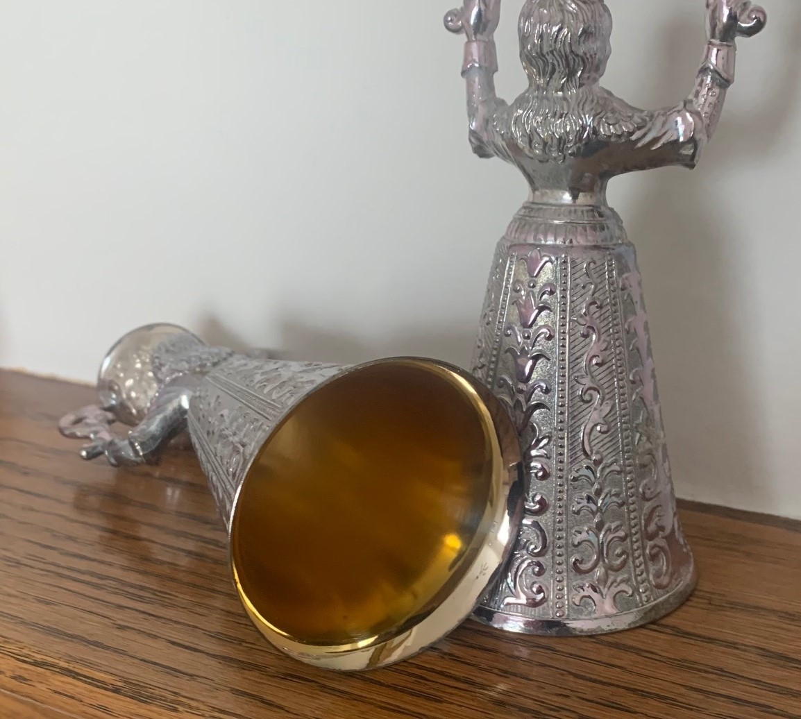 Pair of Dutch silver plated and gilt traditional wedding or wager cups in the form of two women holding swivel cups above their heads, 15cm high.