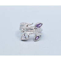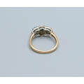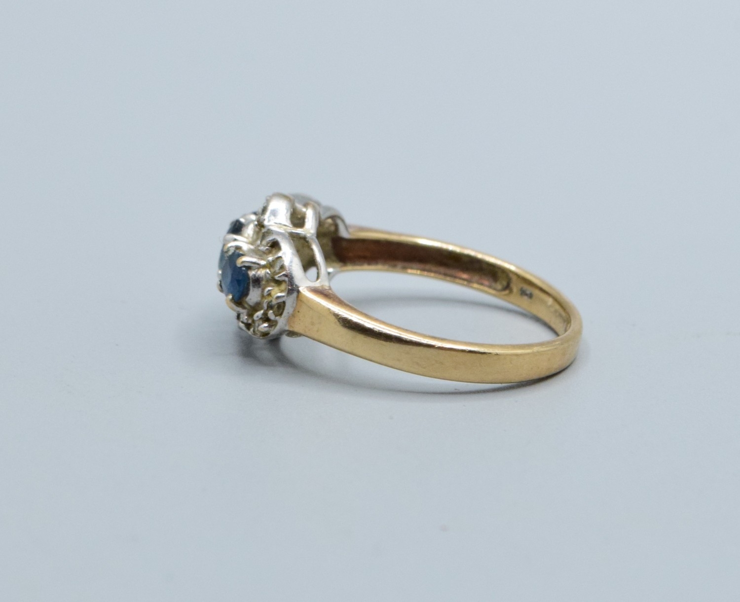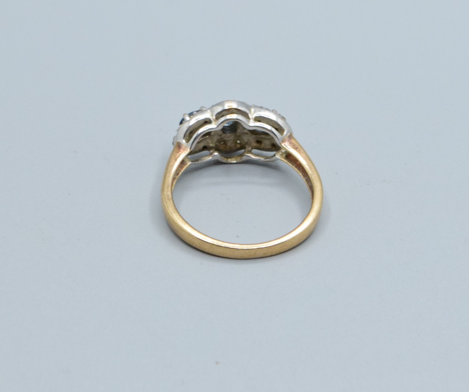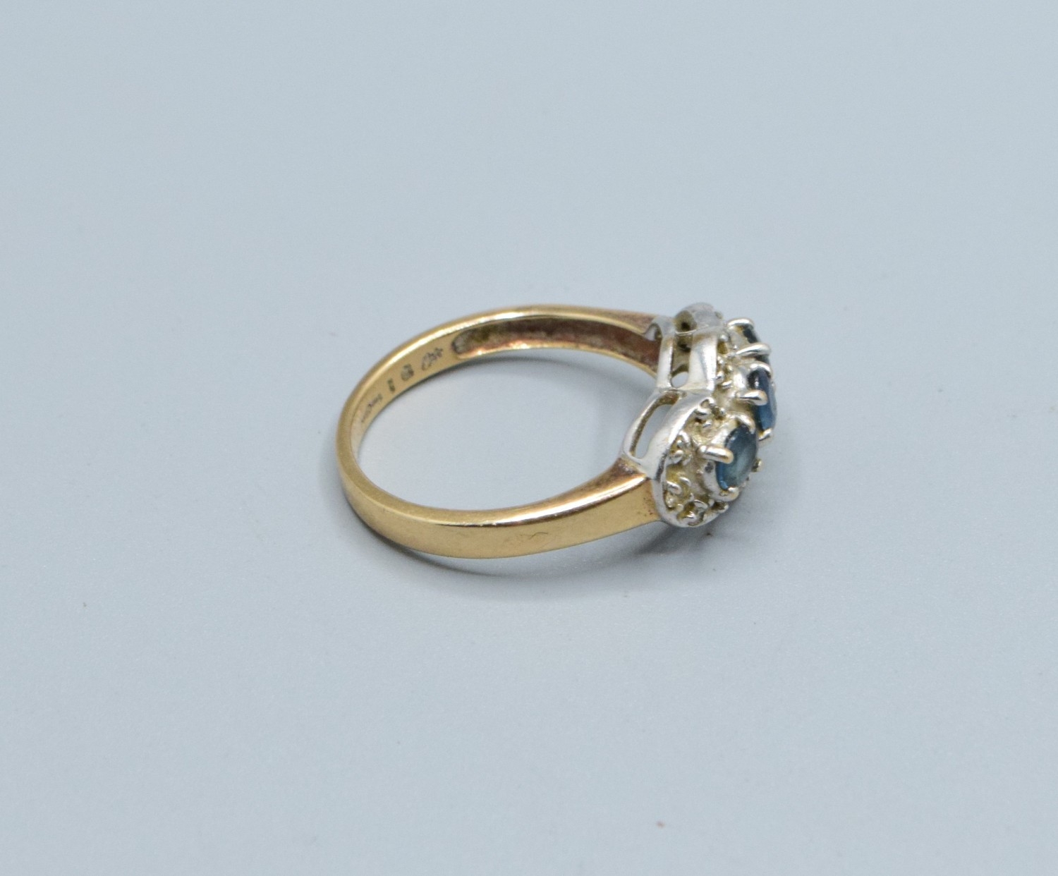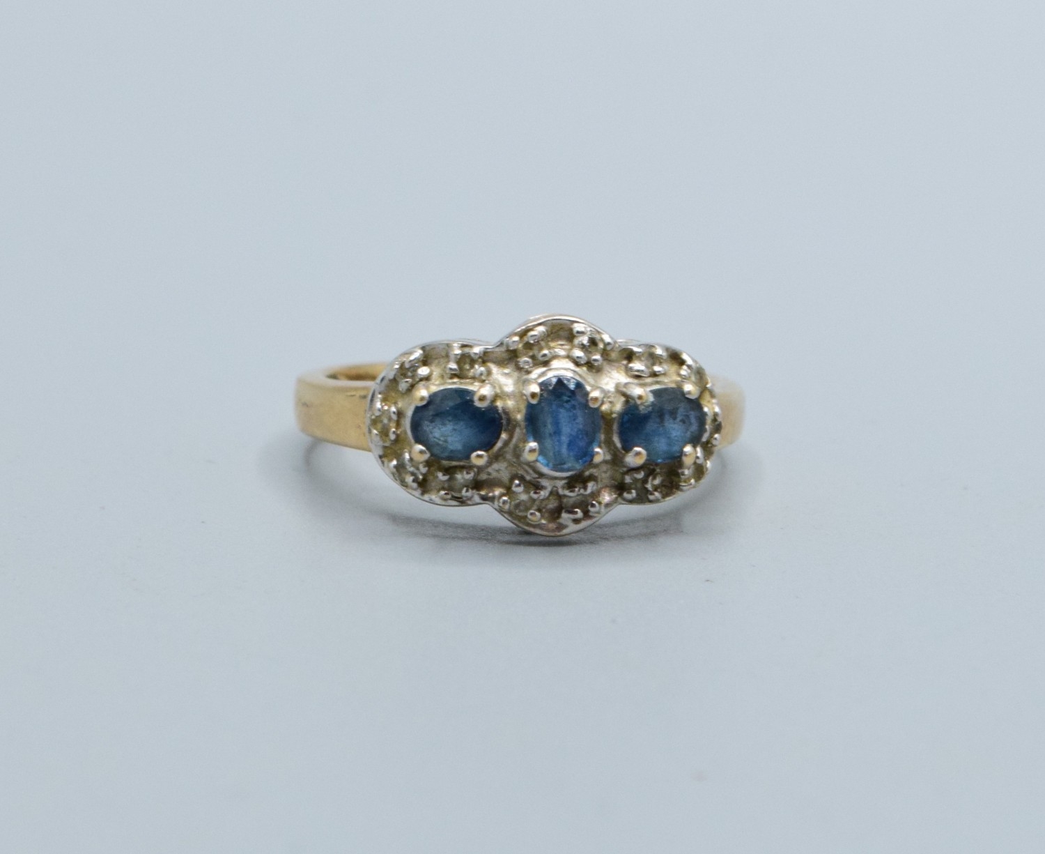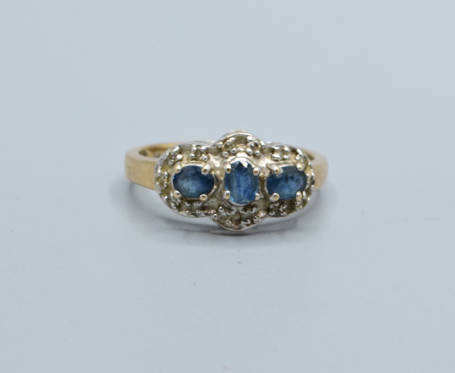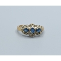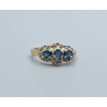 9ct gold ladies triple Tanzanite and Diamond graduated halo design ring size N, 3.5grams