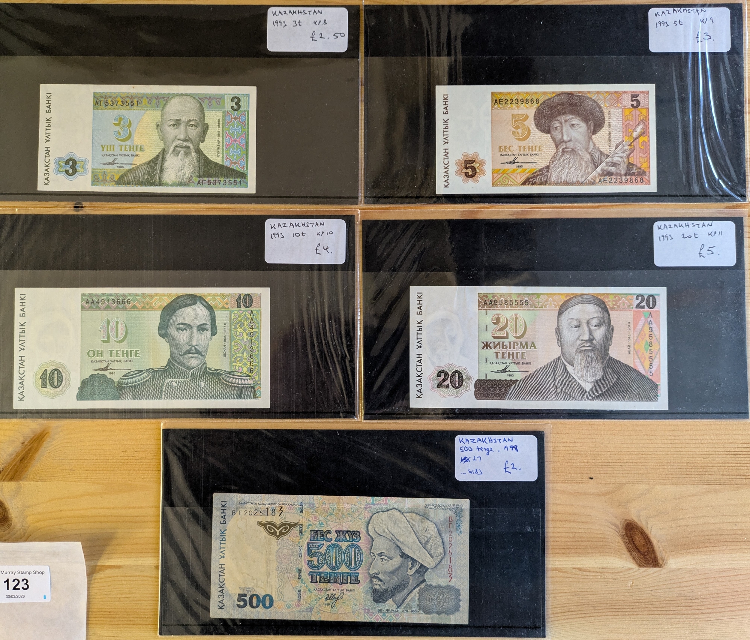BanknotesKazakhstan; 1993-99 five different notes. Retail £16½.