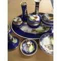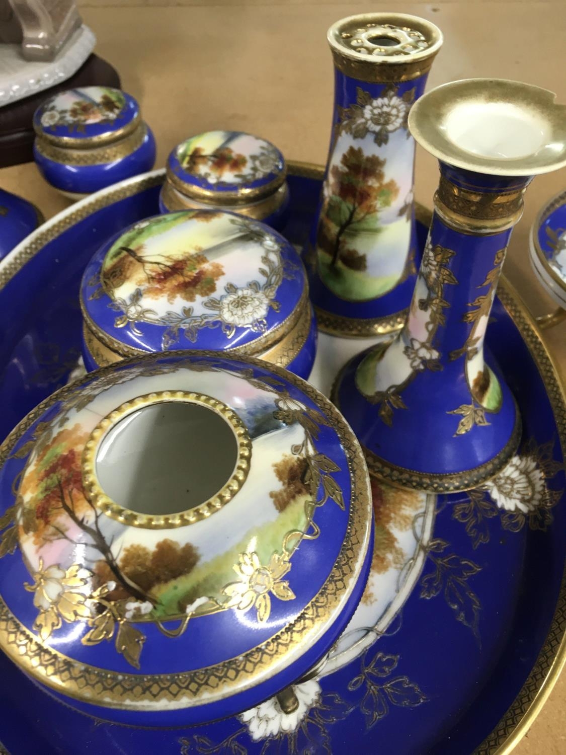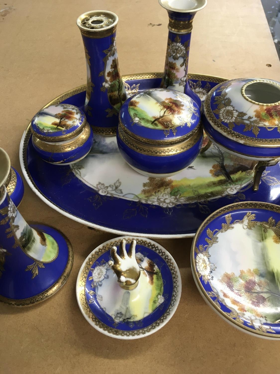 A Noritake dressing table set decorated with a landscape view in blue and gilt .