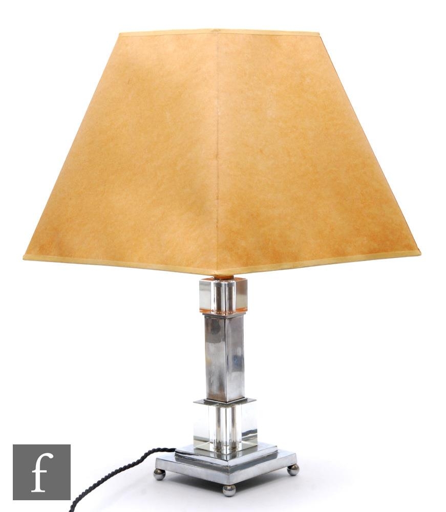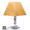 A 20th Century table lamp, with chrome and Perspex stepped details, complete with shade, height 46cm, damaged.