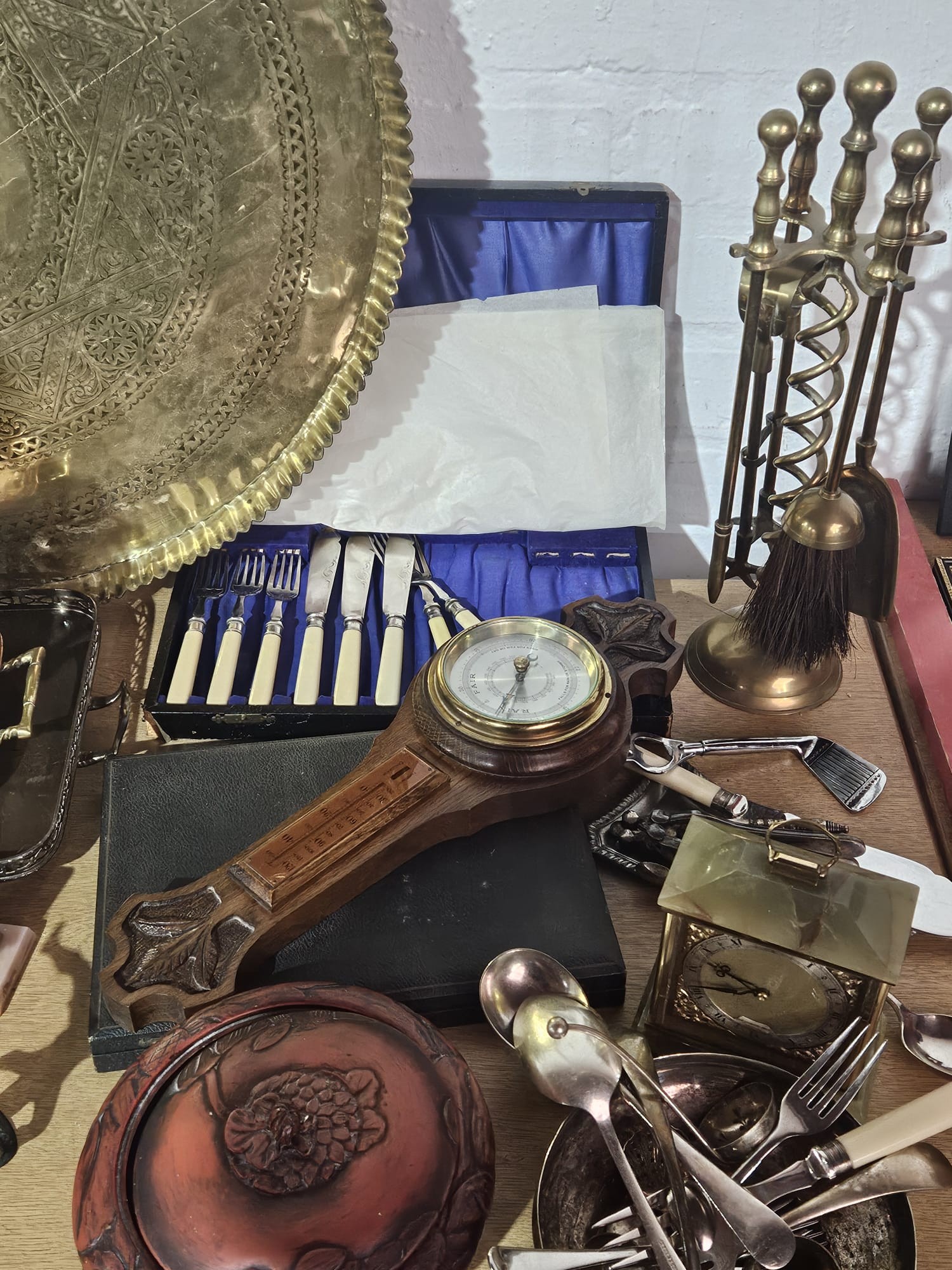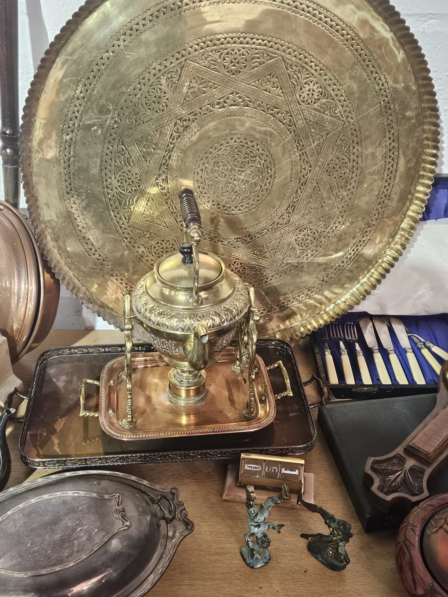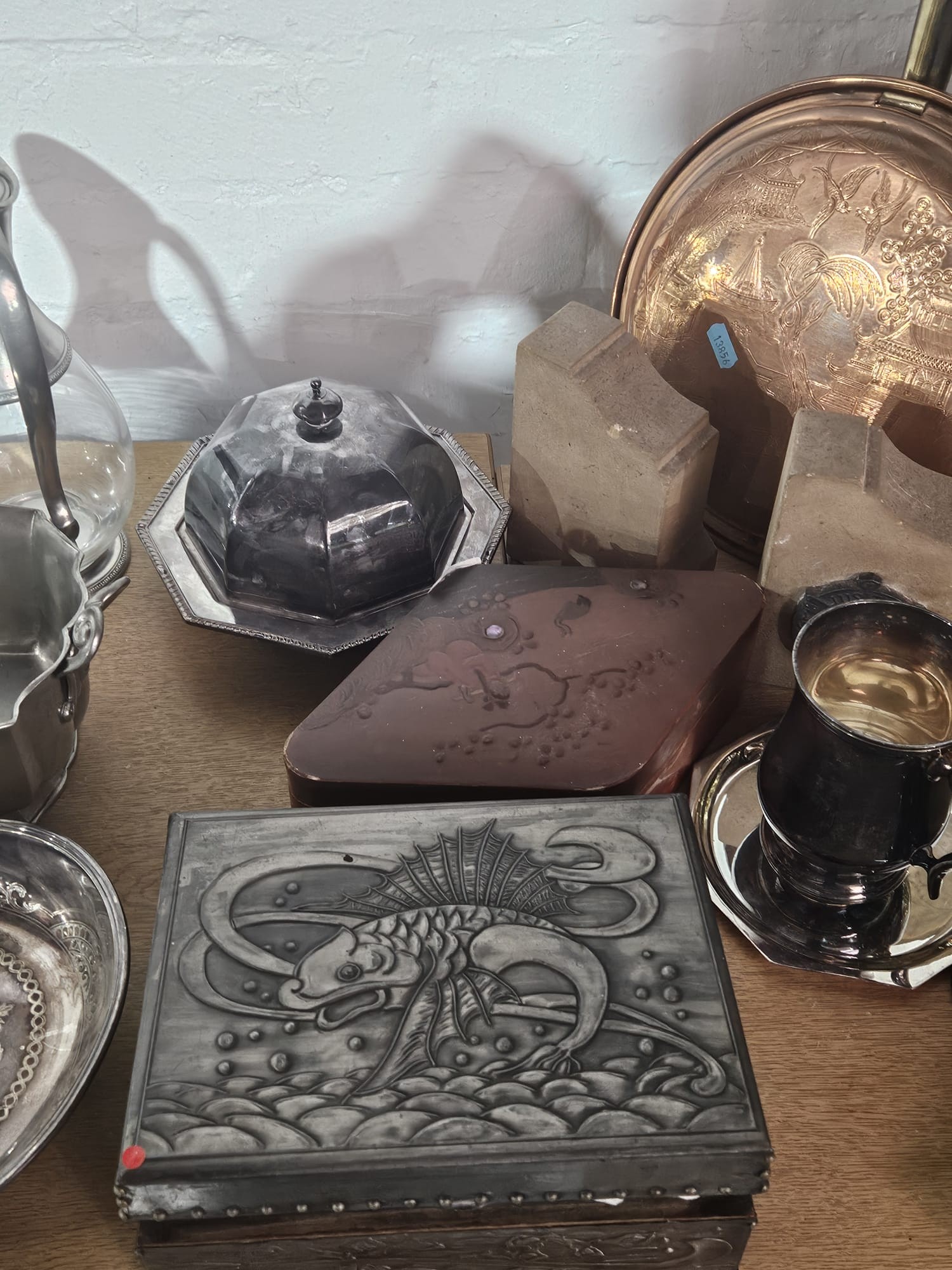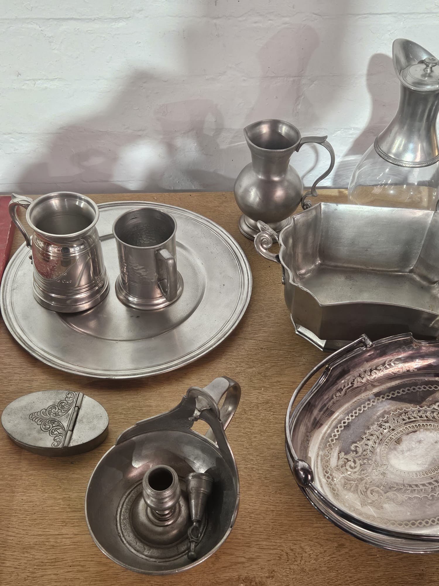 Metalware to include brass, silver plate, pewter, etc, - claret jug, brass charger, beer tankards, bowls etc
