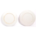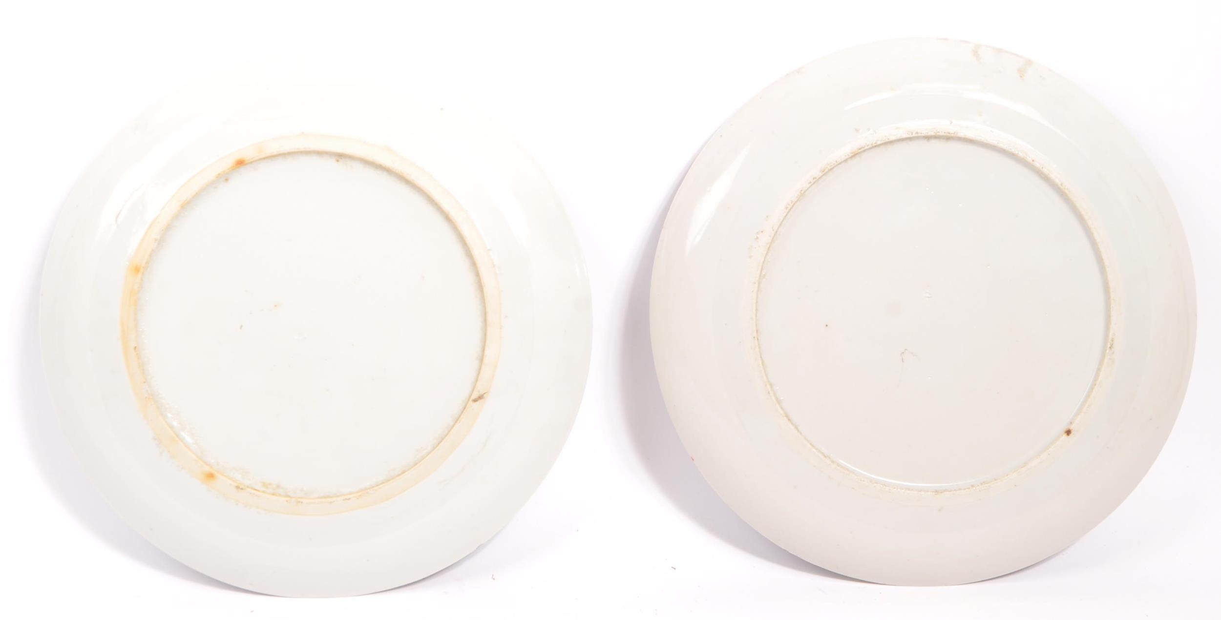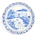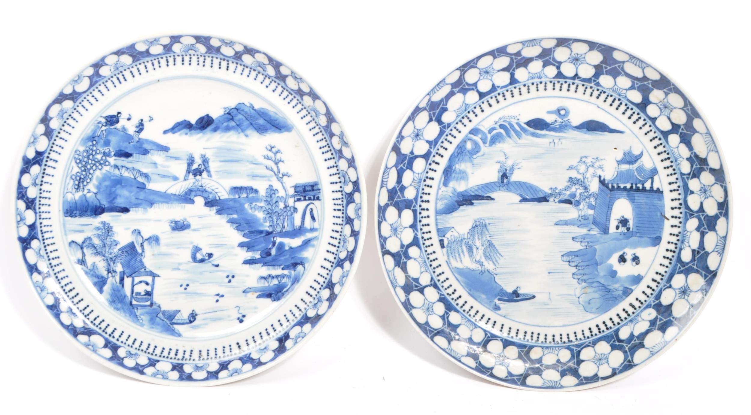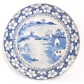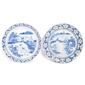 Two Japanese Meiji period hand painted Japanese blue and white Arita porcelain plates. The plates being hand painted with scenes of figures amidst pagoda and river. Measures 24cm diameter.