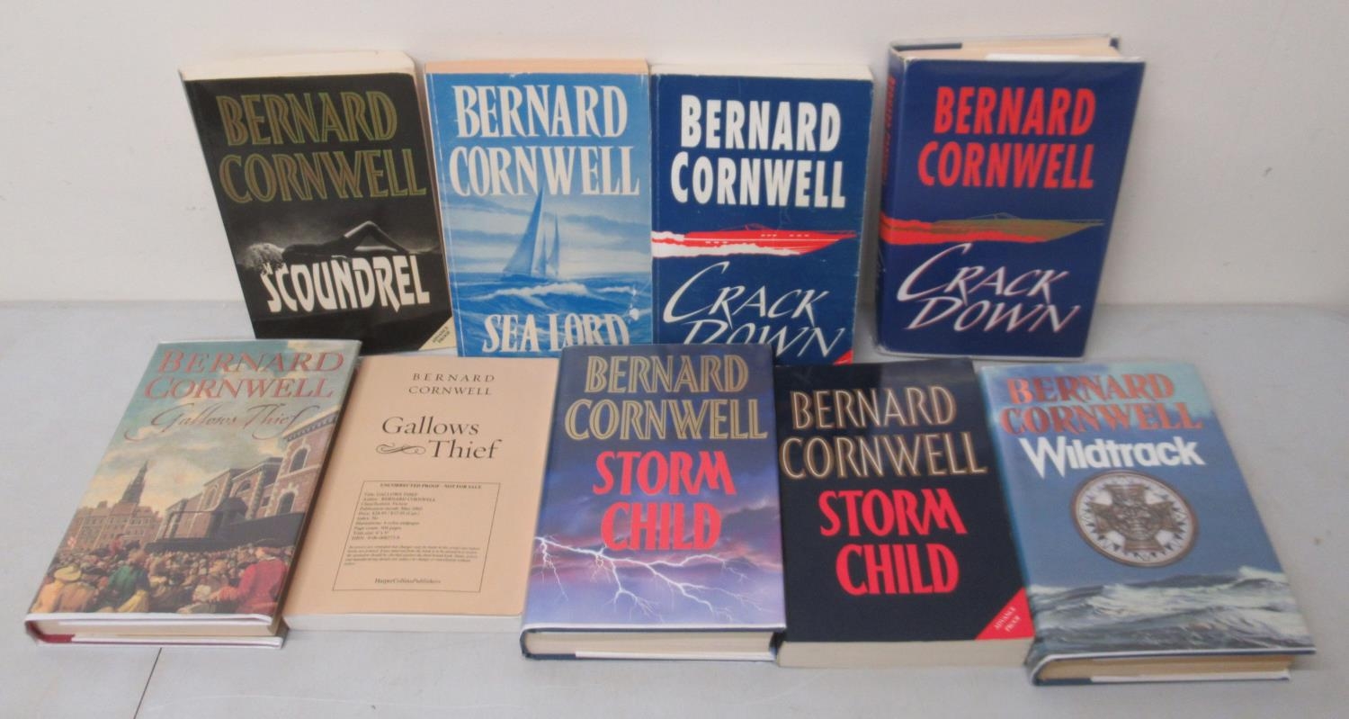 Bernard Cornwell - Scoundrel Advance Proof, Sea Lord 1st Edition 1989, Michael Joseph Signed by Author Paperback, Cerackdown Advance Proof, Crackdown 1st Edition 1990 Michael Joseph, hardback w/dust jacket, Gallows Thief, 1st Edition 2001 Harper Collins, hardback w/dust jacket, Gallows Thief Uncorrected Proof, Wildtrack 1st Edition 1988 Michael Joseph hardback w/dust jacket, Storm Child 1st Edition 1991 Michael Joseph, hardback w/dust jacket & Storm Child Advance Proof (9)