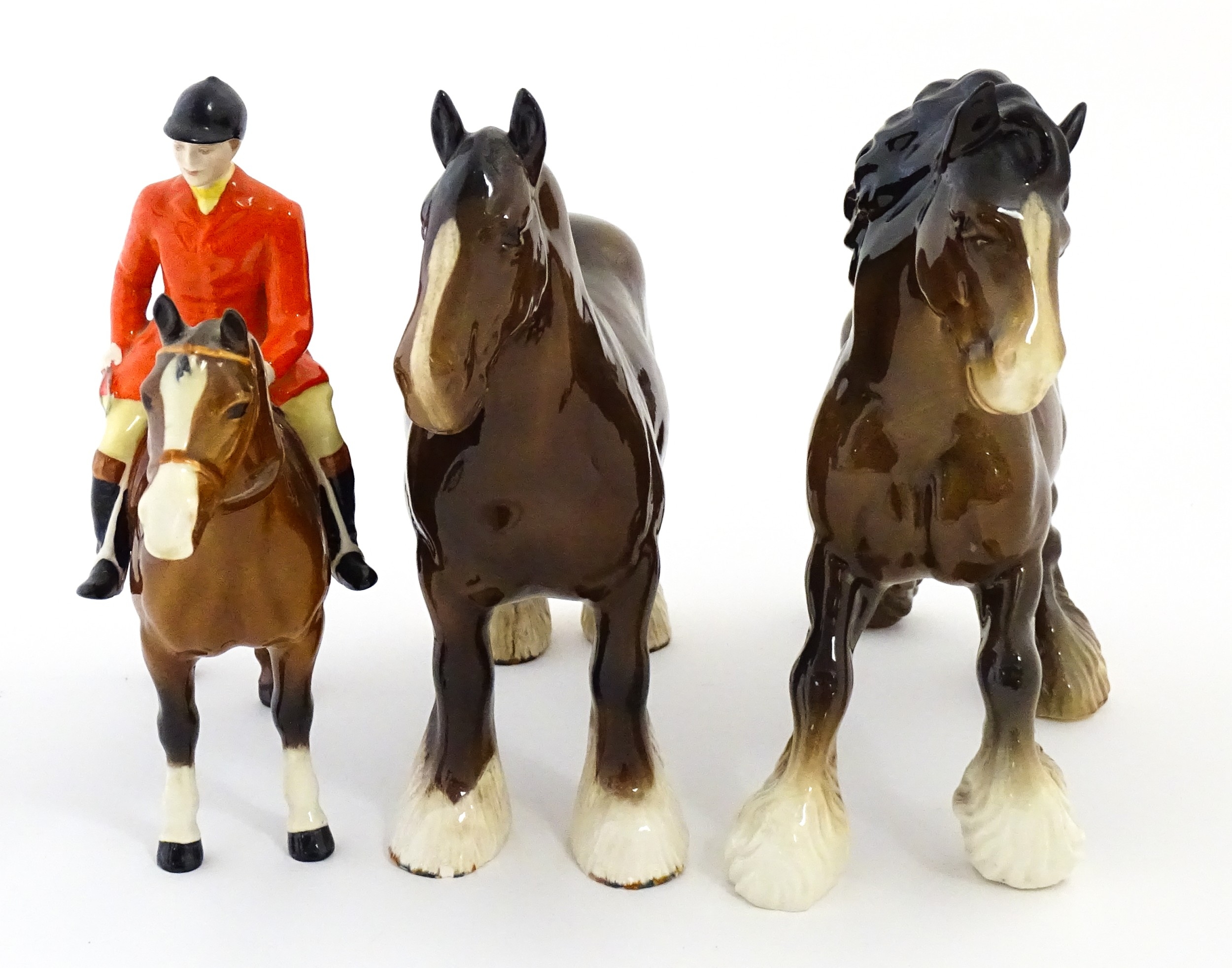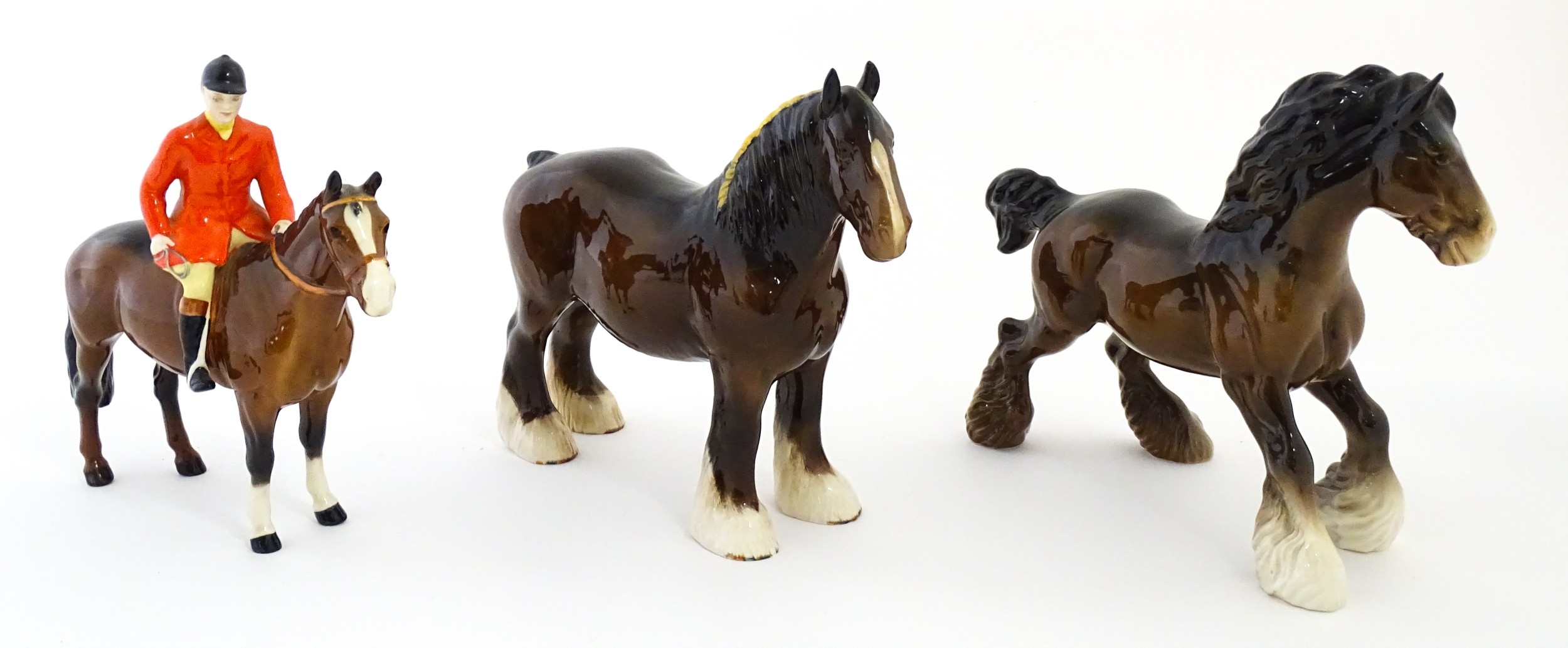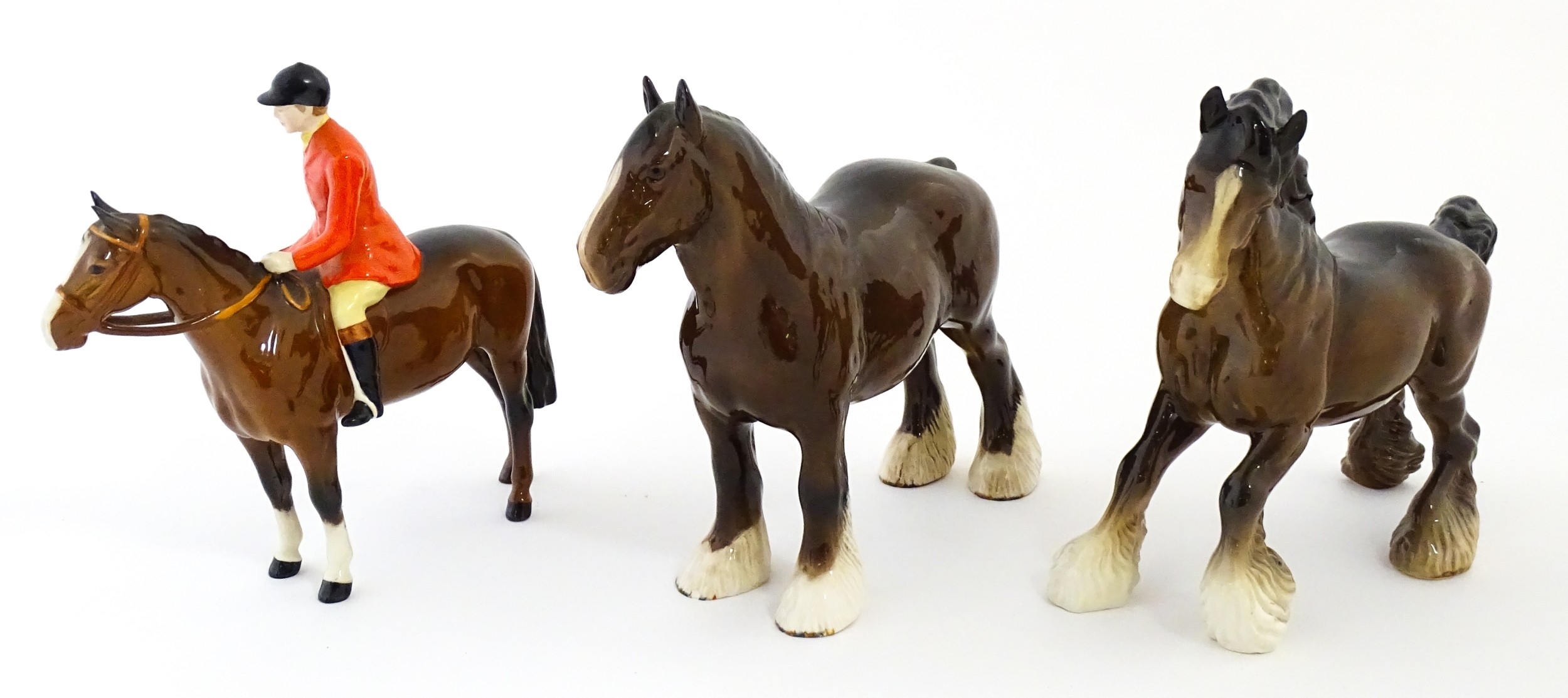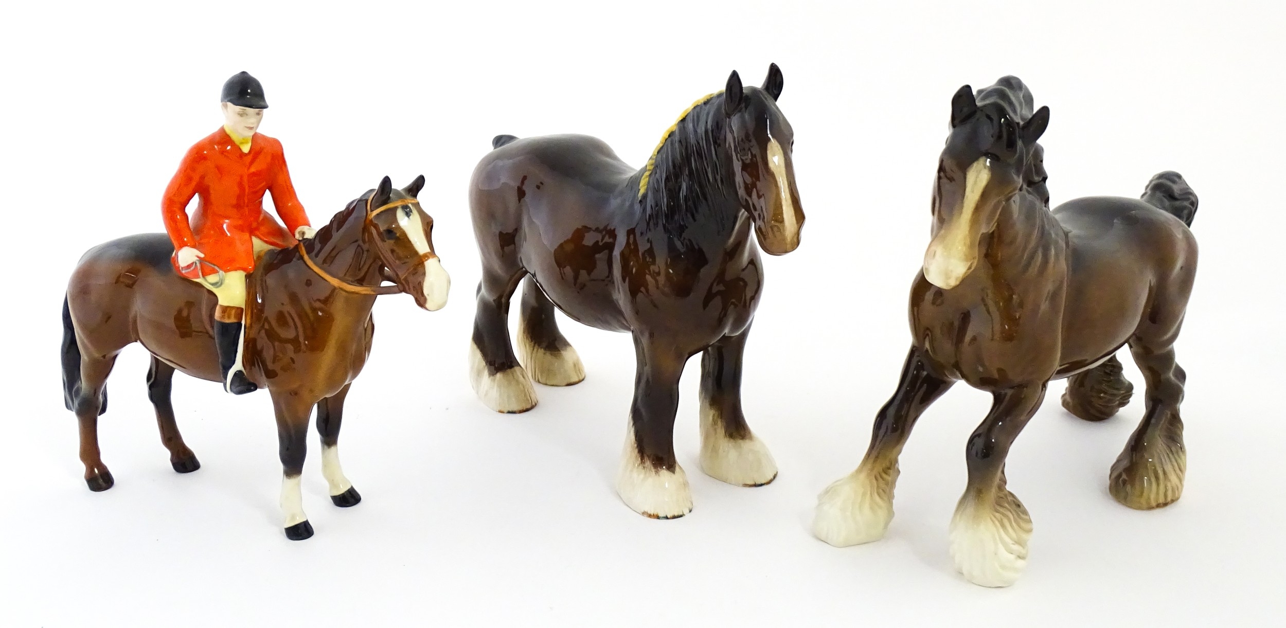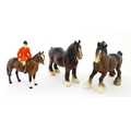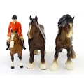 Three Beswick models of horses comprising Huntsman on a Brown Horse, Shire Horse, and Cantering Shire. Largest approx. 8 1/4" high (3)