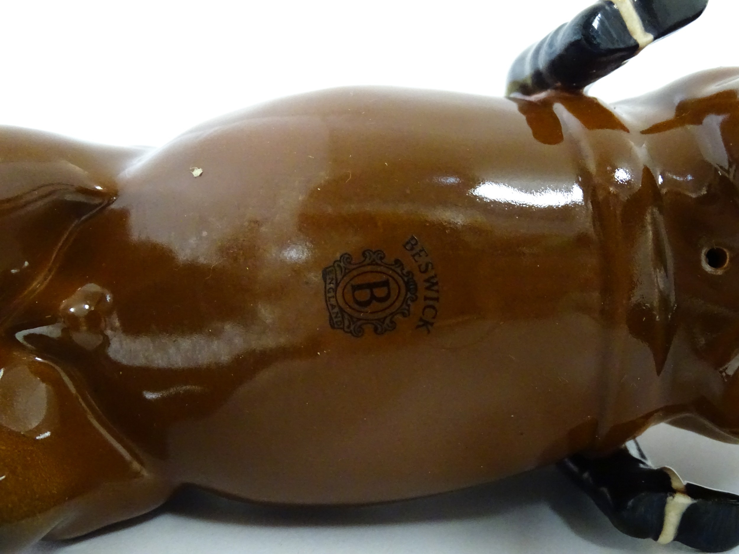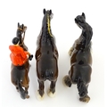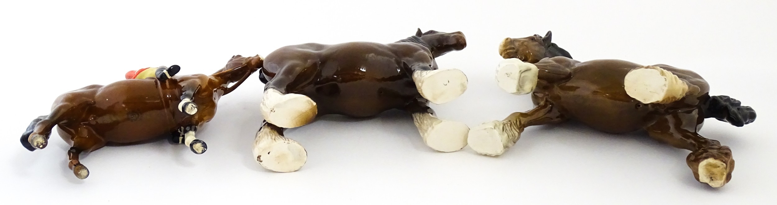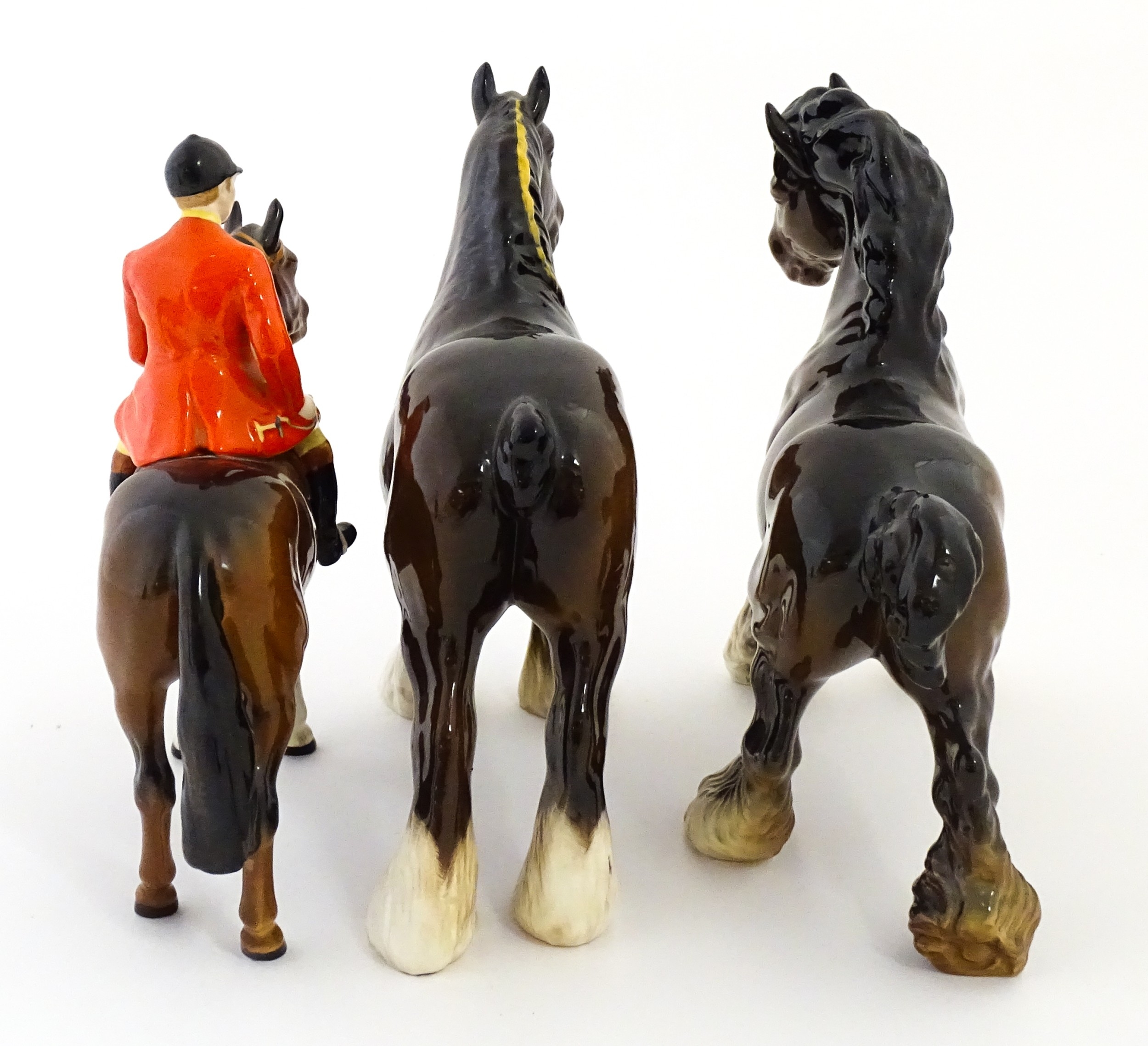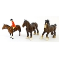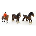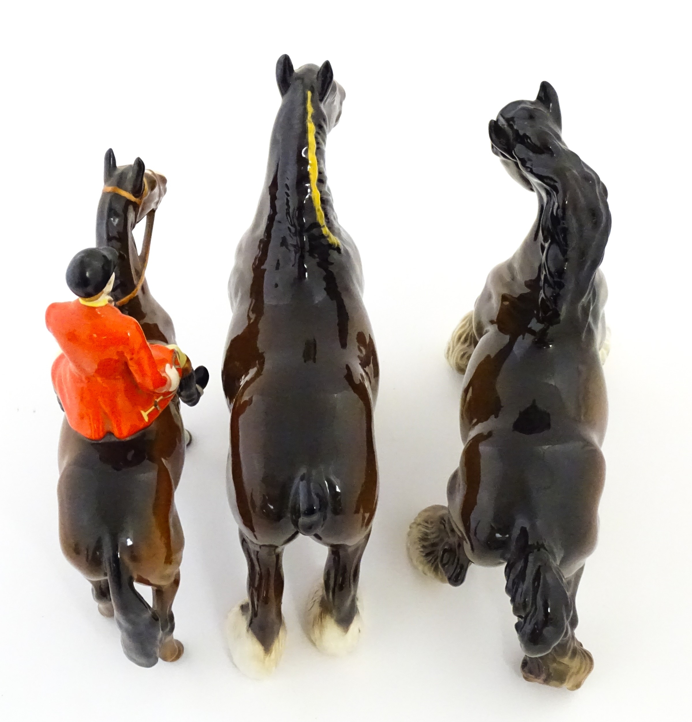 Three Beswick models of horses comprising Huntsman on a Brown Horse, Shire Horse, and Cantering Shire. Largest approx. 8 1/4" high (3)