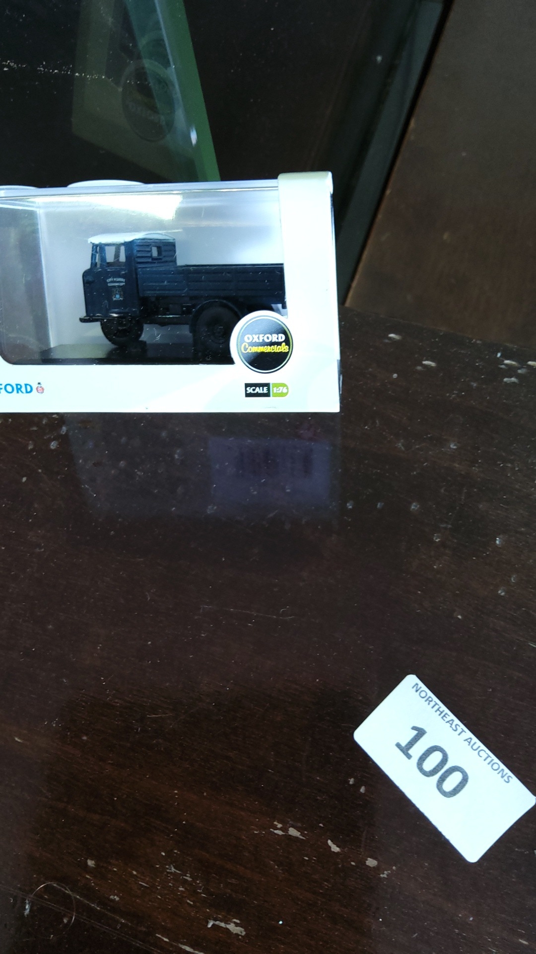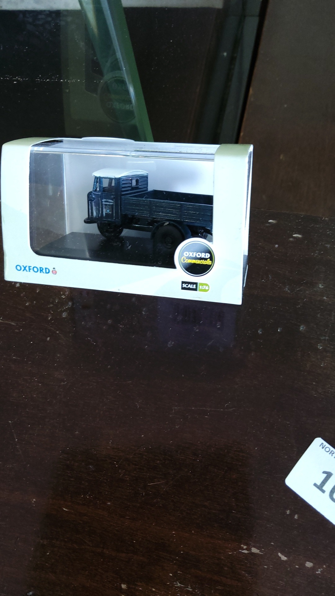 Boxed 1:76 scale die-cast model lorry by Oxford Diecast, ‘Oxford Commercials’ series, dark blue flatbed truck in clear display case with original sleeve.