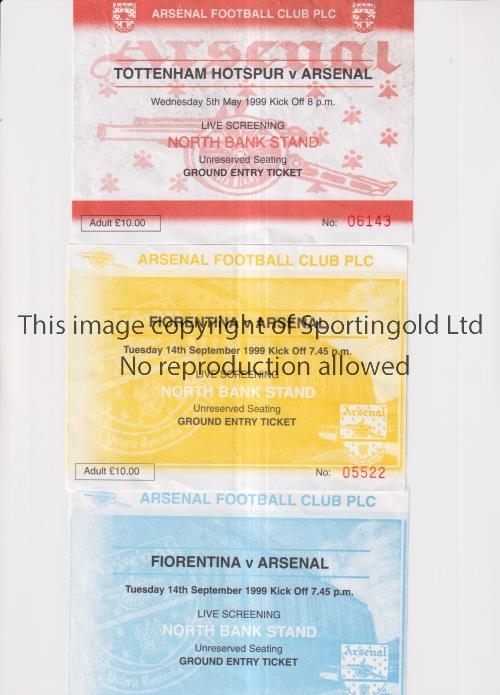 ARSENAL Three tickets for away Live Screening matches at Highbury v Tottenham Hotspur 5/5/1999 and 2 v Fiorentina 14/9/1999, adult and child. Generally good