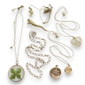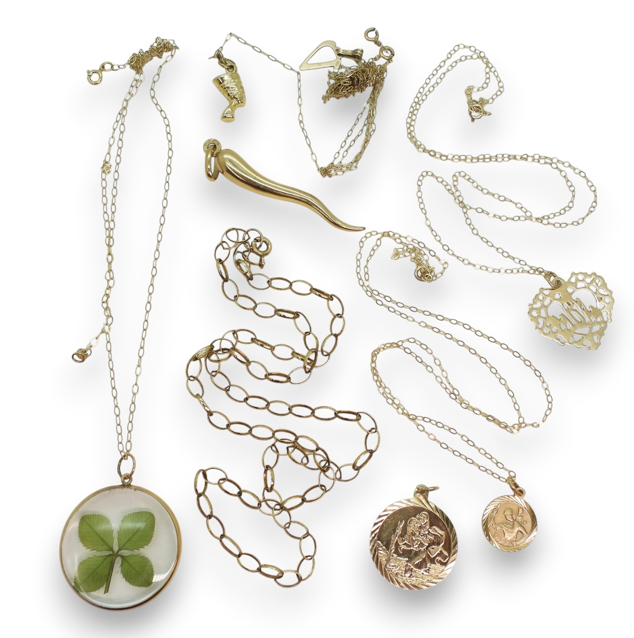 A tangled knot of two chains, both clasps stamped 9k, with 9ct gold Nefertiti and V pendants, further 9ct items;- two St. Christopher's, a horn of plenty, four chains, weight of all these items together 9.6gms, further yellow metal MUM pendant weight 0.4gms, yellow metal mounted mainly glass shamrock pendant weight 2.7gms