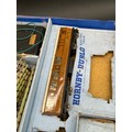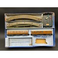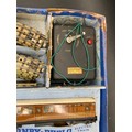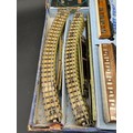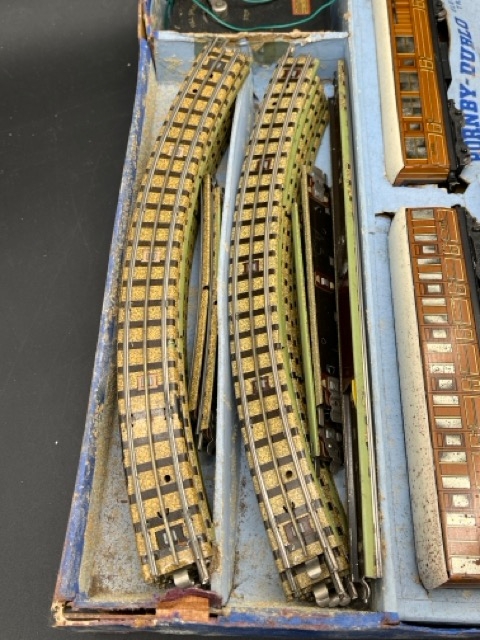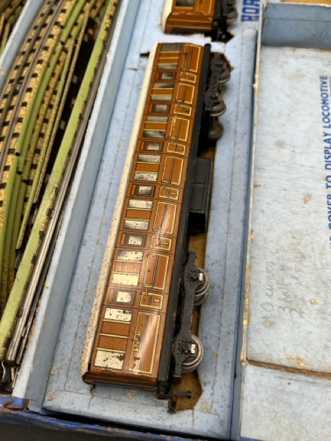 includes two LNER tin-plate teak coaches, quantity of 3-Rail track (showing green paint) and controller (not tested)