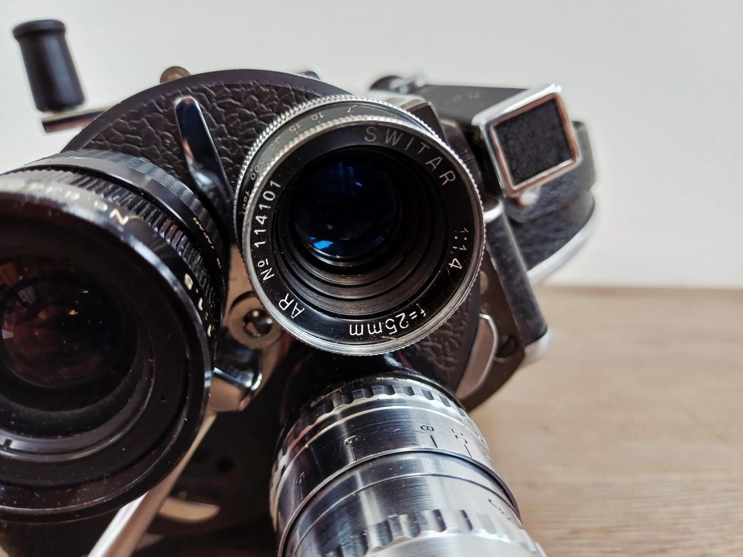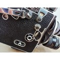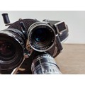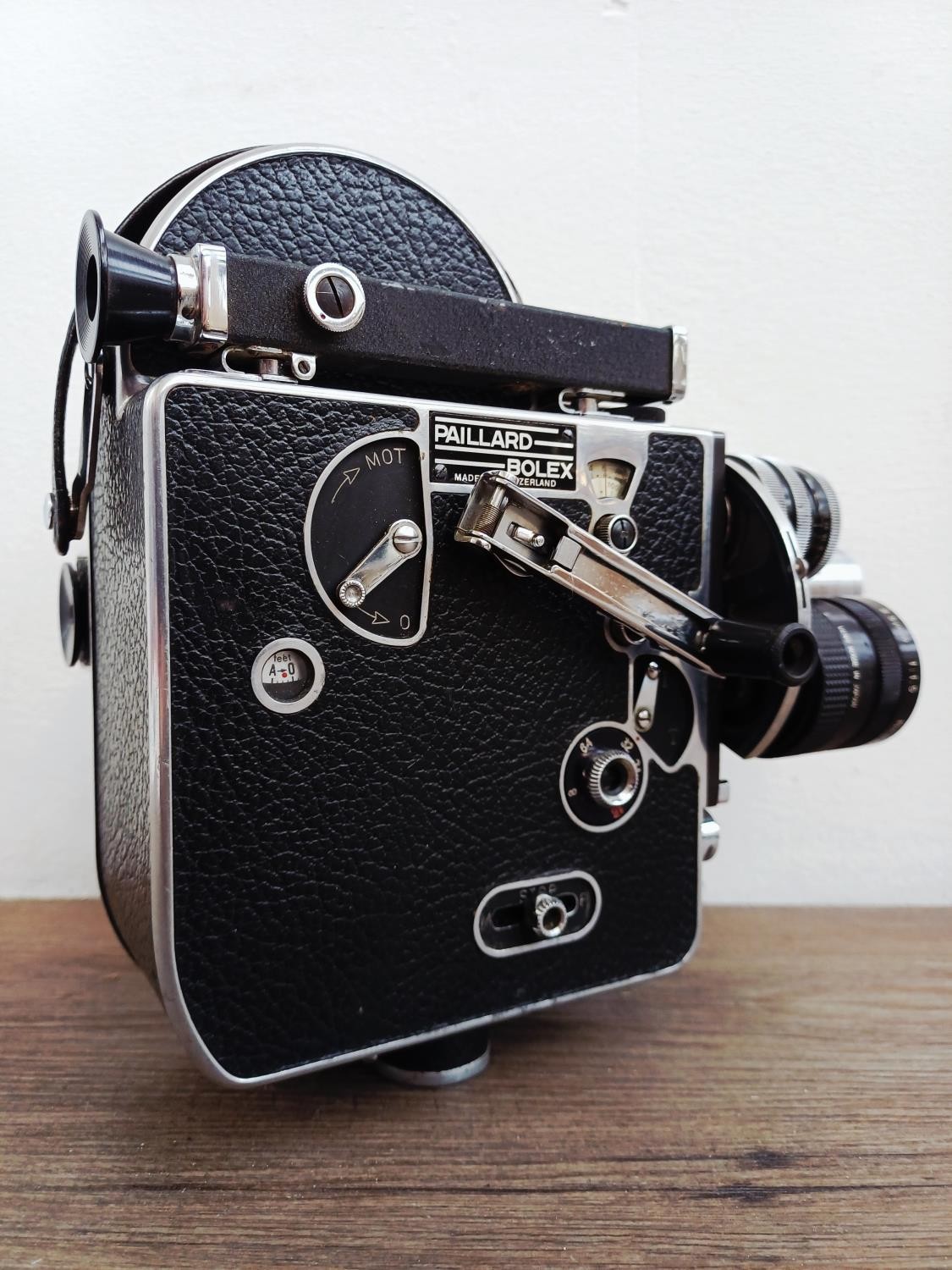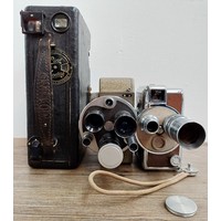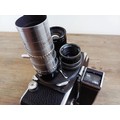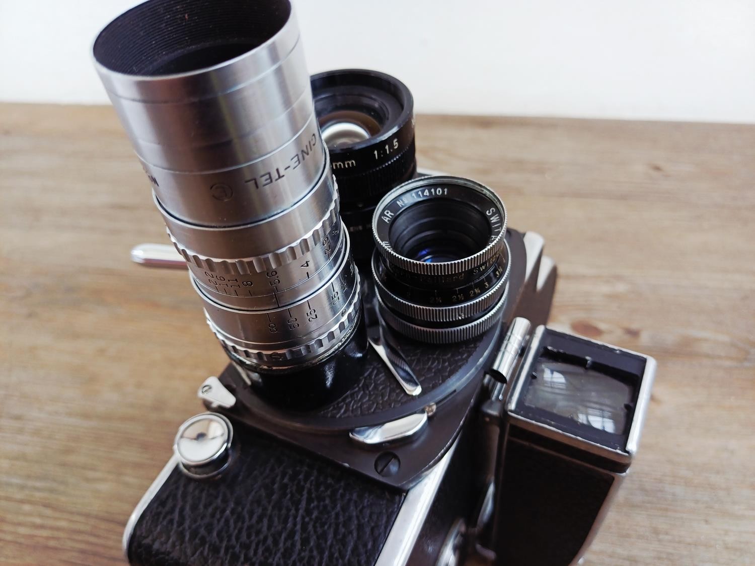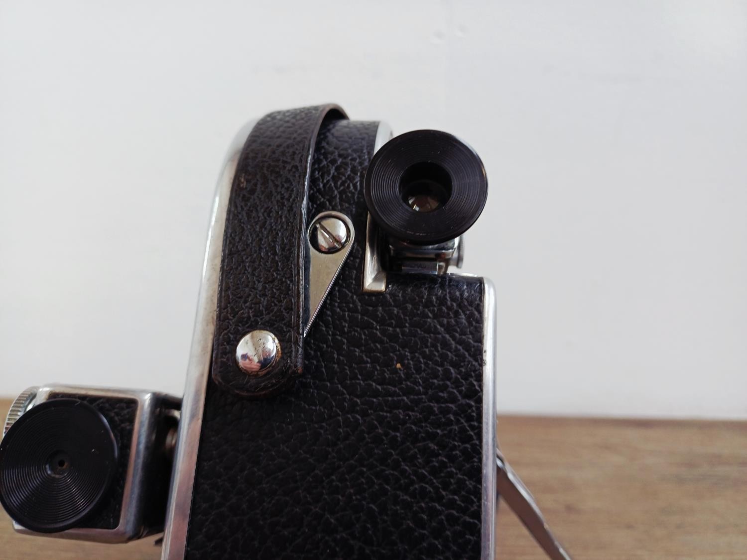 A c.1957 Paillard Bolex H16 Supreme 16mm cine camera with lens turret fitted with Cosmicar Television 1:1.5 8.5mm, Switar AR 1:1.4 25mm and Elgeet Cine-Tel 1:2.9 3" lenses