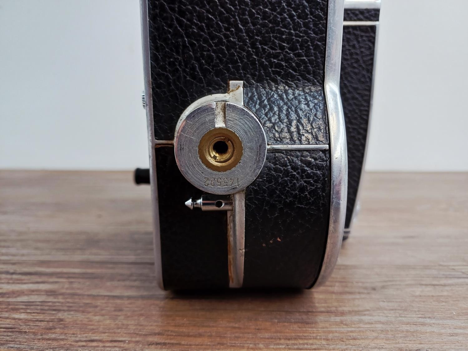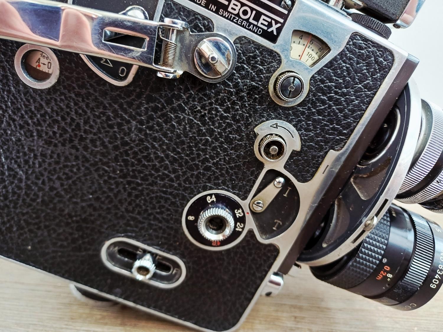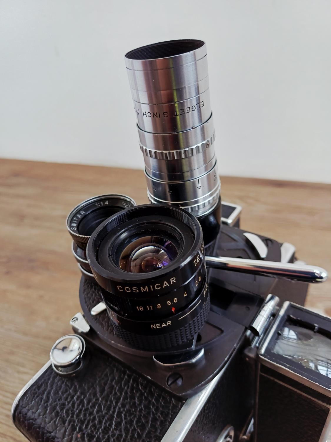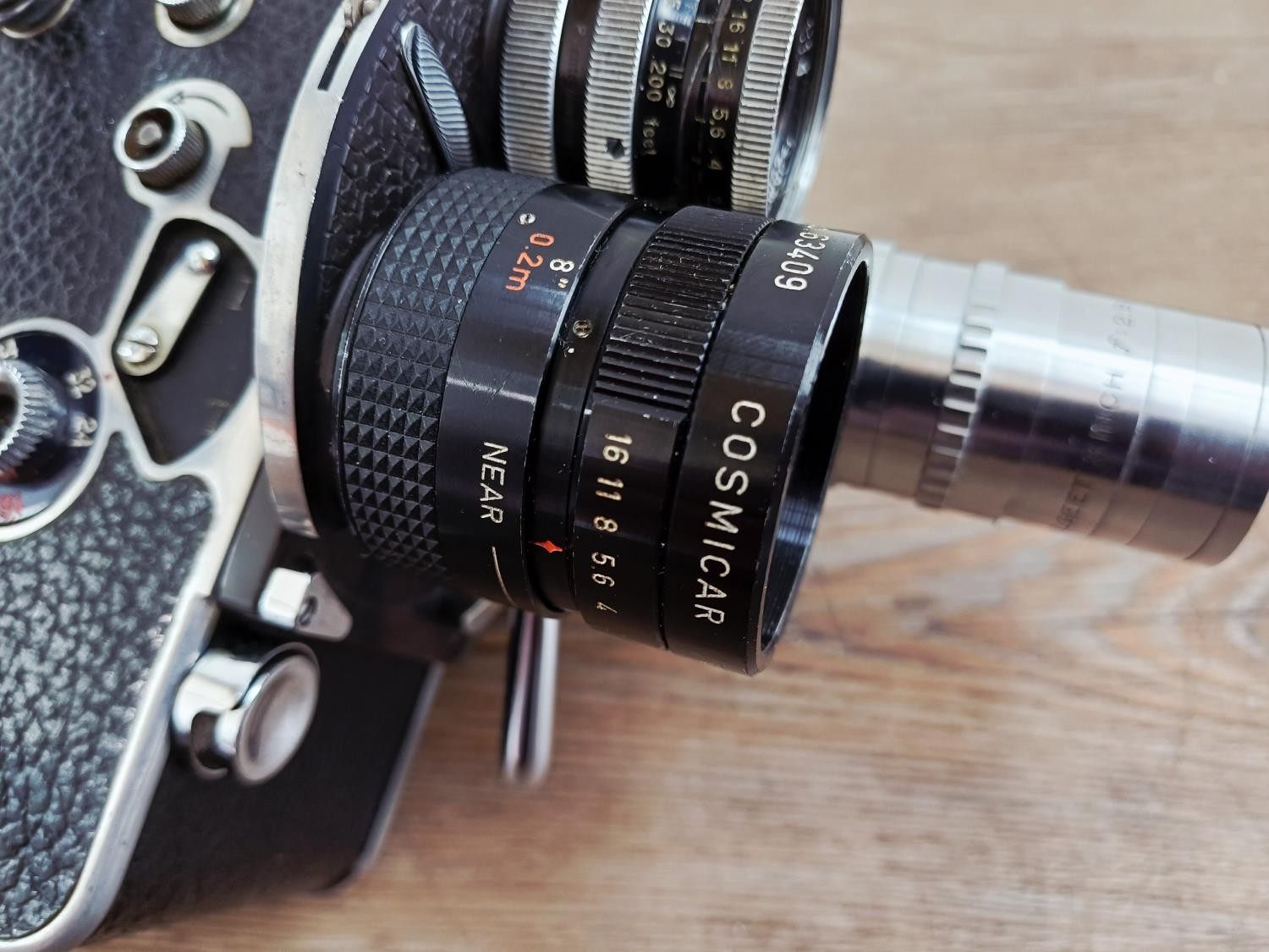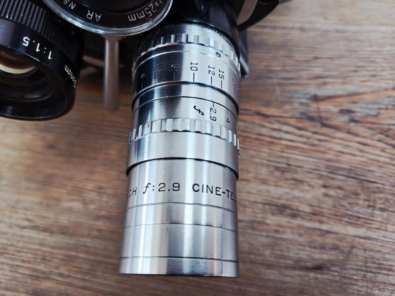 A c.1957 Paillard Bolex H16 Supreme 16mm cine camera with lens turret fitted with Cosmicar Television 1:1.5 8.5mm, Switar AR 1:1.4 25mm and Elgeet Cine-Tel 1:2.9 3" lenses