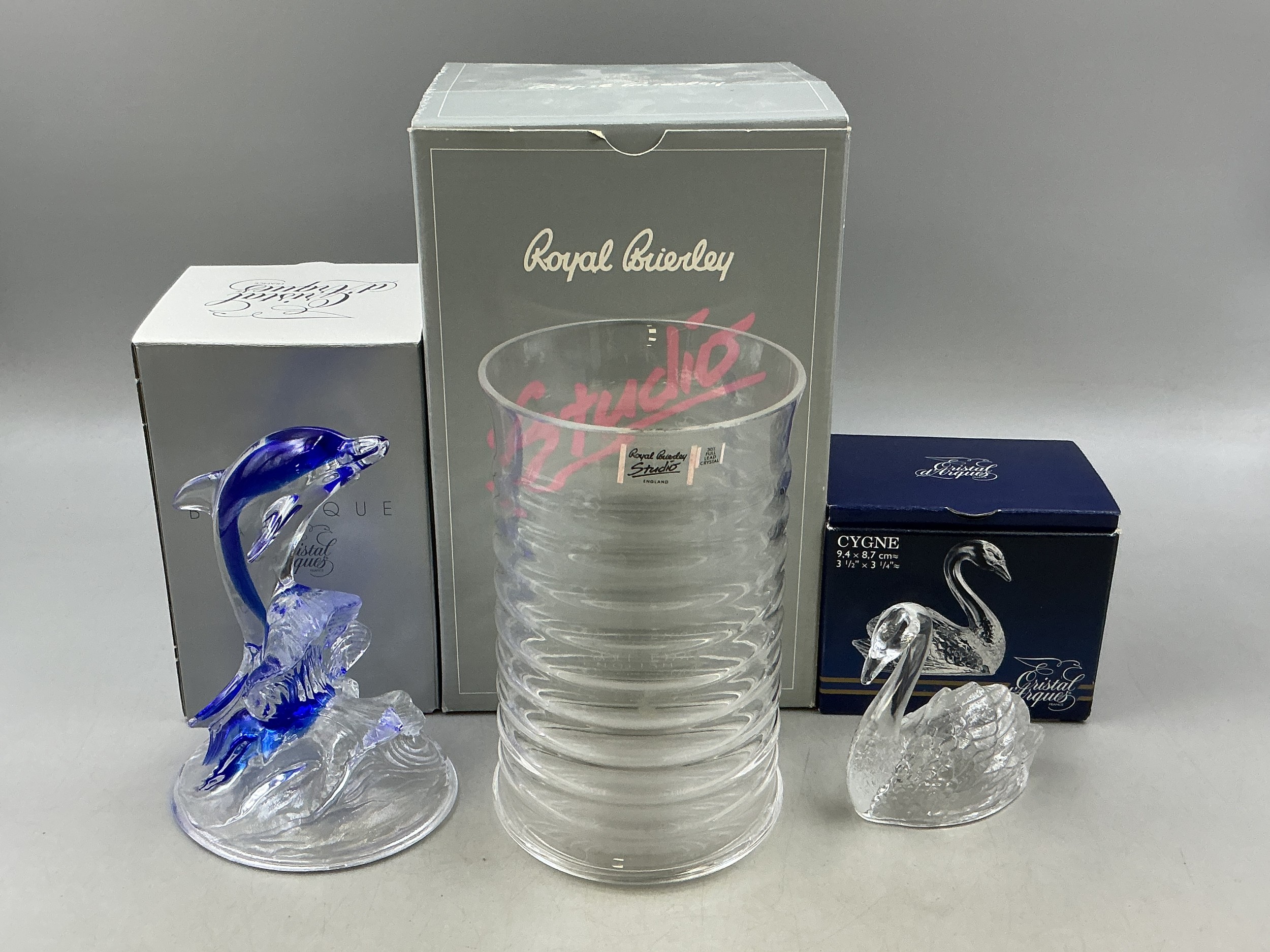 Cristal d'Arques Dolphin and Swan Figures and a Royal Brierley Studio Informal Shaped Vase (All Boxed)