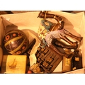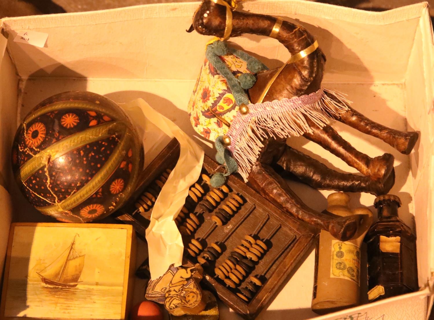 Box of mixed collectables including an abacus. Not available for in-house P&P