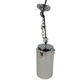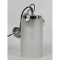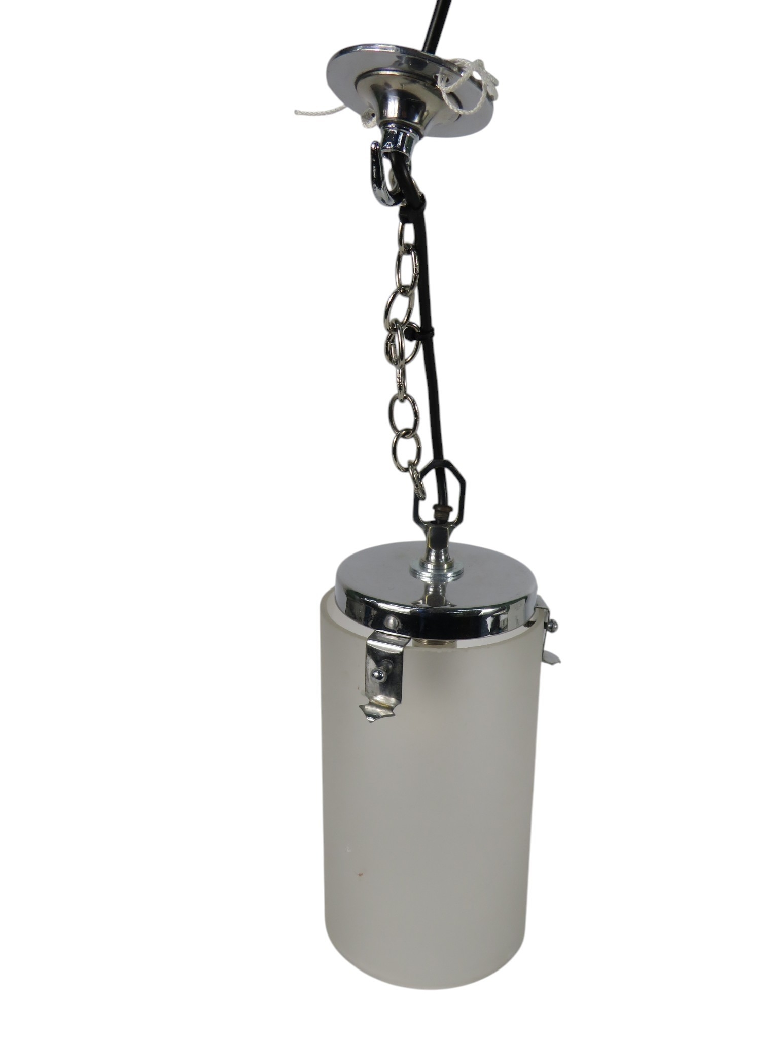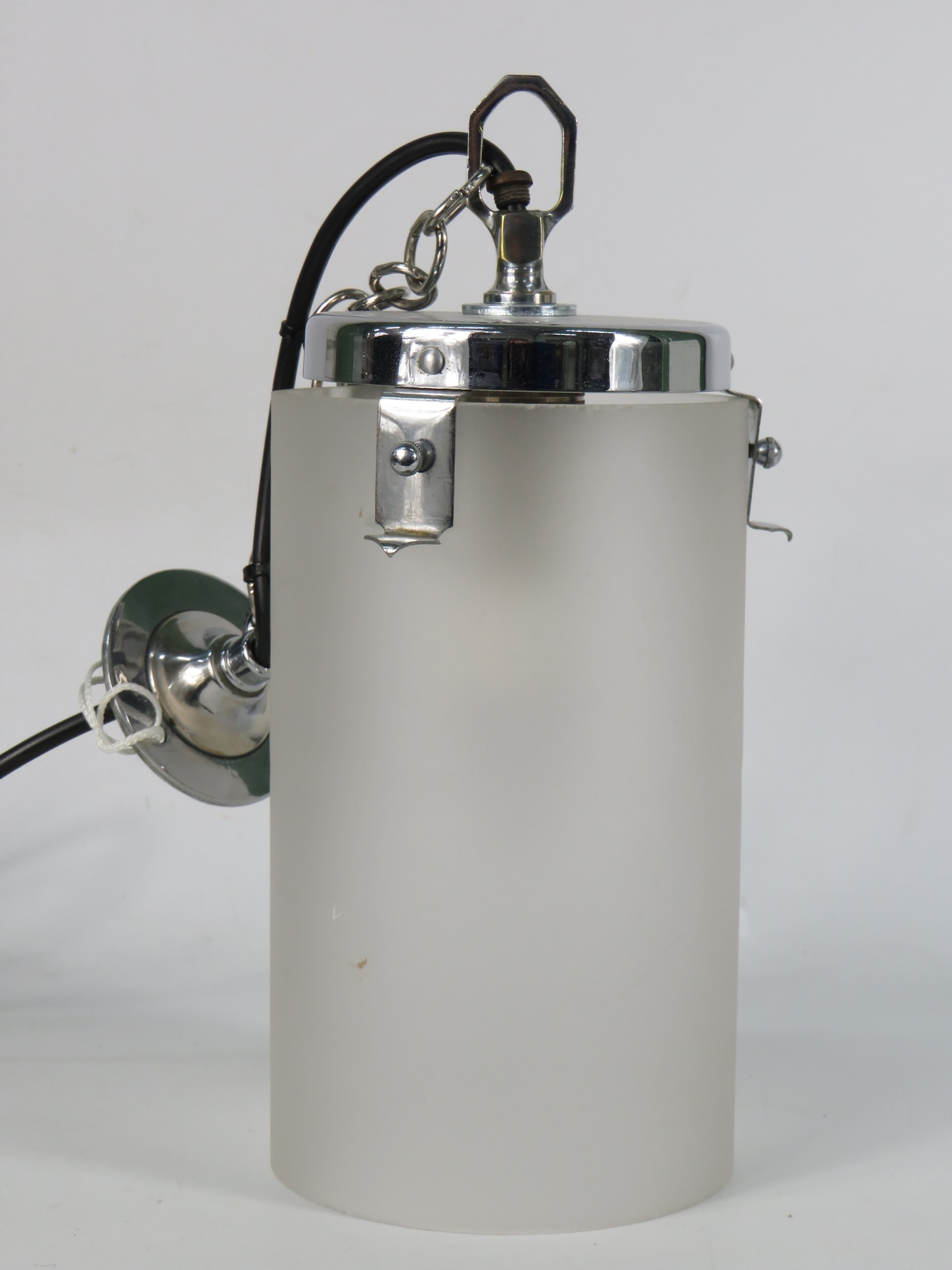 A frosted glass and chrome pendant light fixture of cylindrical form with polished chrome mount and suspension chain retaining original fittings Height 44 cm including chain